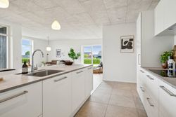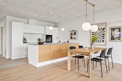 Det velindrettede køkken/alrum og stue byder på smukke og lyse materialer samt inventar fra Svane