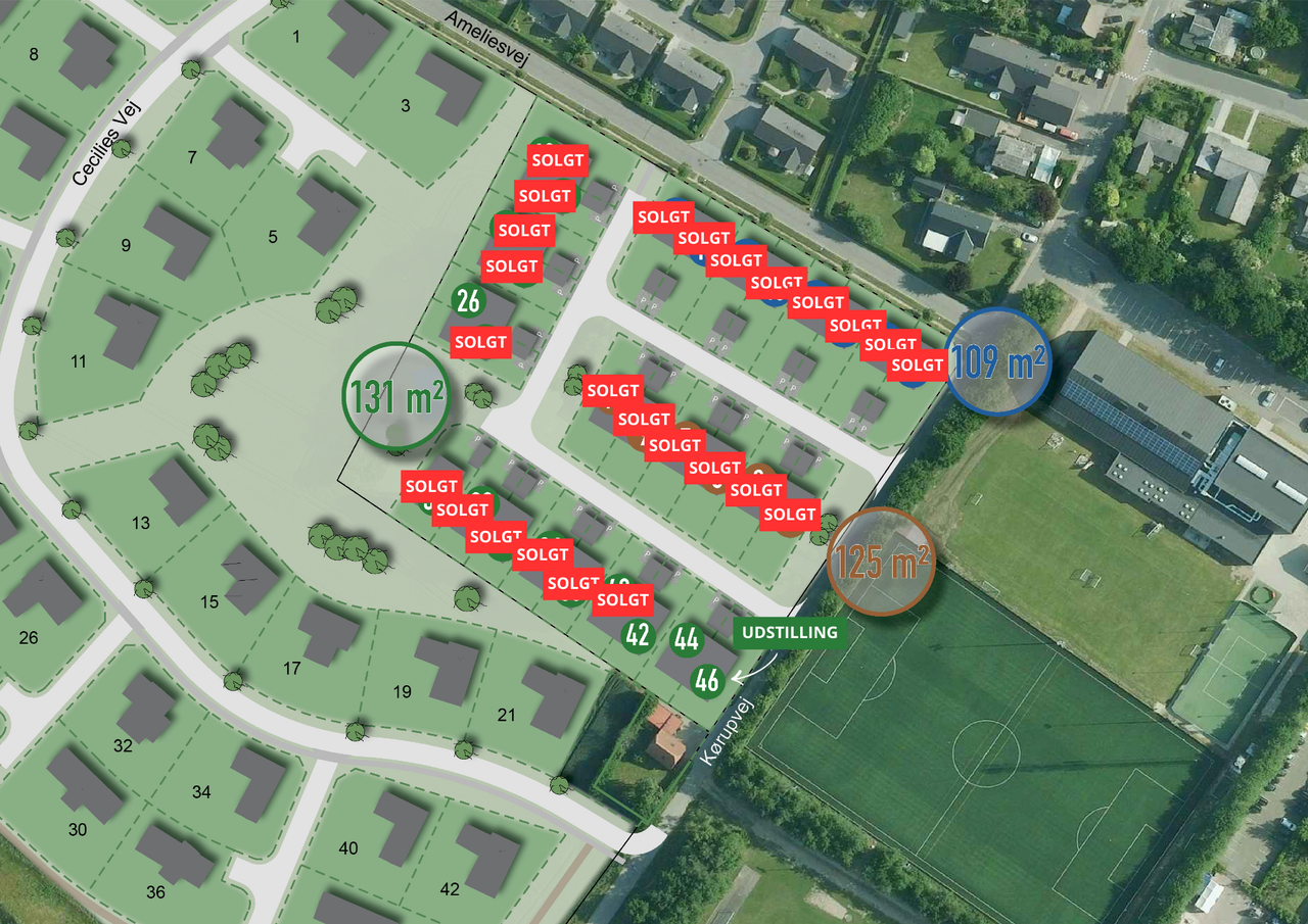 på 125 m2, 14 rækkehuse på 131 m2 samt 1 fritstående bolig på 131 m2.