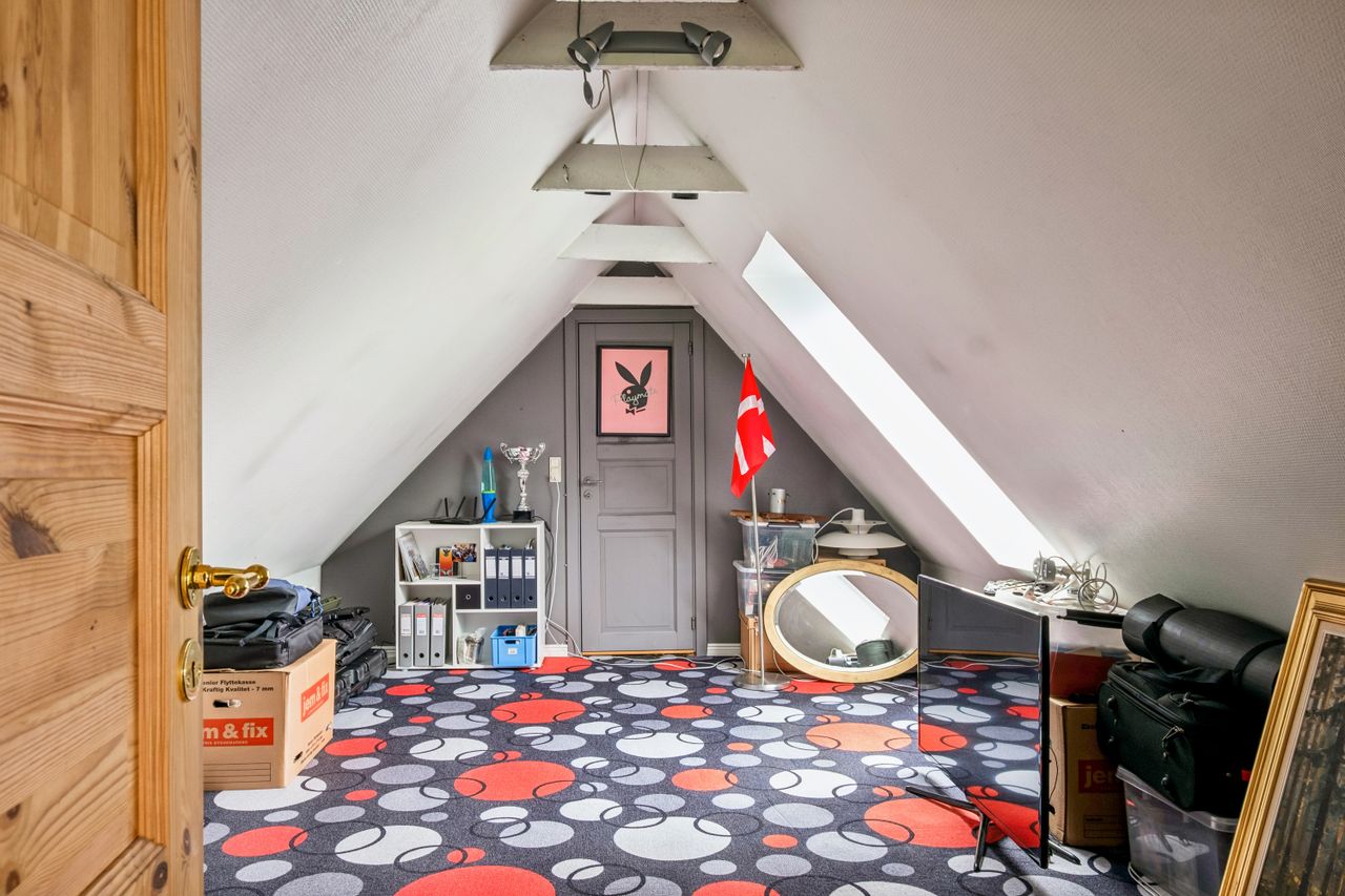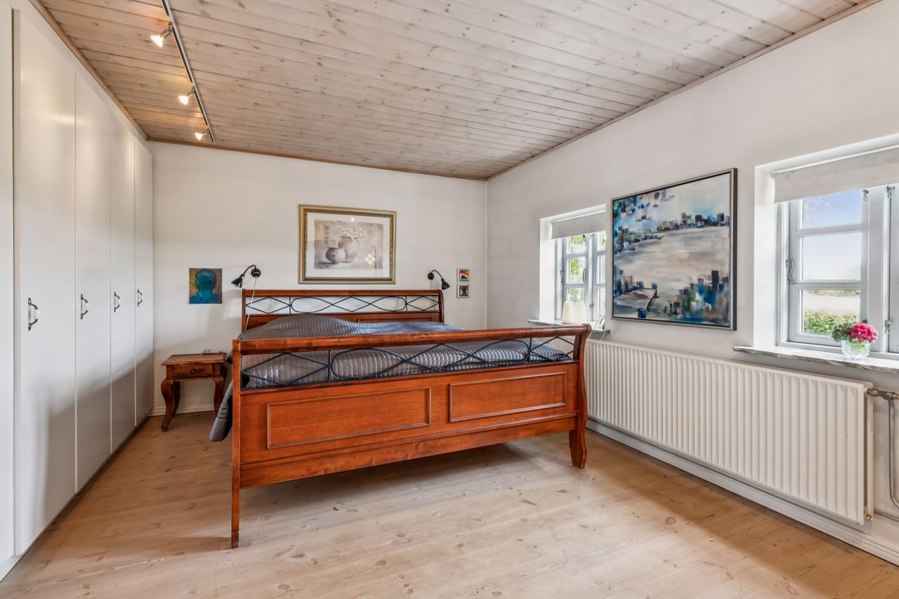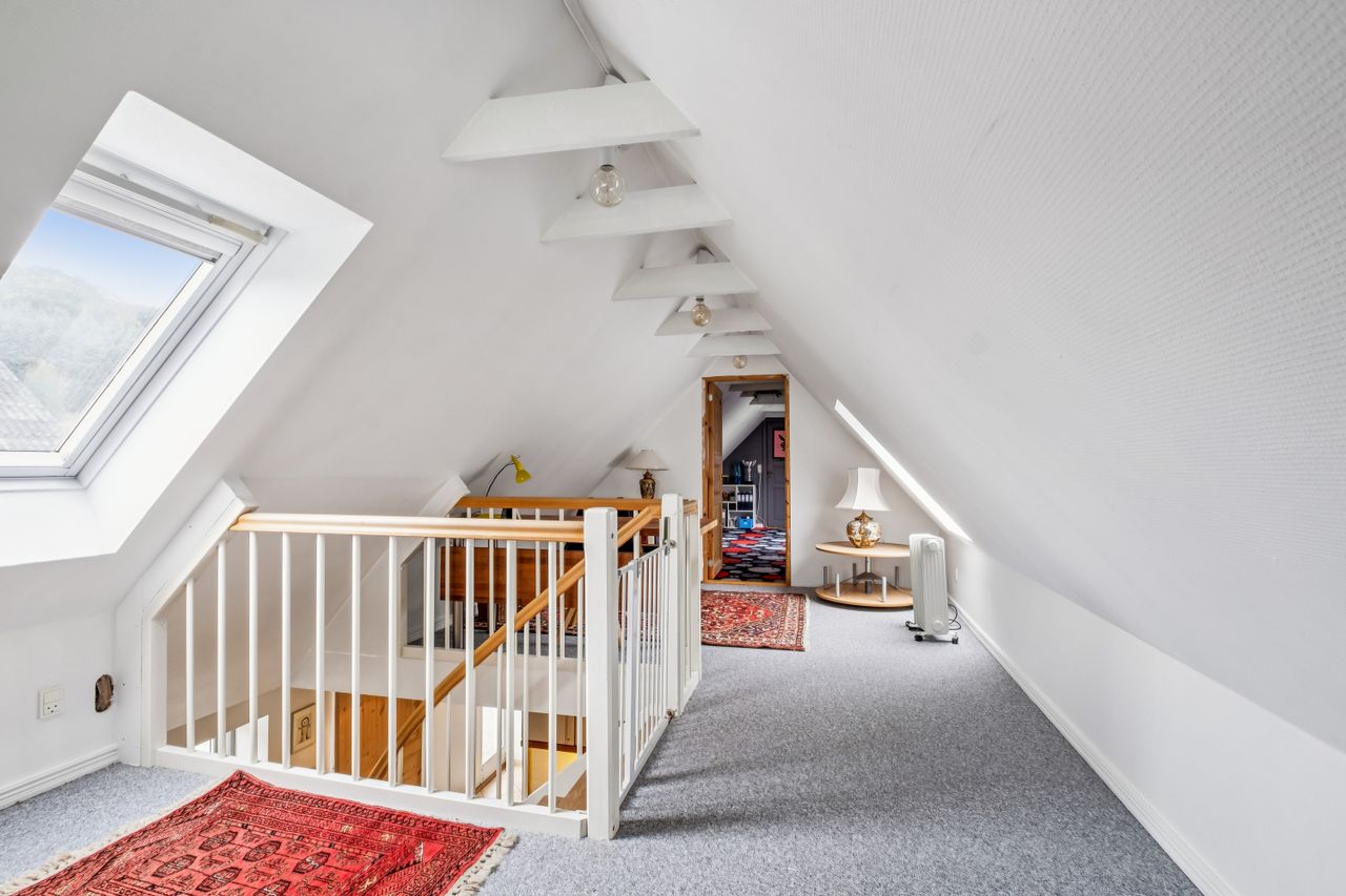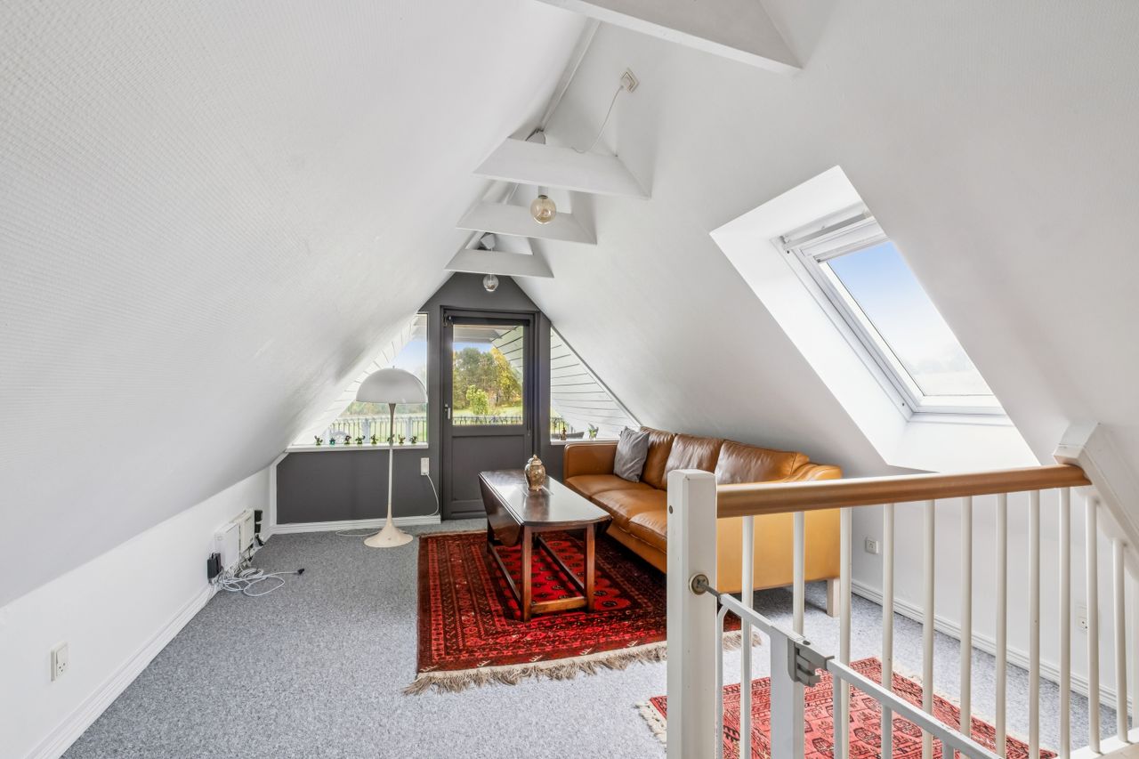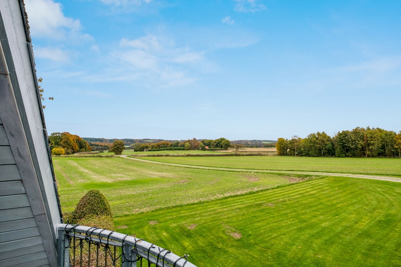Fra trappen i bryggerset føres du op til stuen på 1. sal, hvorfra der er udgang til en altan med en enestående udsigt over landskabet. Her finder du også et værelse samt et større loftrum, som efter behov kan inddrages til yderligere boligareal.