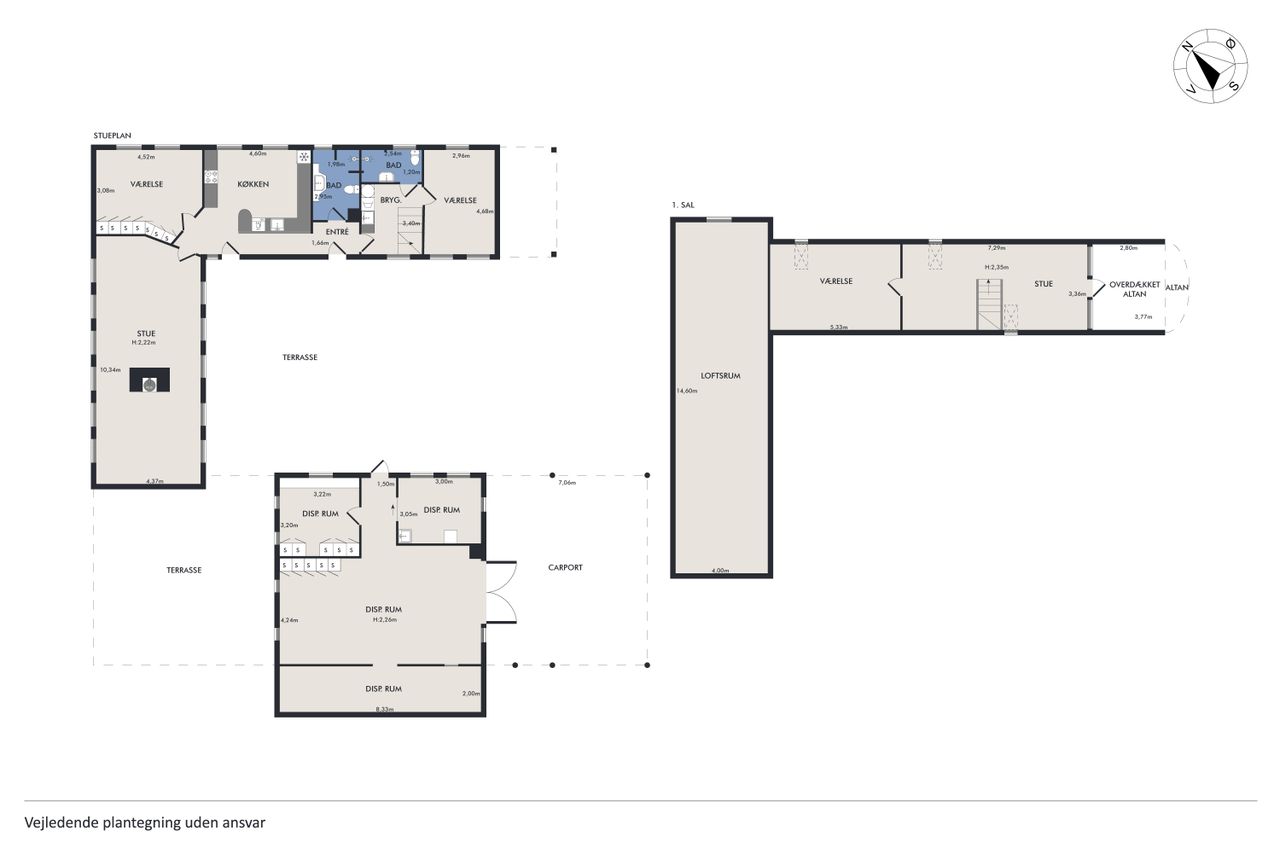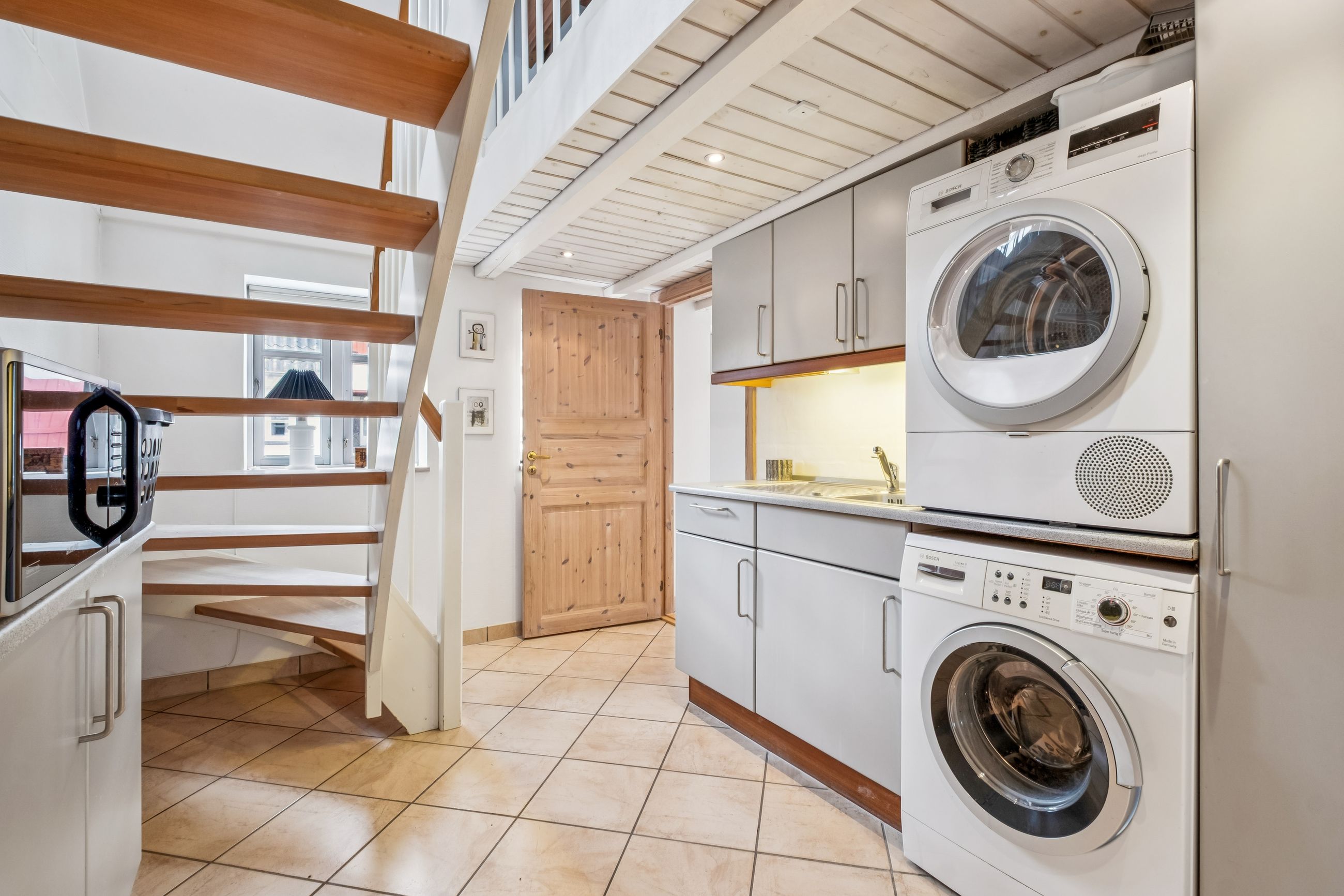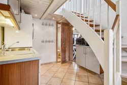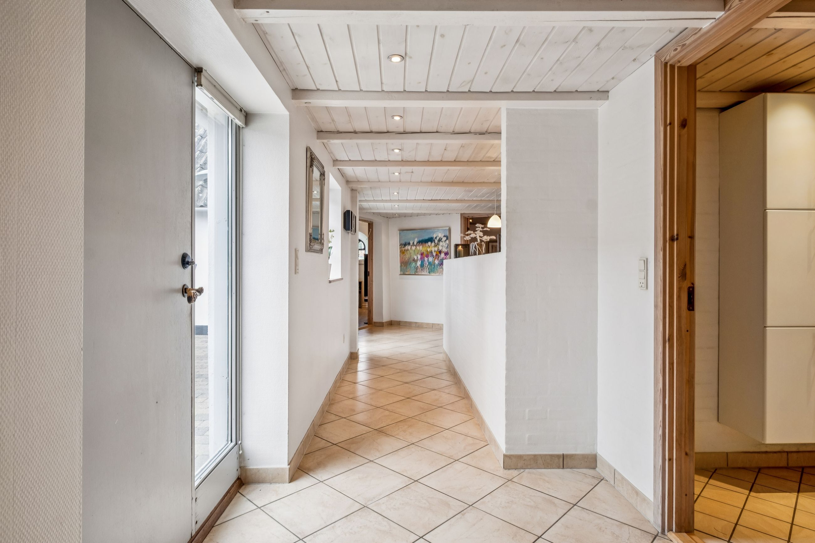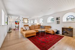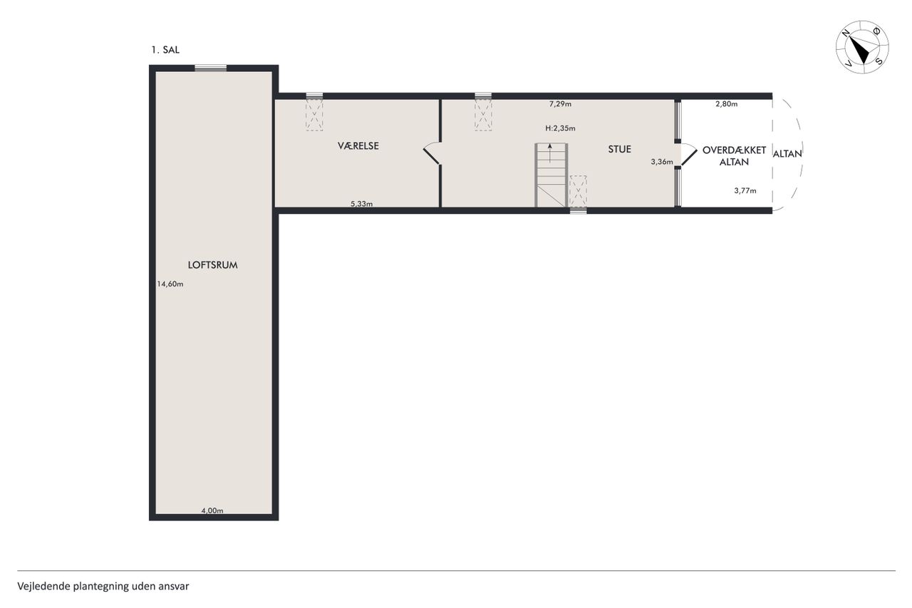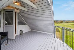Fra trappen i bryggerset føres du op til stuen på 1. sal, hvorfra der er udgang til en altan med en enestående udsigt over landskabet. Her finder du også et værelse samt et større loftrum, som efter behov kan inddrages til yderligere boligareal.