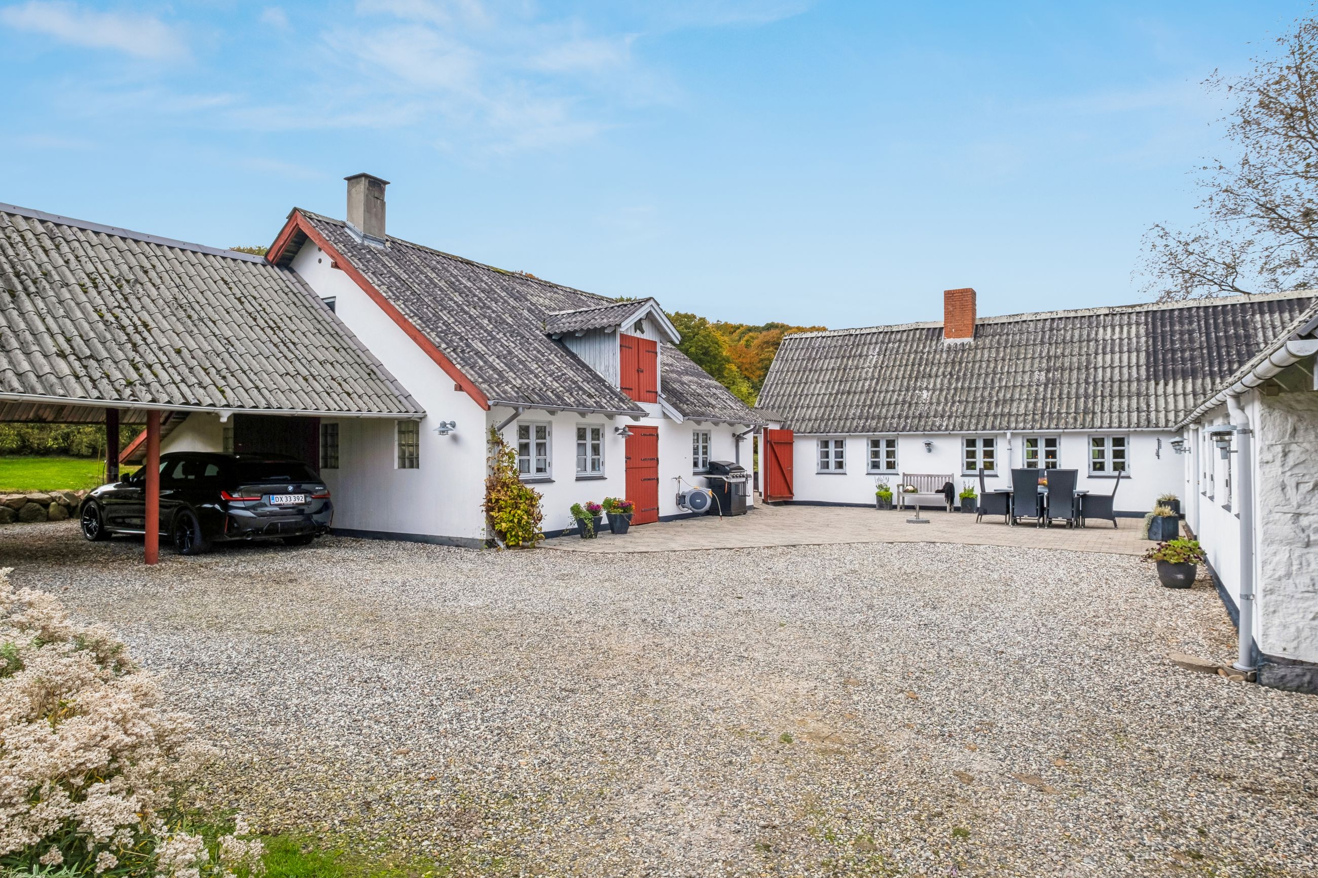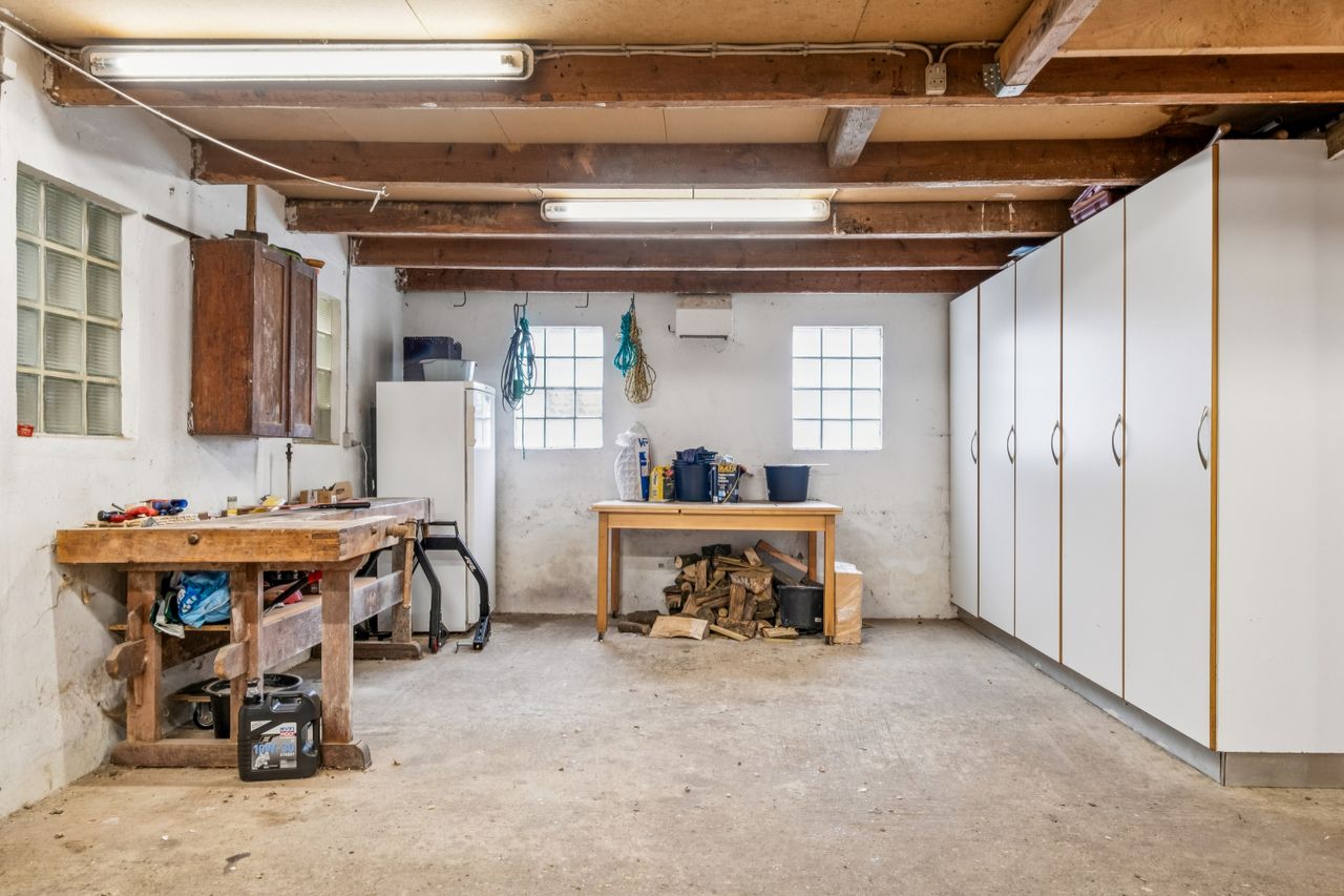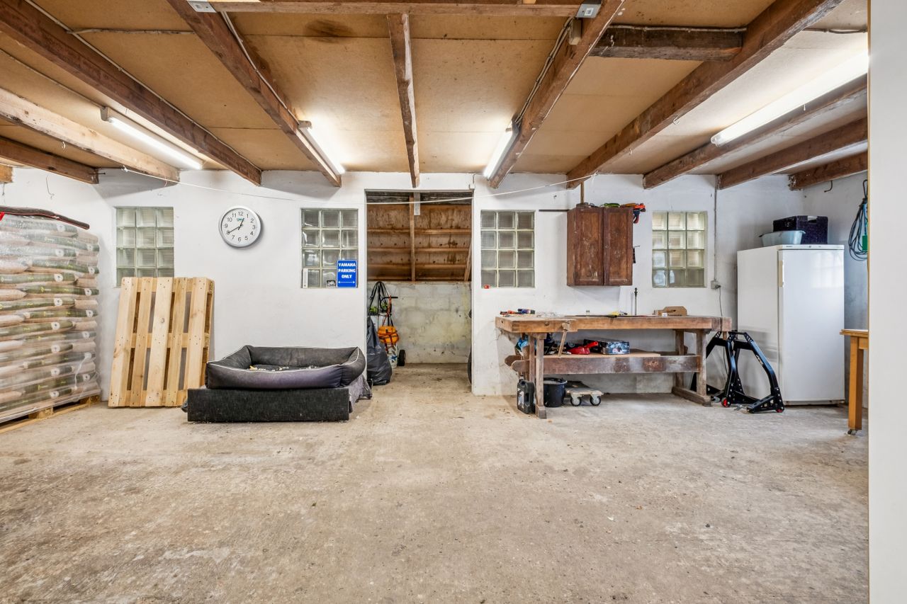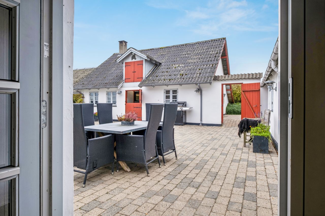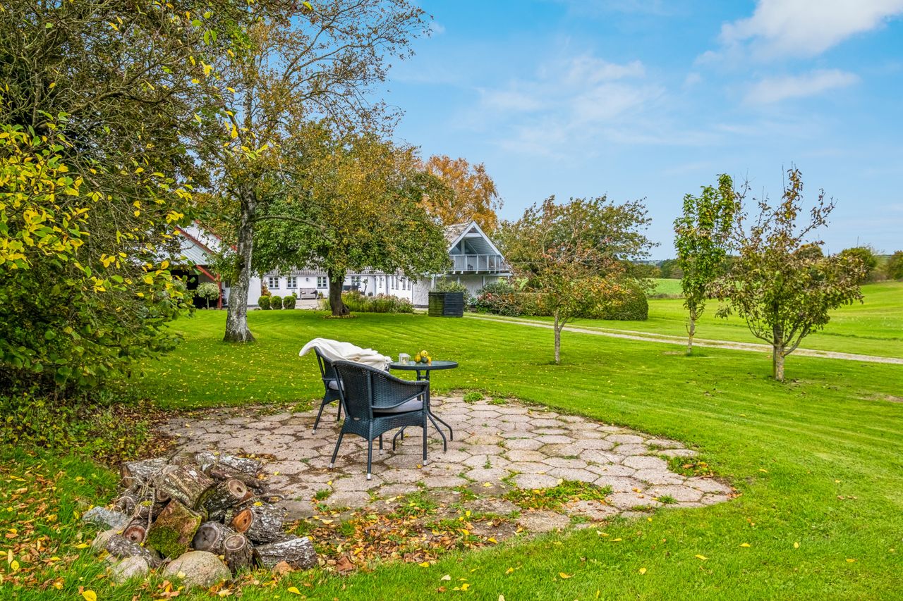 Haven er en grøn oase med æbletræer, kirsebær, pærer, nødder og mirabelle – perfekt til den naturglade familie. På den store terrasse kan du nyde solen og udsigten, mens du lytter til fuglesang og mærker roen sænke sig. Ejendommen byder desuden på en pæn gårdsplads, et udhus på 95 m2, heraf 45 m2 carport, så der er masser af plads til både opbevaring og hobbyliv.