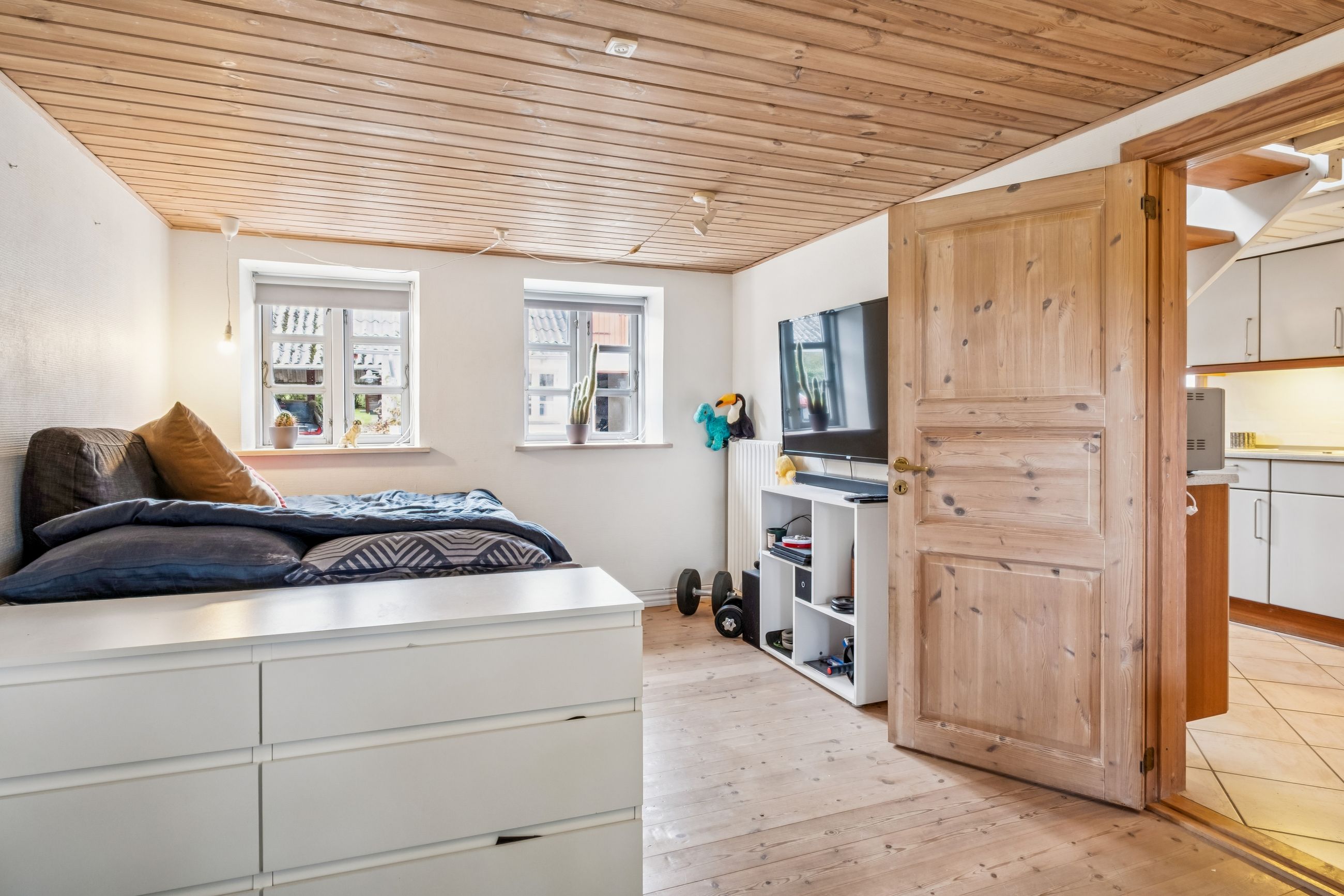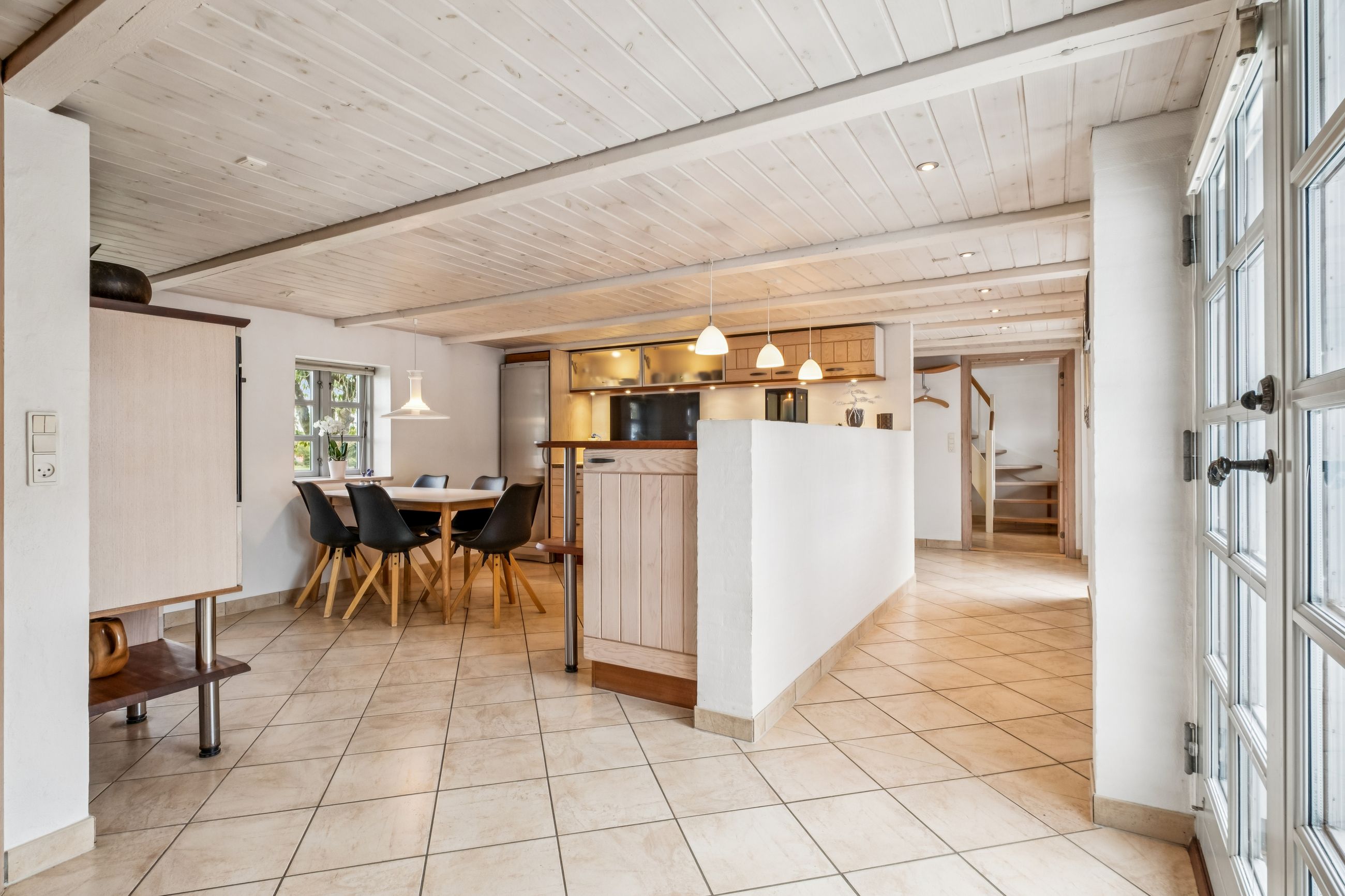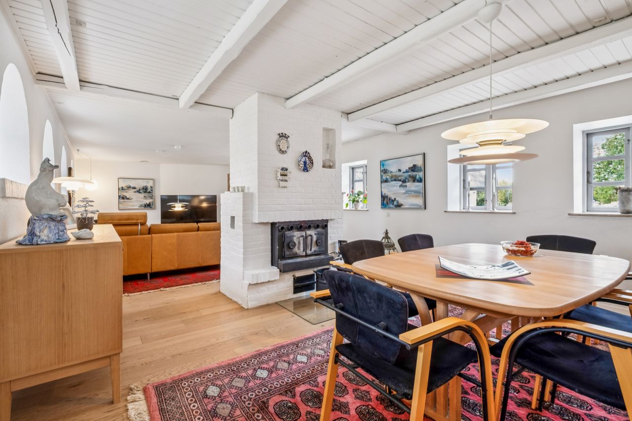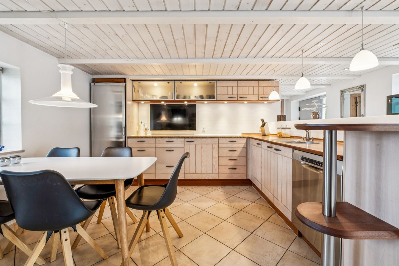 Når du træder indenfor, mødes du af en indbydende entré i åben forbindelse med det skønne køkken/alrum fra Modulia med gulvvarme i klinkerne. Her er god plads til både madlavning og samvær, og i forlængelse heraf finder du den lyse alrum/stue, som imponerer med sine synlige loftsbjælker, fede egetræs plankegulve, charmerende vinduespartier og en indmuret pejs, der spreder varme og stemning i de kolde måneder. Boligen rummer i stueplan desuden to badeværelser med gulvvarme, et soveværelse, et praktisk bryggers fra Modulia ligeledes med gulvvarme samt et stort værelse, der nemt kan opdeles, hvis du har brug for et ekstra rum.