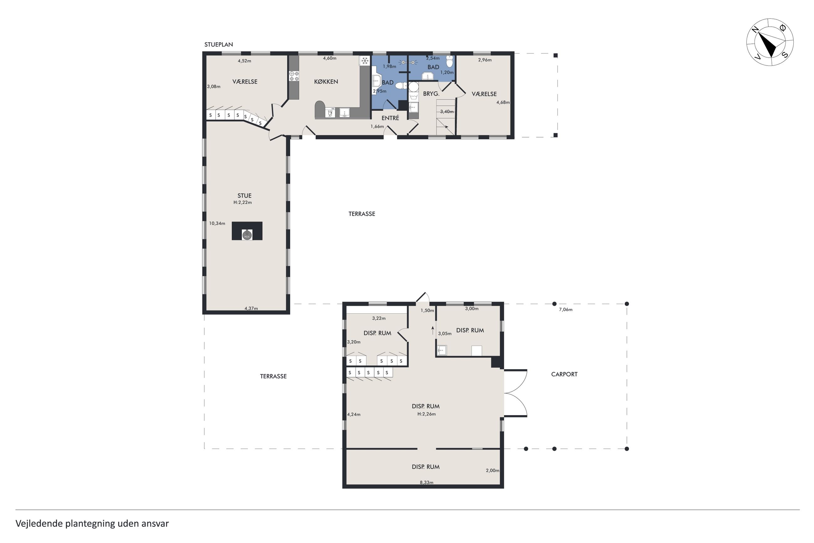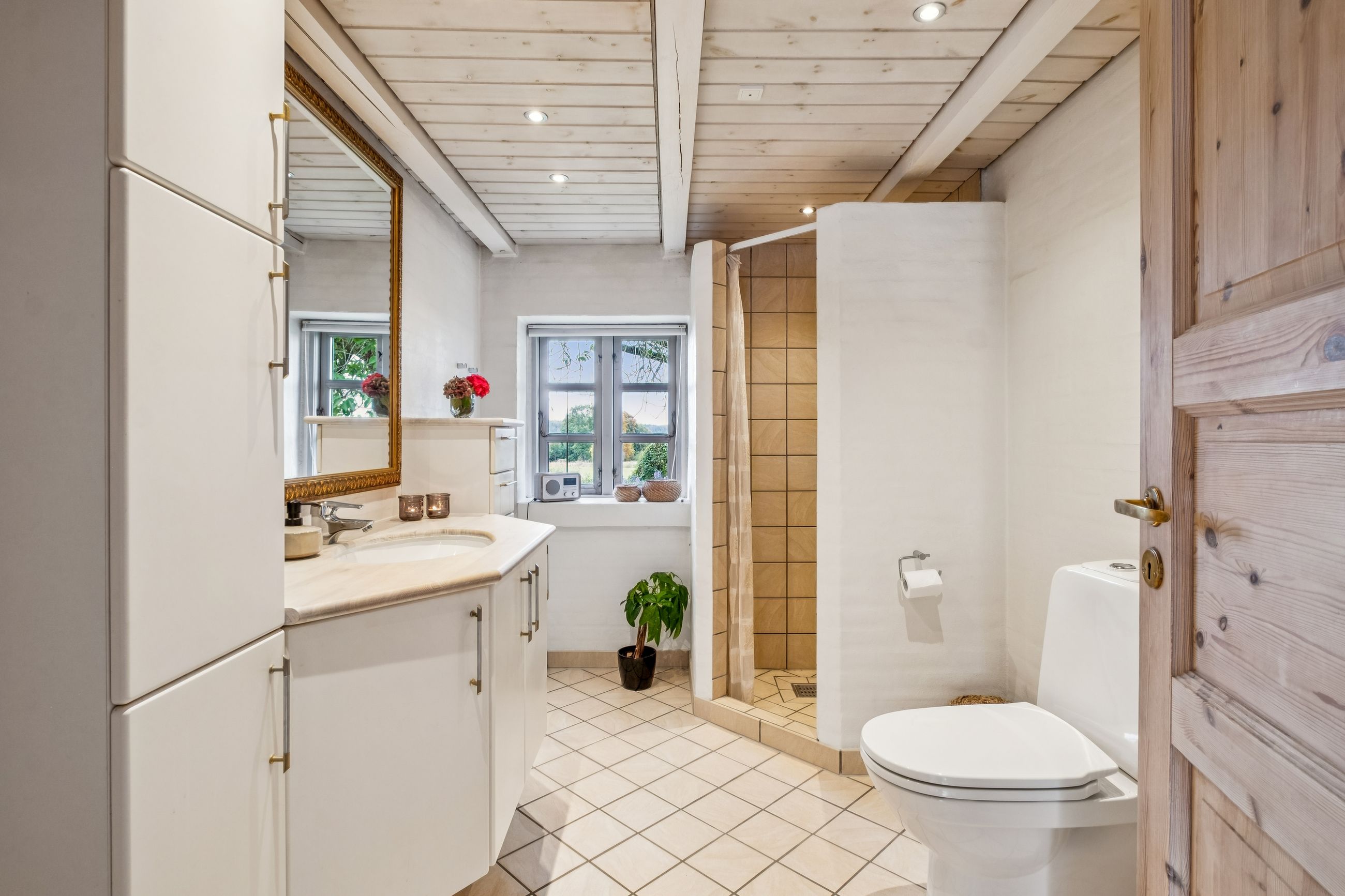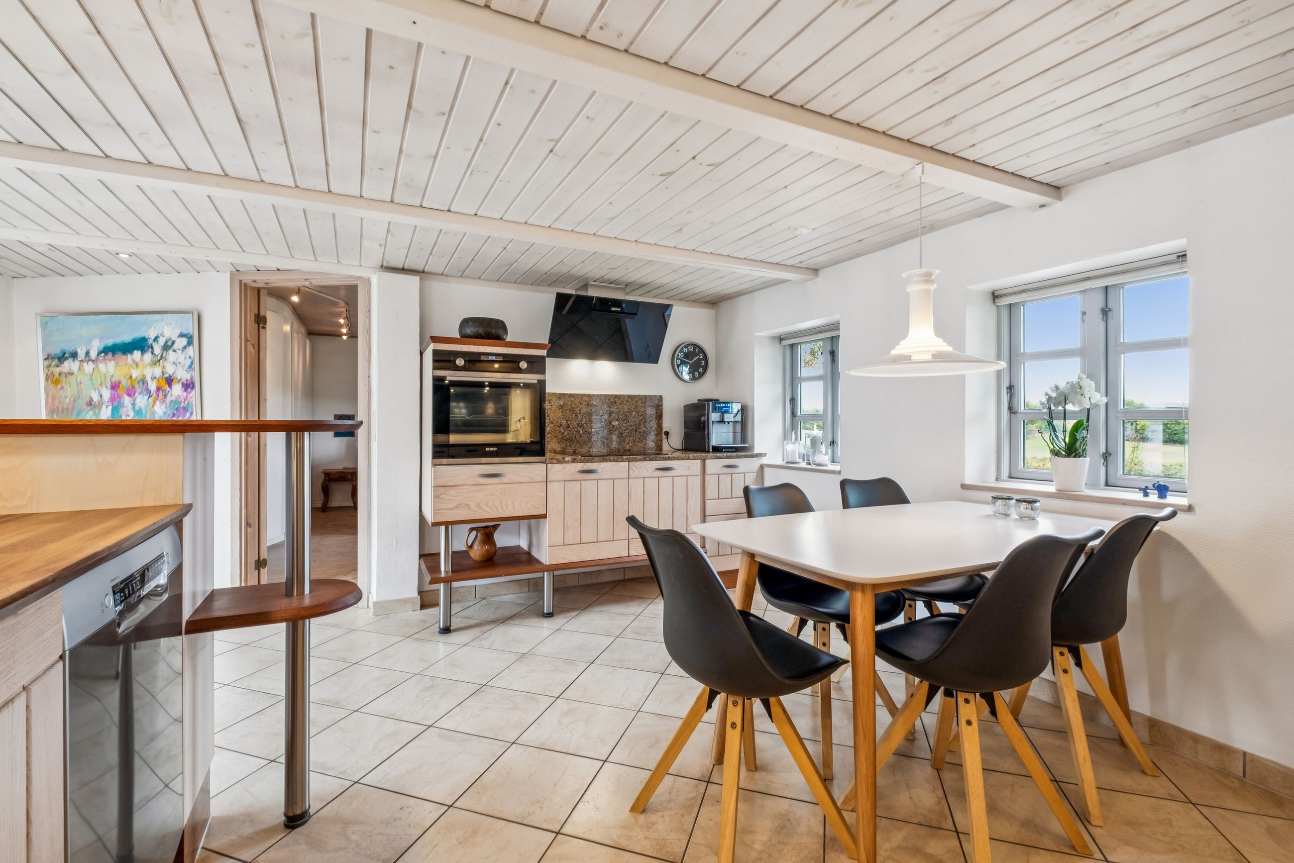 Når du træder indenfor, mødes du af en indbydende entré i åben forbindelse med det skønne køkken/alrum fra Modulia med gulvvarme i klinkerne. Her er god plads til både madlavning og samvær, og i forlængelse heraf finder du den lyse alrum/stue, som imponerer med sine synlige loftsbjælker, fede egetræs plankegulve, charmerende vinduespartier og en indmuret pejs, der spreder varme og stemning i de kolde måneder. Boligen rummer i stueplan desuden to badeværelser med gulvvarme, et soveværelse, et praktisk bryggers fra Modulia ligeledes med gulvvarme samt et stort værelse, der nemt kan opdeles, hvis du har brug for et ekstra rum.