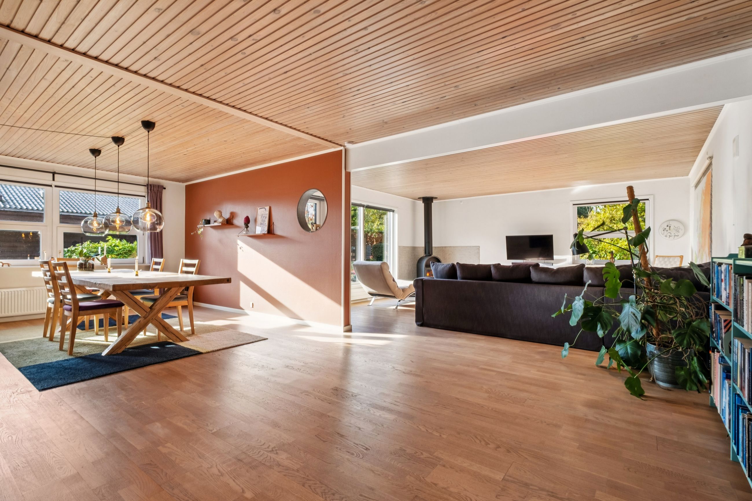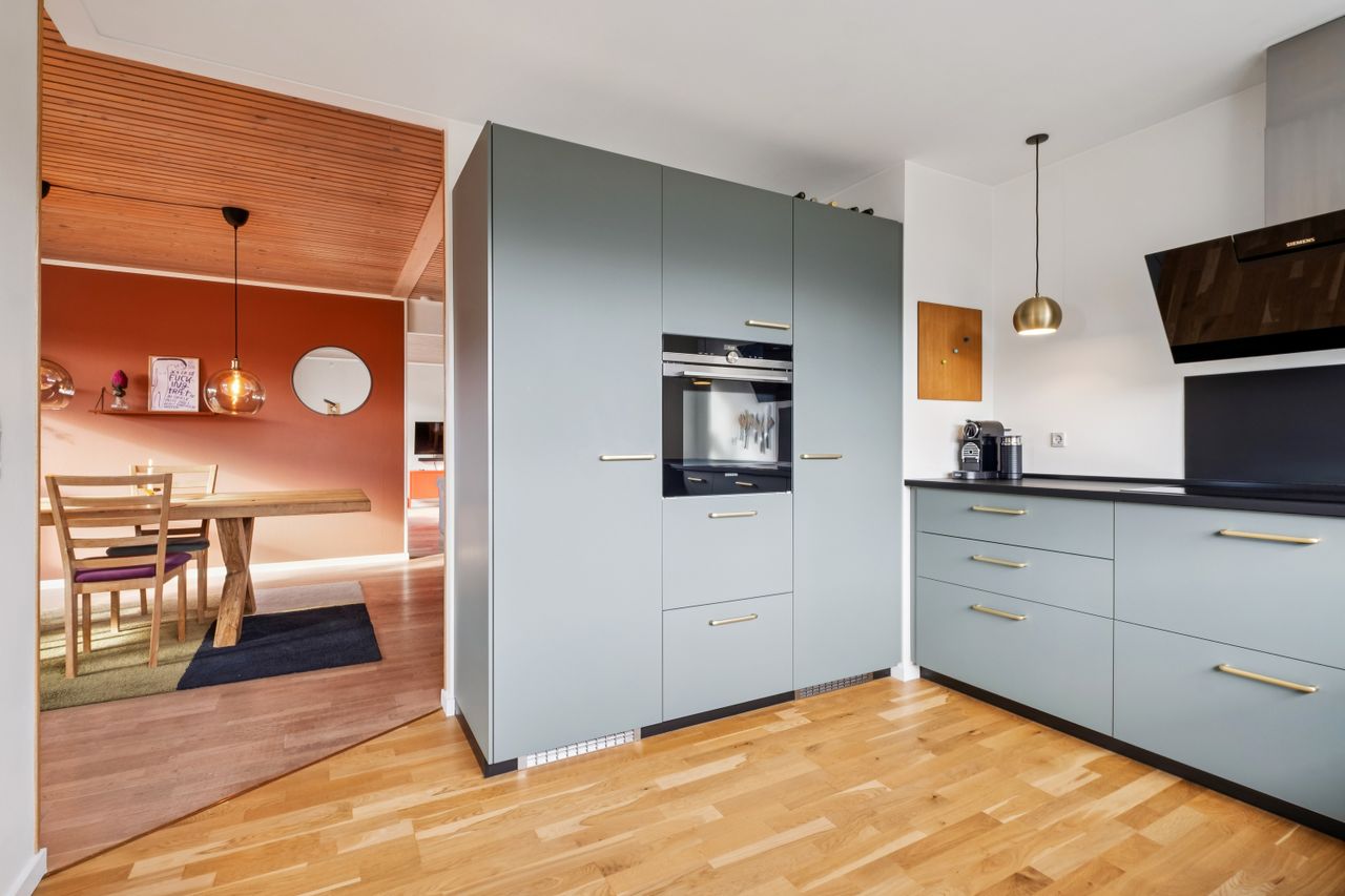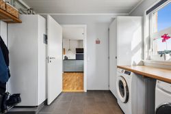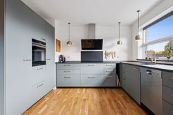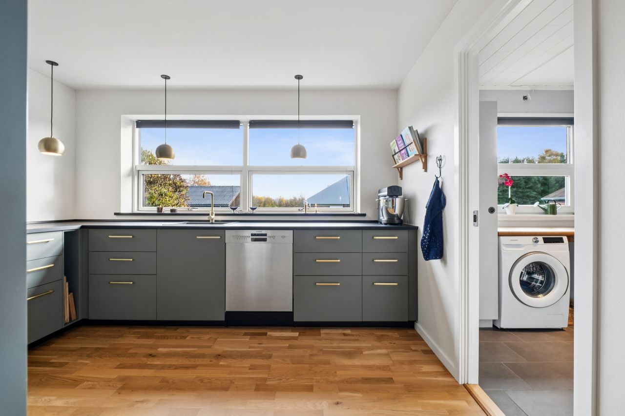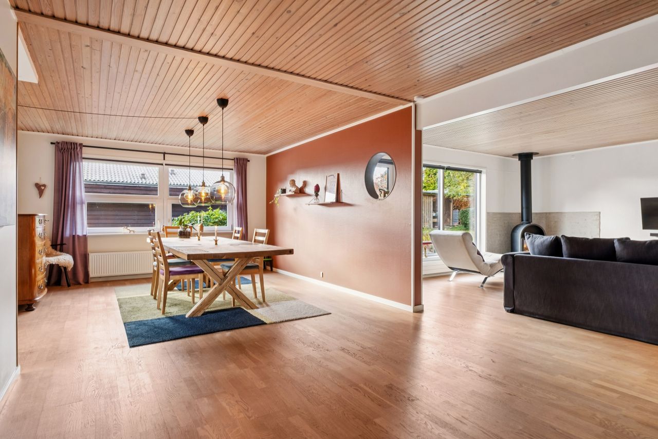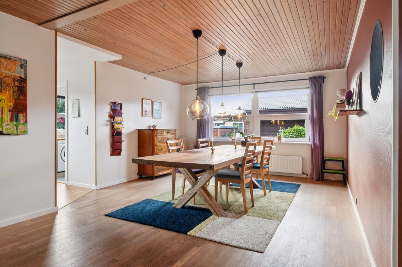 Huset byder på en rummelig indretning der fordeler sig med et moderne bryggers. Et super indbydende køkken fra 2022 hvor der også blev etableret gulvvarme. Køkkenet er funktionelt og meget stilfuldt. Hertil er der åbnet lidt op til spisestuen. Herudover er der en ekstra rummelig stue med udgang til haven.