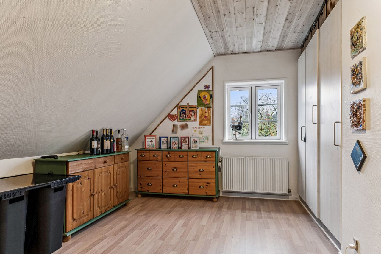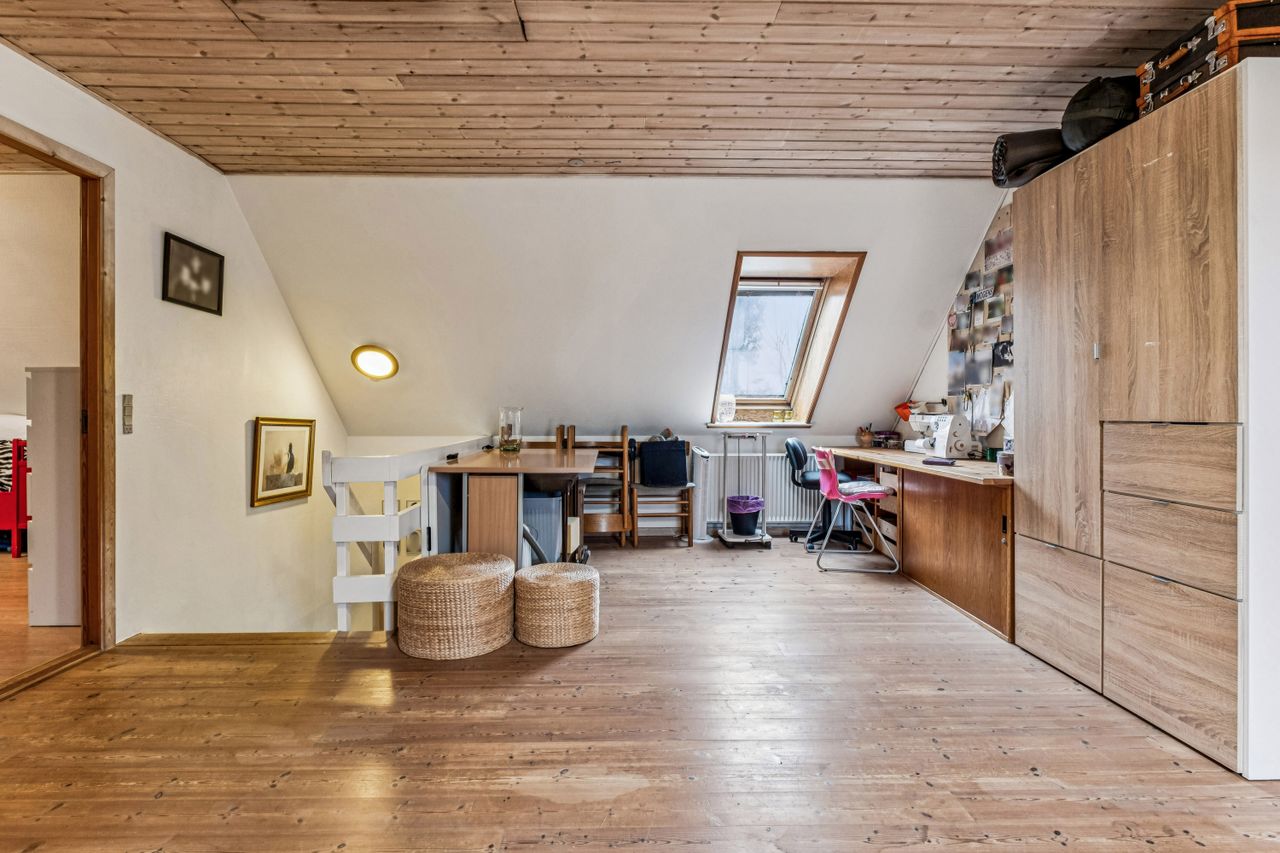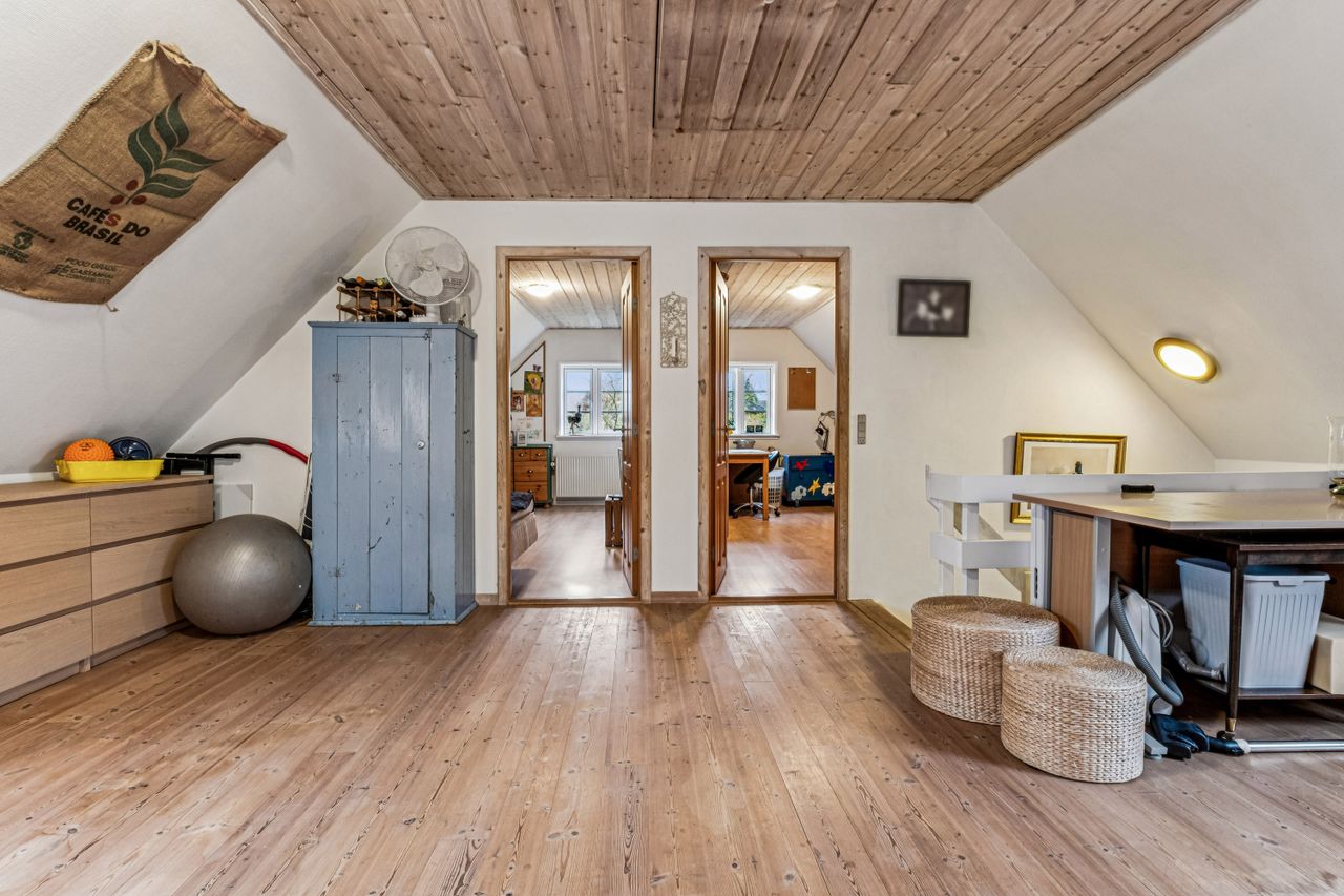 Tagetagen består af et stort aktivitetsrum/stue/multirum med planker på gulvet og opgang til loft, 2 gode store værelser samt et kæmpe stort værelse - som nemt kan deles i 2 hvis behovet er for det.