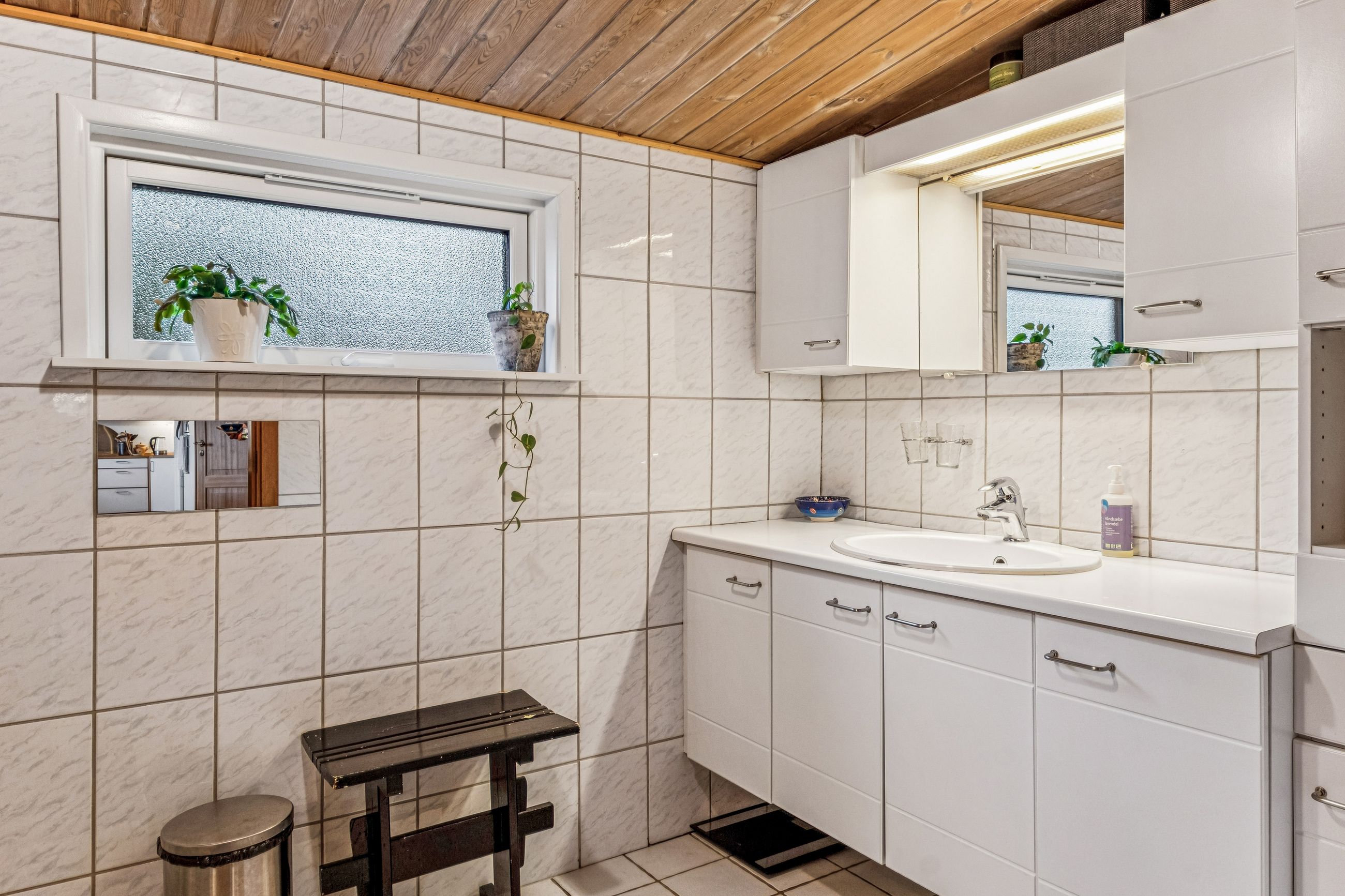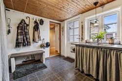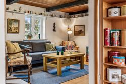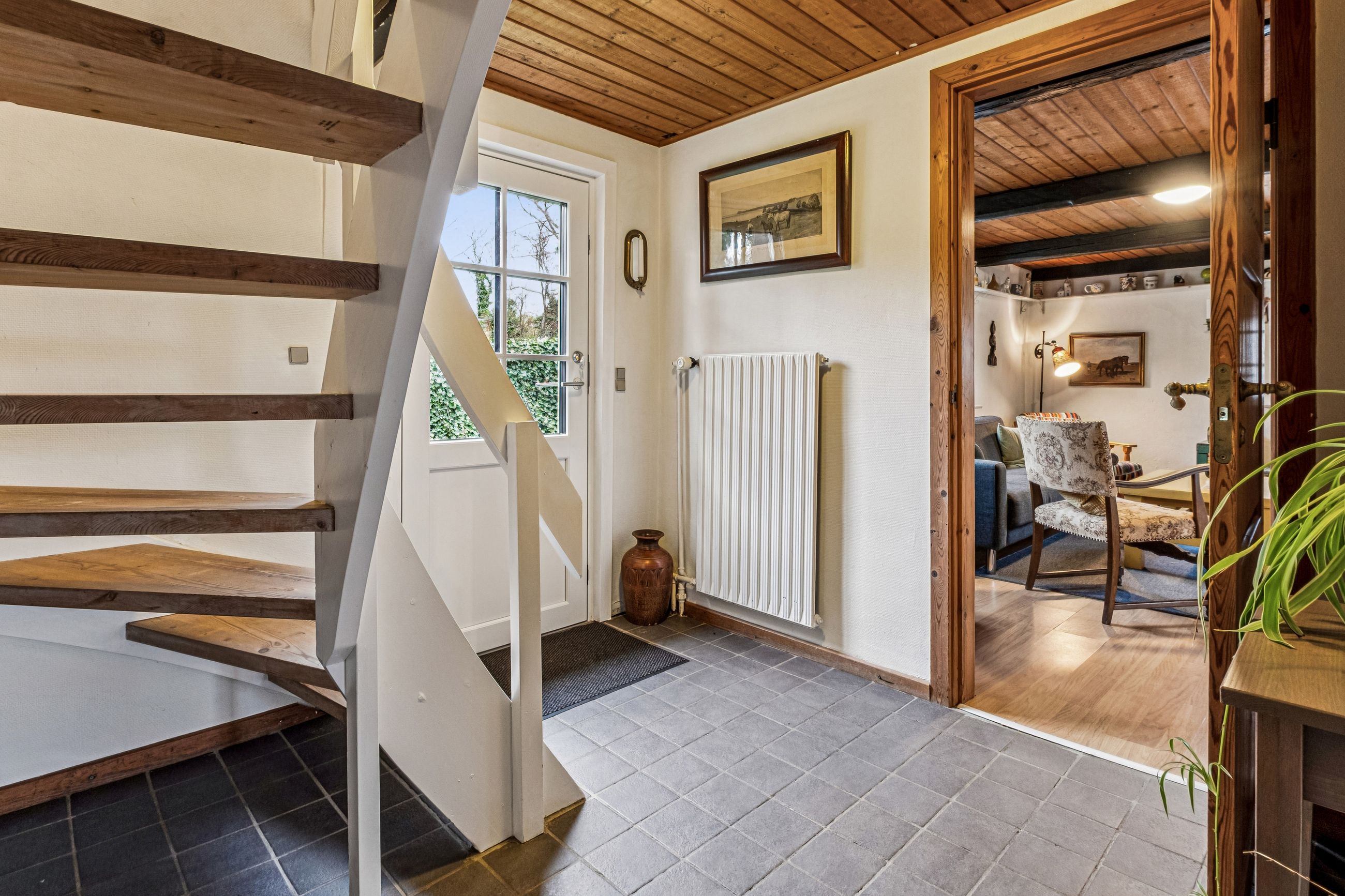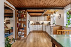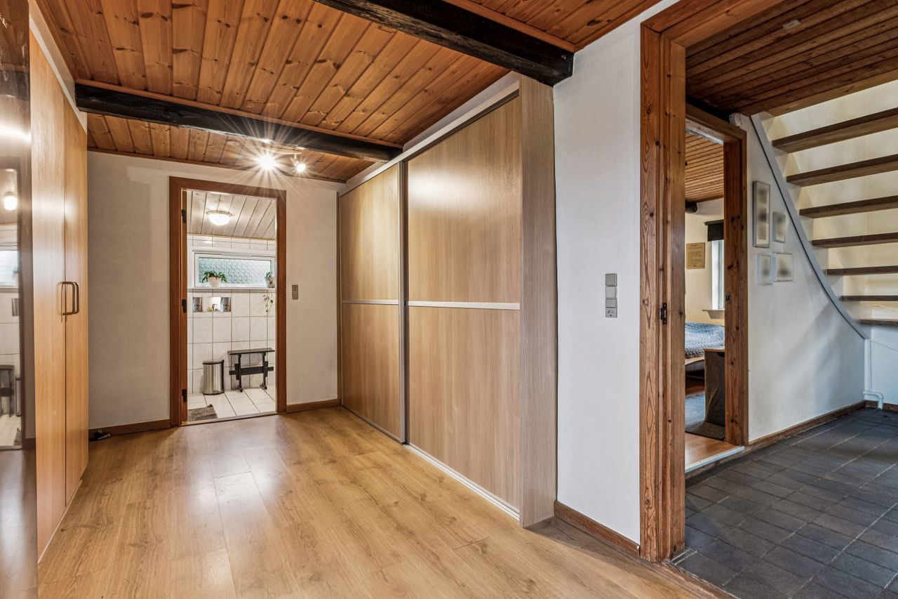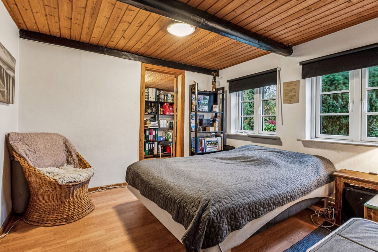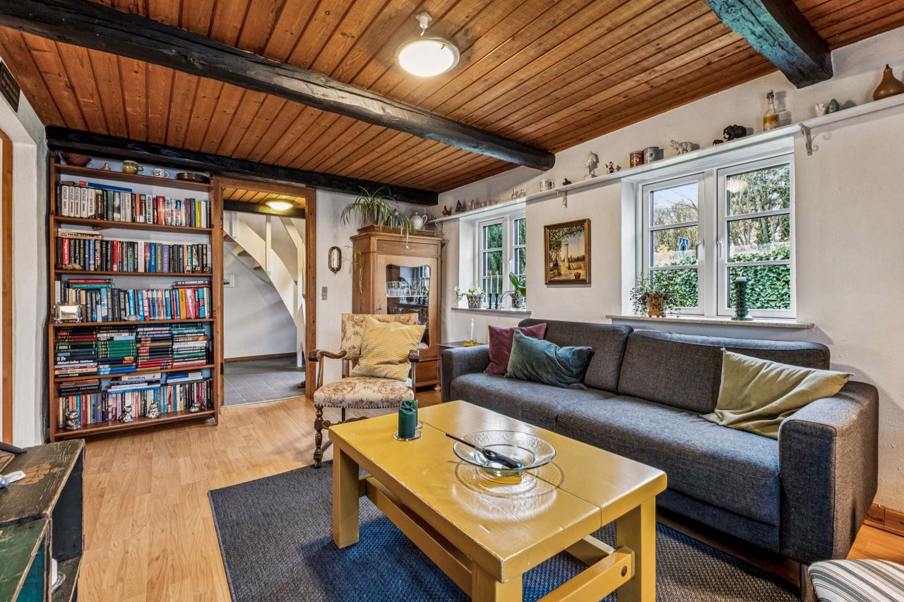 Stueplan fordeler sig med et praktisk bryggers med plads til installation af vaskesøjle og bord med vask, rummeligt og charmerende køkken alrum med synlige bjælker, gulvvarme og dejlig udsigt til naturen, hyggelig stue ligeledes med synlige bjælker og rustikke vægge, værelse med adgang til endnu et værelse - som kan bruges til kontor/walk-in/babyværelse mm., lyst og venligt badeværelse med brus og gulvvarme samt et gæstetoilet lige nedenfor trappen til tagetagen.