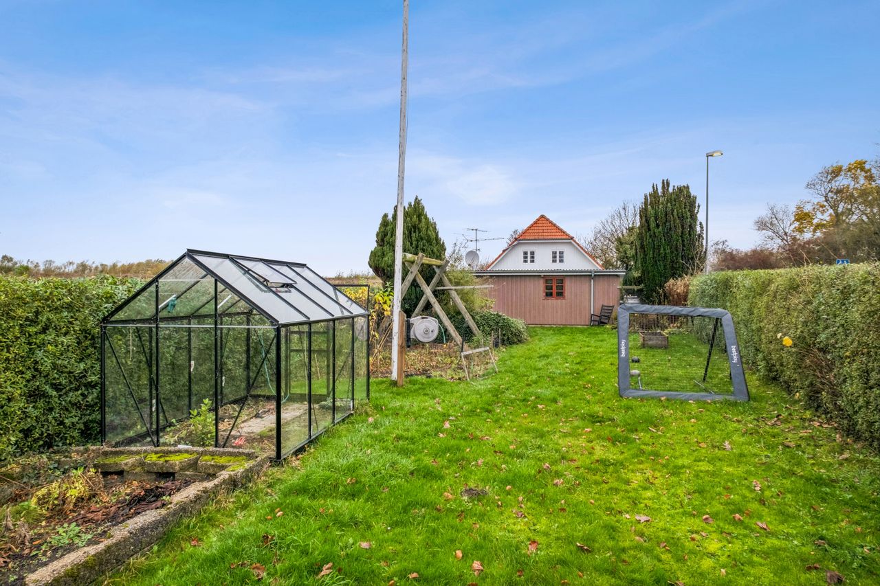 En bemærkelsesværdig detalje ved denne villa er dens beliggenhed ud til Bryggersskoven. Den nyetablerede grønne oase vest for ejendommen indbyder til afslappende gåture i naturen og kan tilmed nydes fra den vestvendte terrasse. Grunden på 490 m2 er tilmed godt udnyttet med en stor flisebelagt indkørsel med plads til flere biler, god garage/værksted samt en lukket have med nyt drivhus, bærbuske mm.