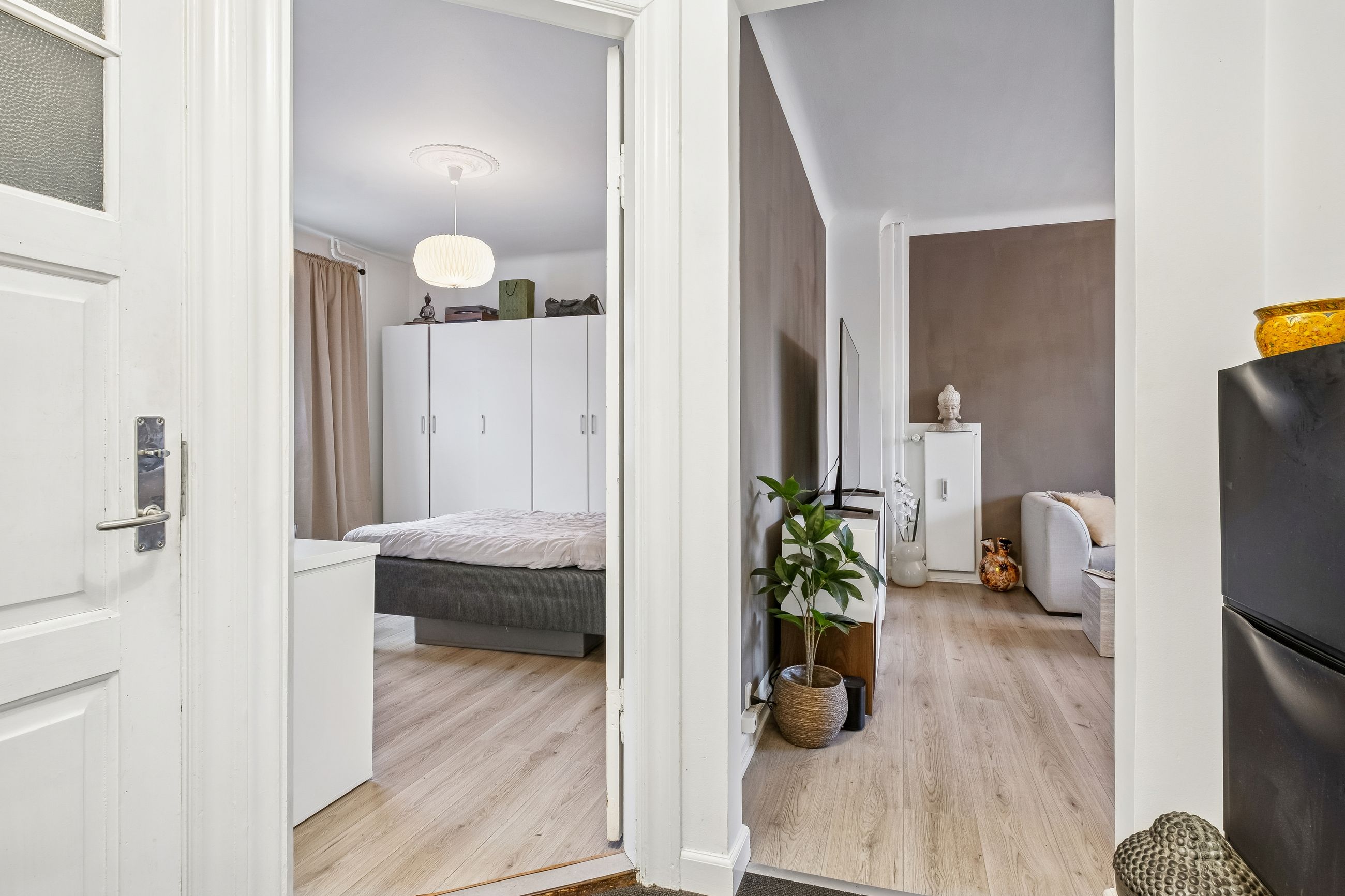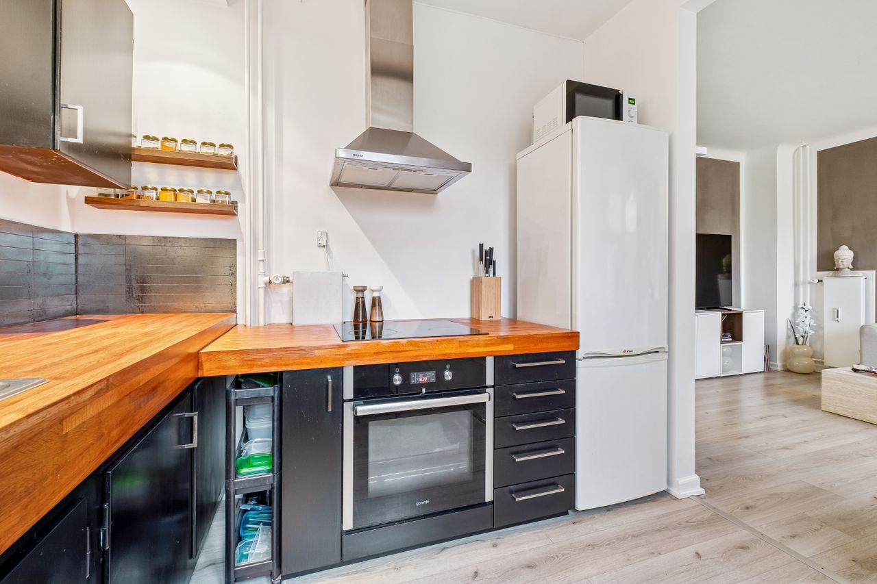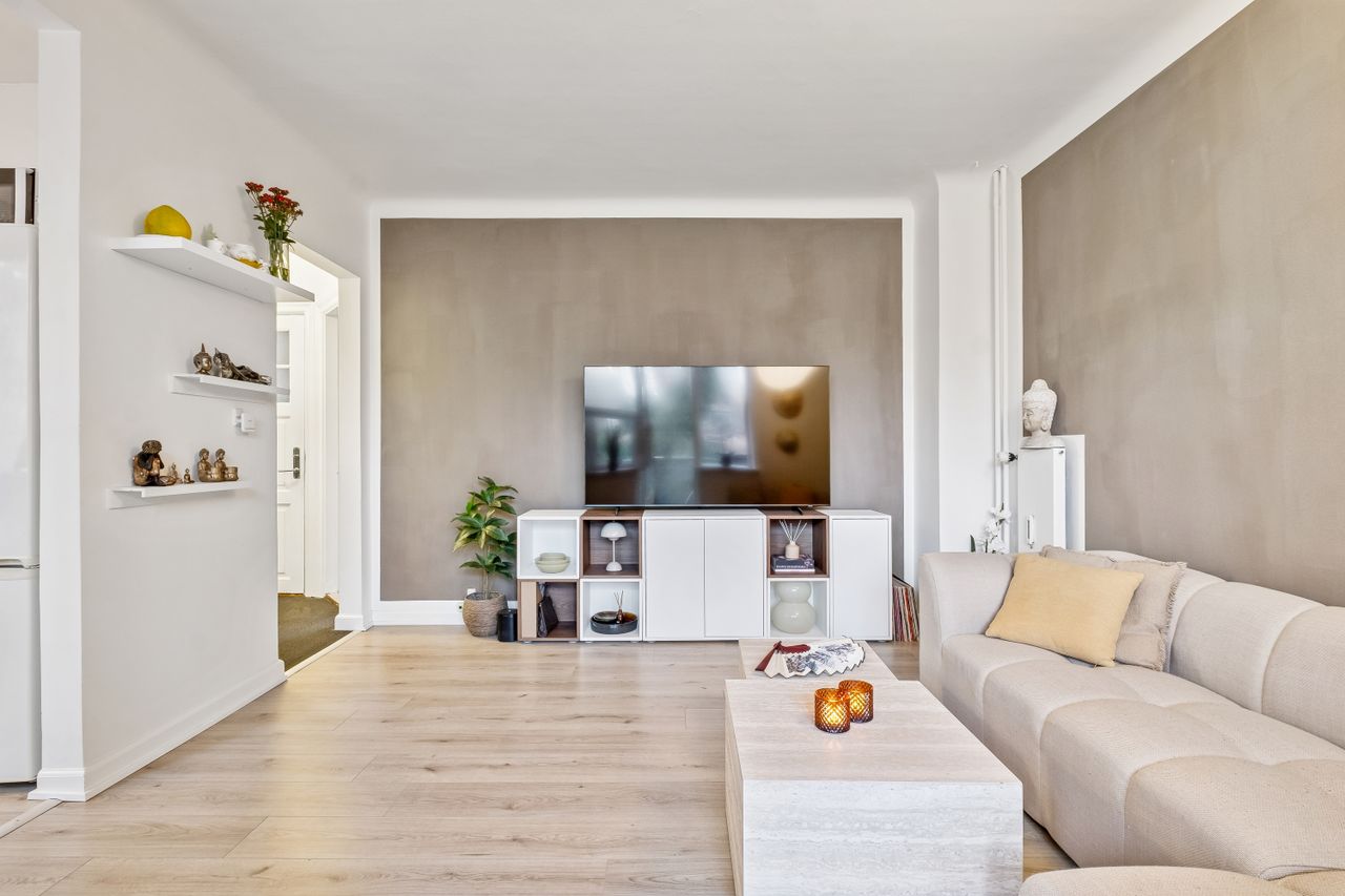 Indendørs fordeler boligen sig harmonisk med et stort, lyst soveværelse, der indbyder til afslapning efter en lang dag. Det hyggelige køkken-alrum er både funktionelt og indbydende, perfekt til både stille stunder og hyggelige sammenkomster. Lejligheden blev beriget med nye gulve i 2022, hvilket tilfører et moderne touch til den allerede charmerende indretning.