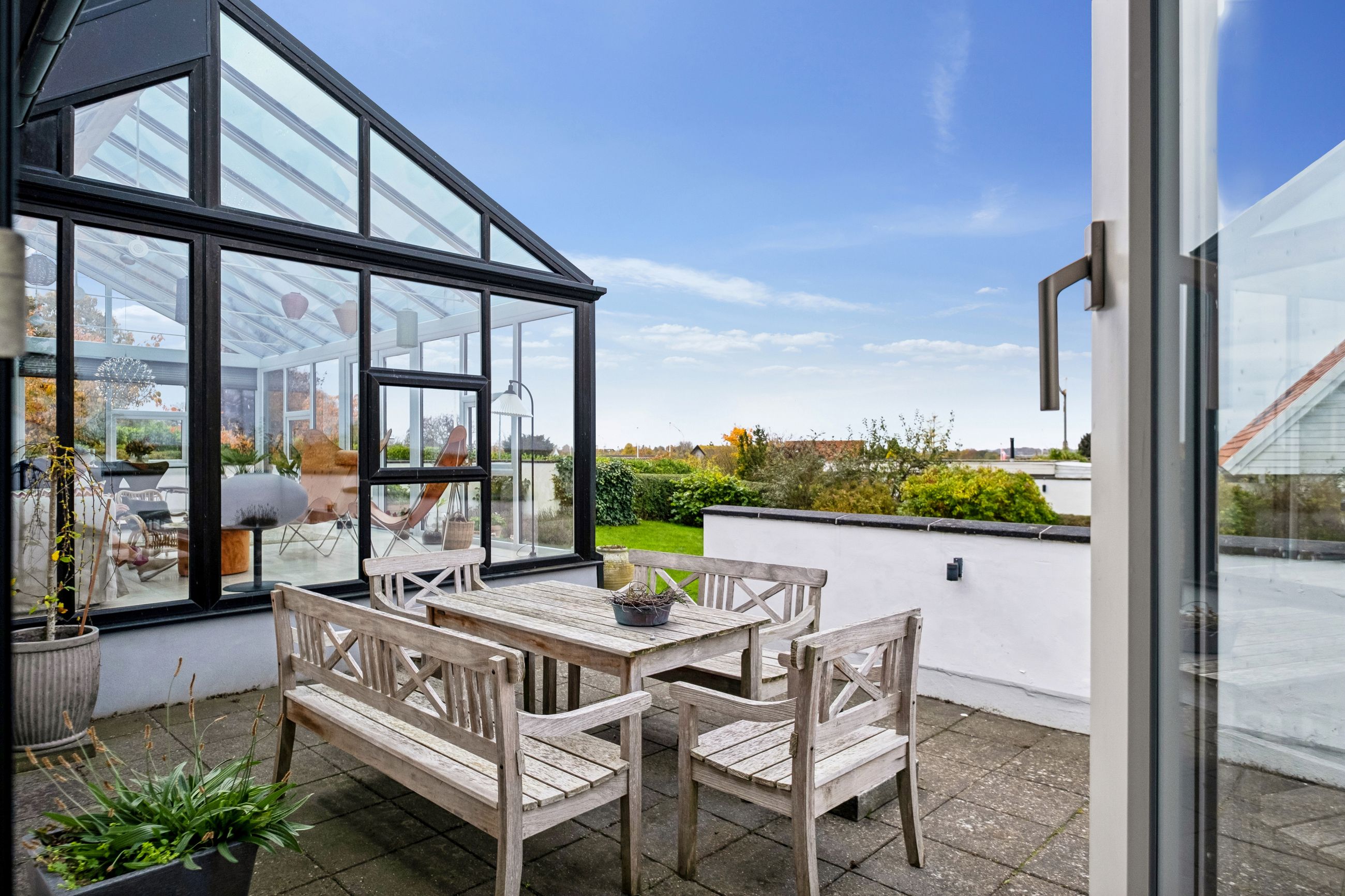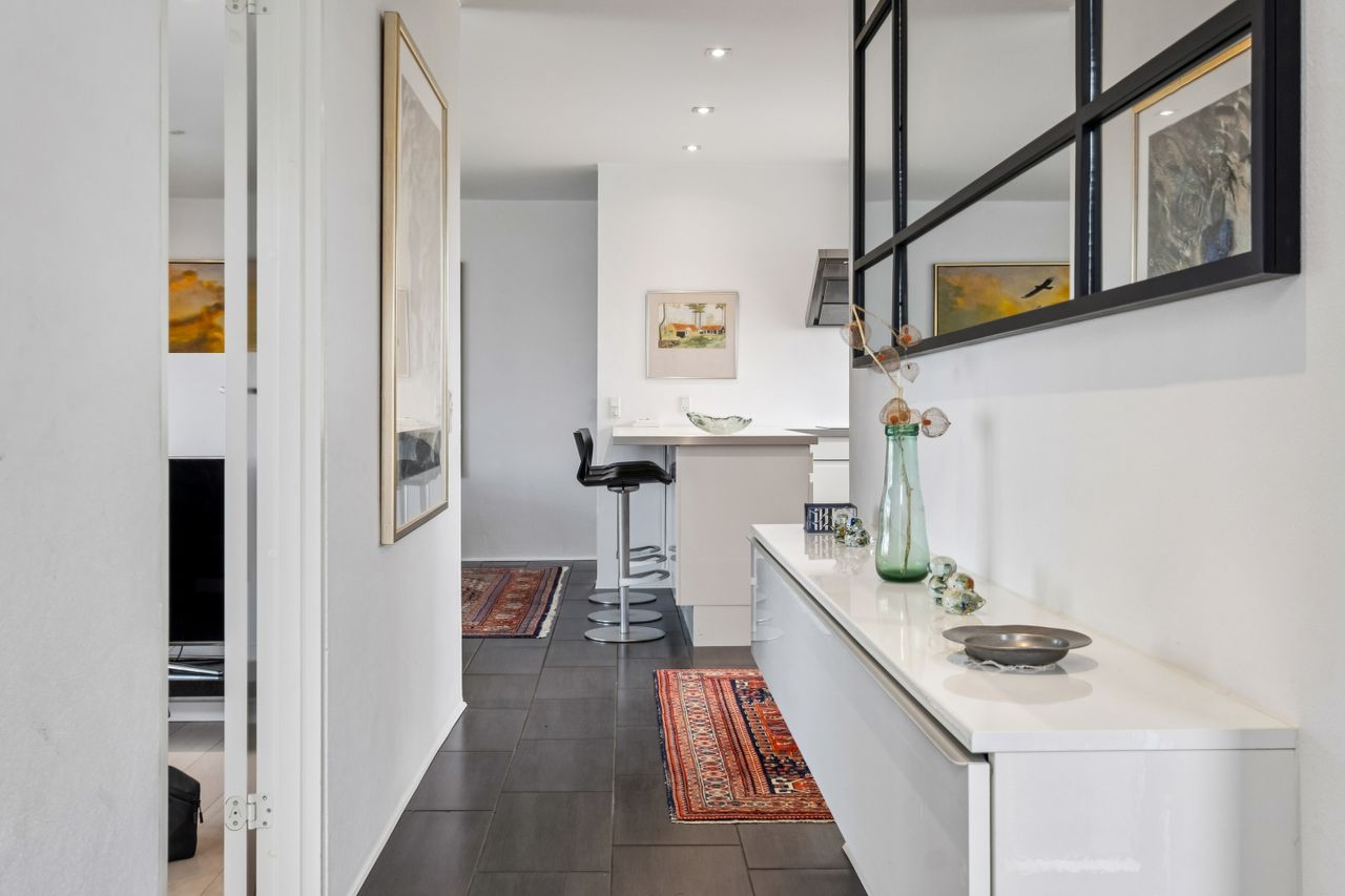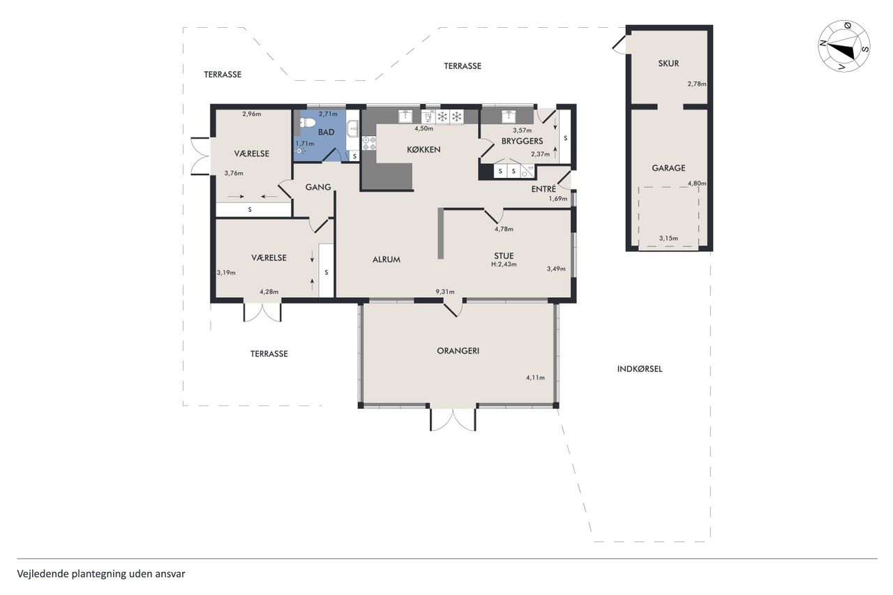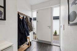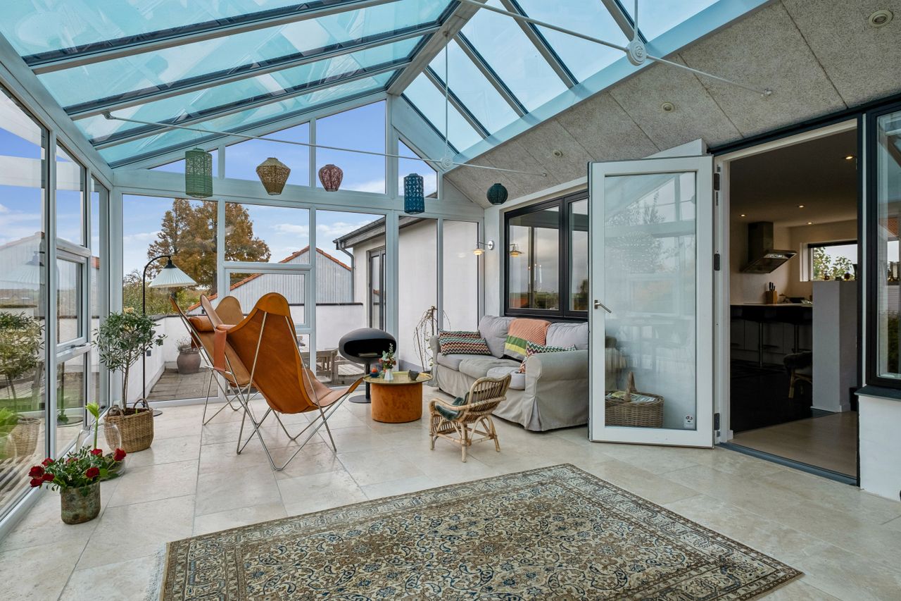 Boligens planløsning fordeler sig med en indbydende entre med praktiske klinker på gulvet, et lækkert, stort køkken-alrum med fleksibilitet til at dække op til hele familien, stue med plankegulve og udgang til det store orangeri med plads til både spisebord, loungemøbler og sofagruppe, to gode værelser med faste skabe og udgang til terrasse fra det ene værelse og udgang til haven fra det andet. Til sidst findes et badeværelse med brus samt et bryggers med installation til vaskesøjle og bord med vask. Her er glatte gipslofter, filtede vægge og hvide massive døre som alt sammen er med til at skabe en imødekommende atmosfære, der vil få dig til at føle dig hjemme fra første færd.