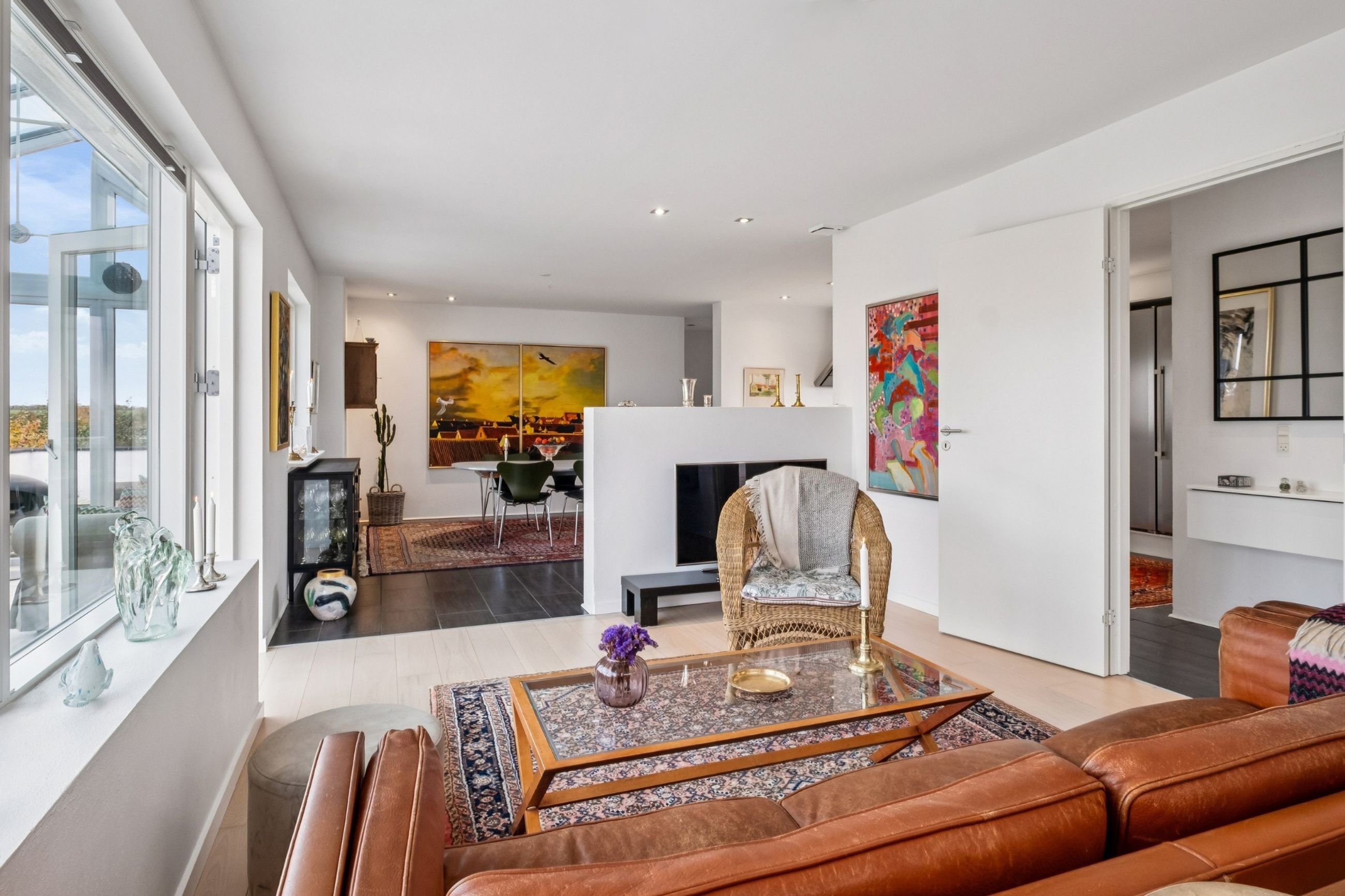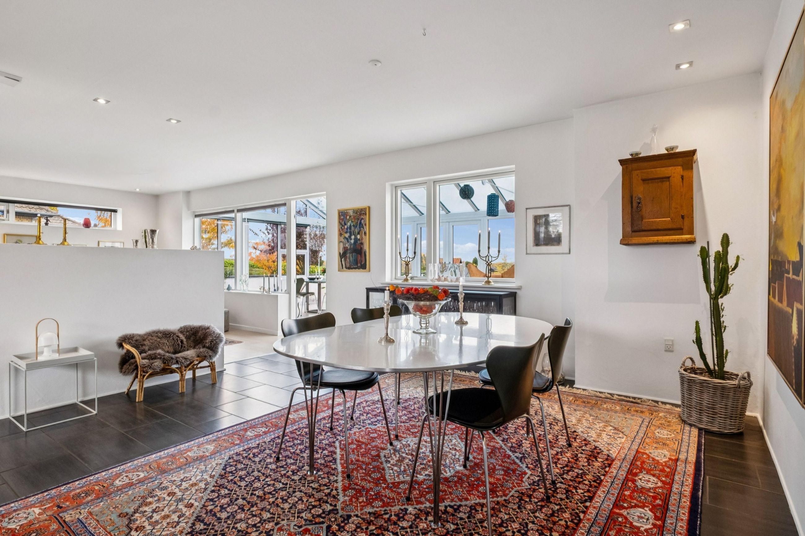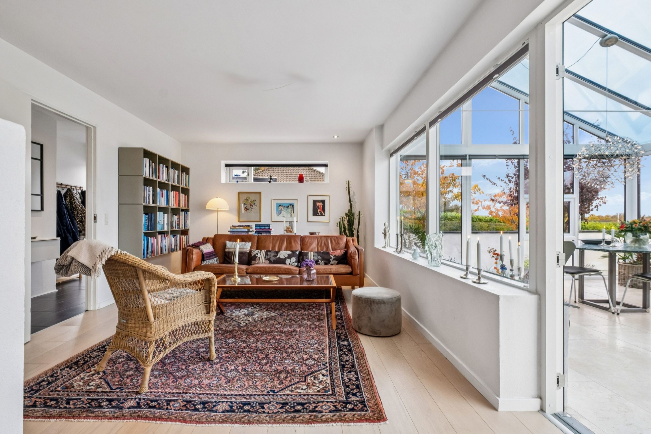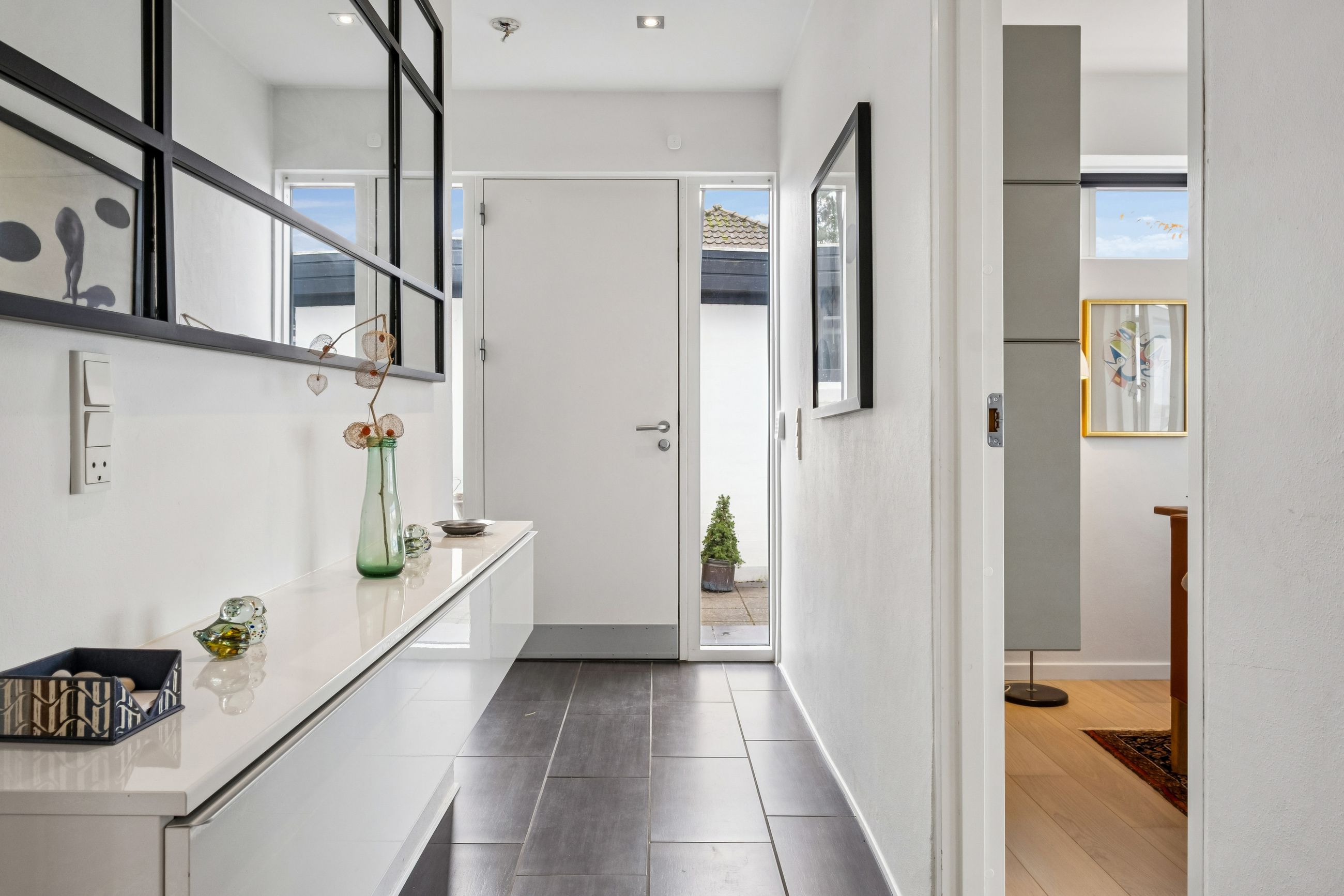 Boligens planløsning fordeler sig med en indbydende entre med praktiske klinker på gulvet, et lækkert, stort køkken-alrum med fleksibilitet til at dække op til hele familien, stue med plankegulve og udgang til det store orangeri med plads til både spisebord, loungemøbler og sofagruppe, to gode værelser med faste skabe og udgang til terrasse fra det ene værelse og udgang til haven fra det andet. Til sidst findes et badeværelse med brus samt et bryggers med installation til vaskesøjle og bord med vask. Her er glatte gipslofter, filtede vægge og hvide massive døre som alt sammen er med til at skabe en imødekommende atmosfære, der vil få dig til at føle dig hjemme fra første færd.