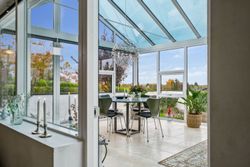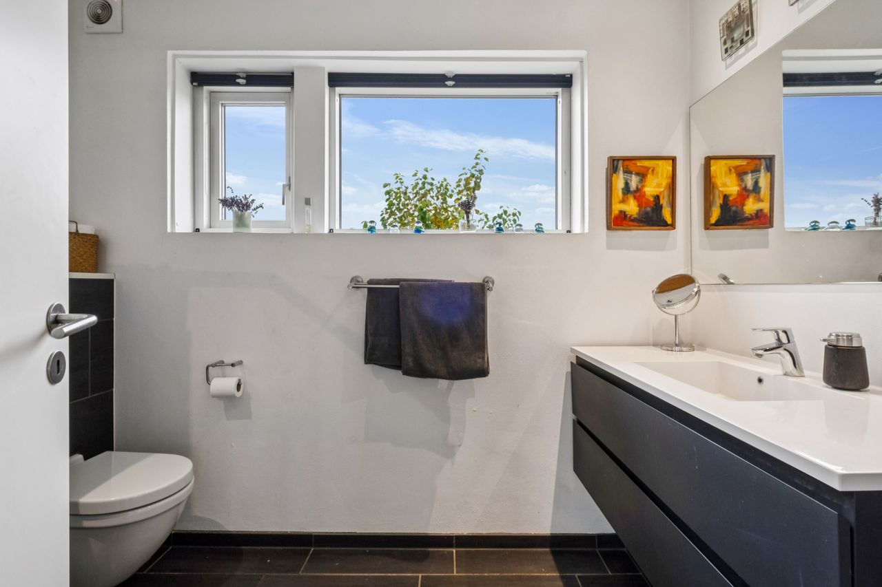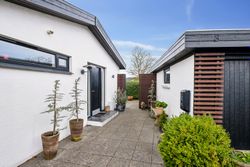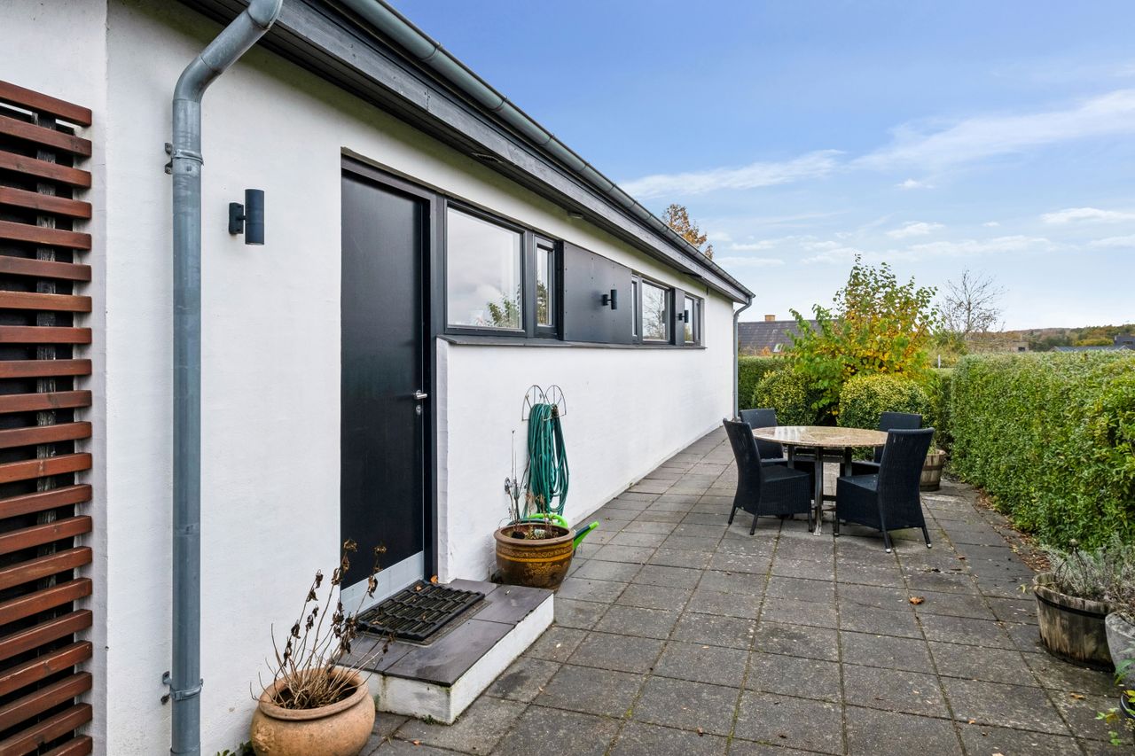 Herudover garage på 28 m2, udhus på 13 m2 samt en pæn anlagt have med bl.a. egen vinmark, terrasser på begge sider af huset og go plads i indkørslen.