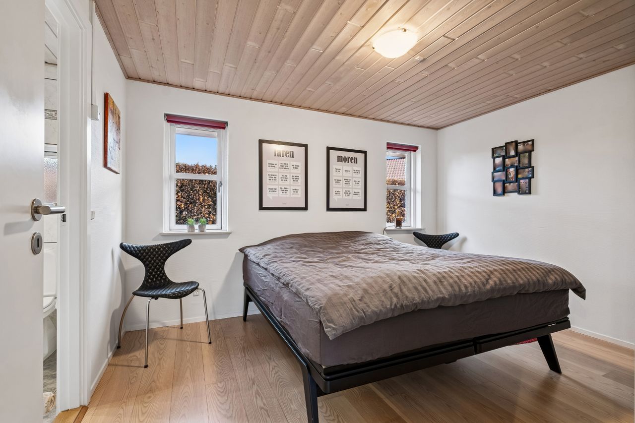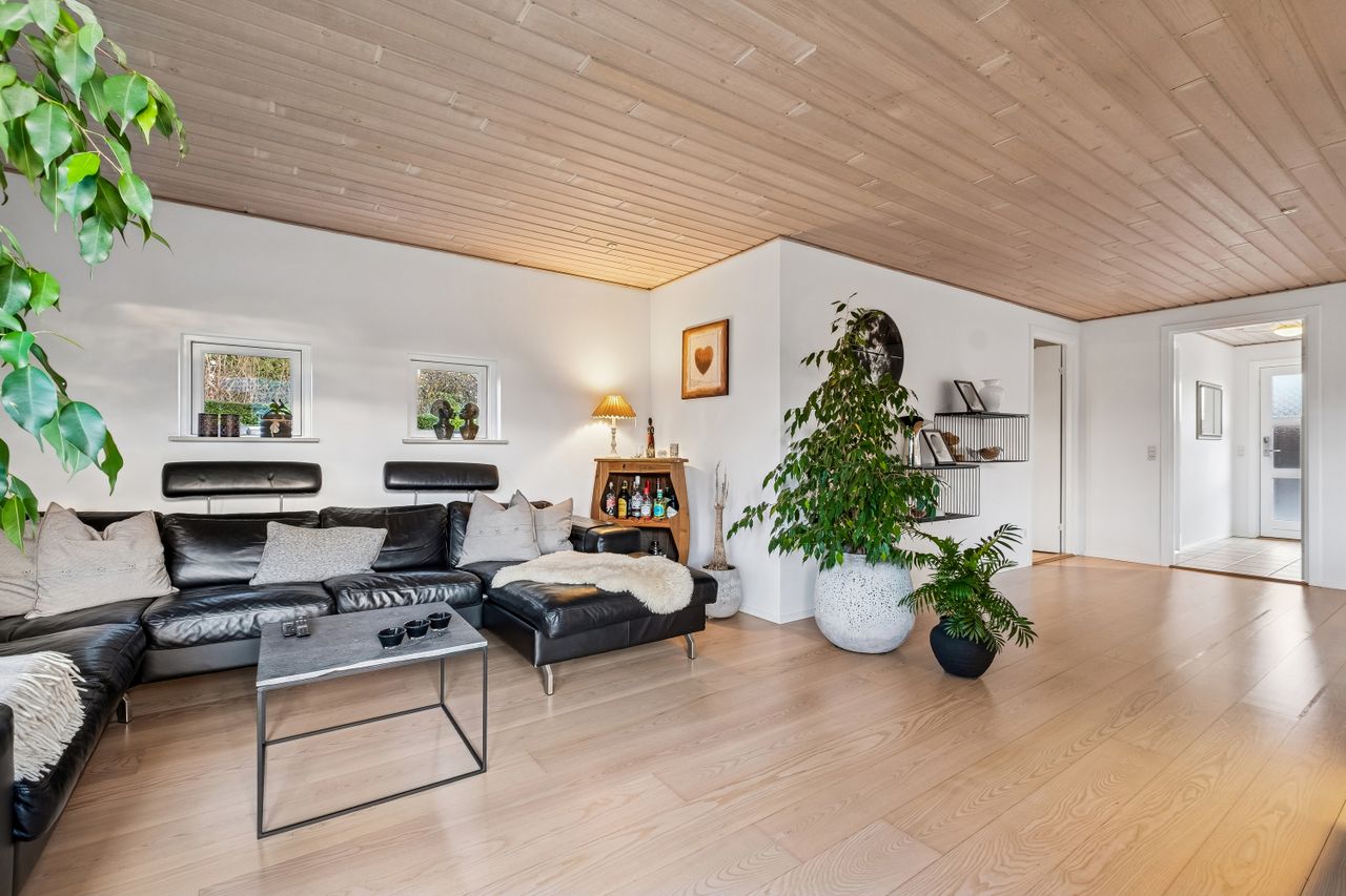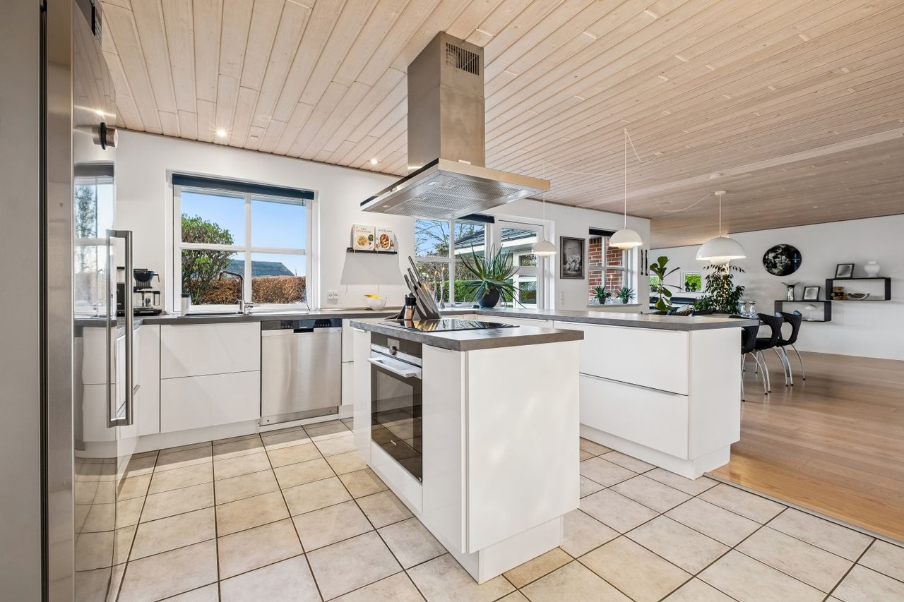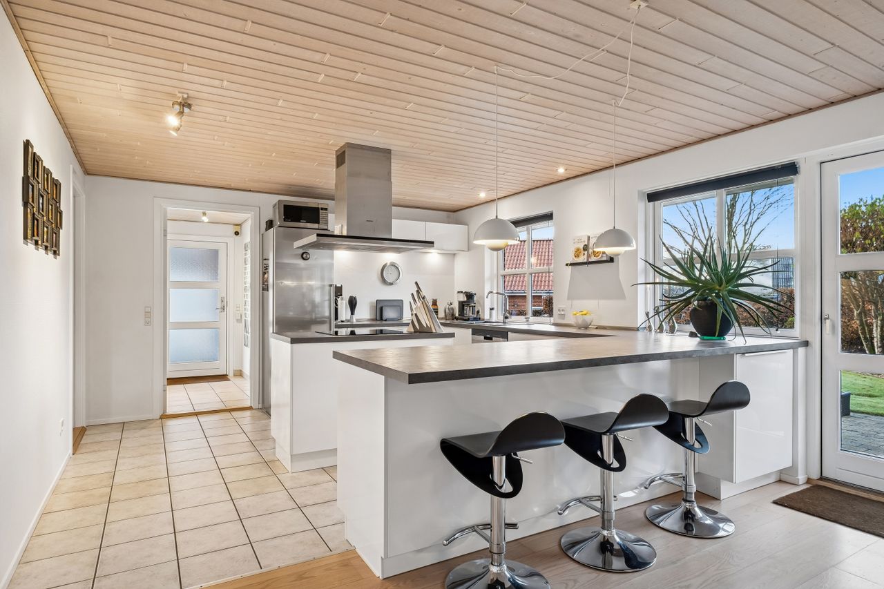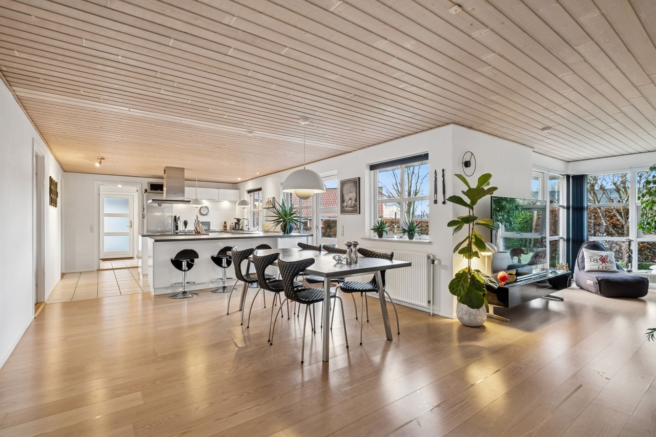 Indendørs imponerer hjemmet med et dejligt stort køkken-alrum, der er i åben forbindelse med stuen, et arrangement, som gør det muligt at invitere større selskaber indenfor, da der er rigeligt med plads til opstilling af spisebord og socialt samvær. Både køkken og bryggers er renoveret i 2017, og er udstyret med moderne inventar fra Vordingborg. Køkkenet fremstår funktionelt med kogeø, skuf i skuf, smart stikkontakt boks i bordpladen mm. Her er tilmed udgang til stor sydvendt terrasse. Boligen er indrettet med en forældreafdeling med eget badeværelse samt 3 værelser og endnu en entre med adgang til nr. 2 badeværelse. Fra entreen/gangen er der udgang til baghaven - som indbyder til et hyggemiljø uden lige med overdækket terrasse, bålsted og plads til isbad eller spa - alt efter hvad man er til. Lysindfaldet i hele villaen er bemærkelsesværdigt og skaber en behagelig atmosfære. Her er flotte trægulve, lyse klinker og hvide, massive døre, der gennem hele hjemmet bidrager til et stilfuldt og sammenhængende udtryk.