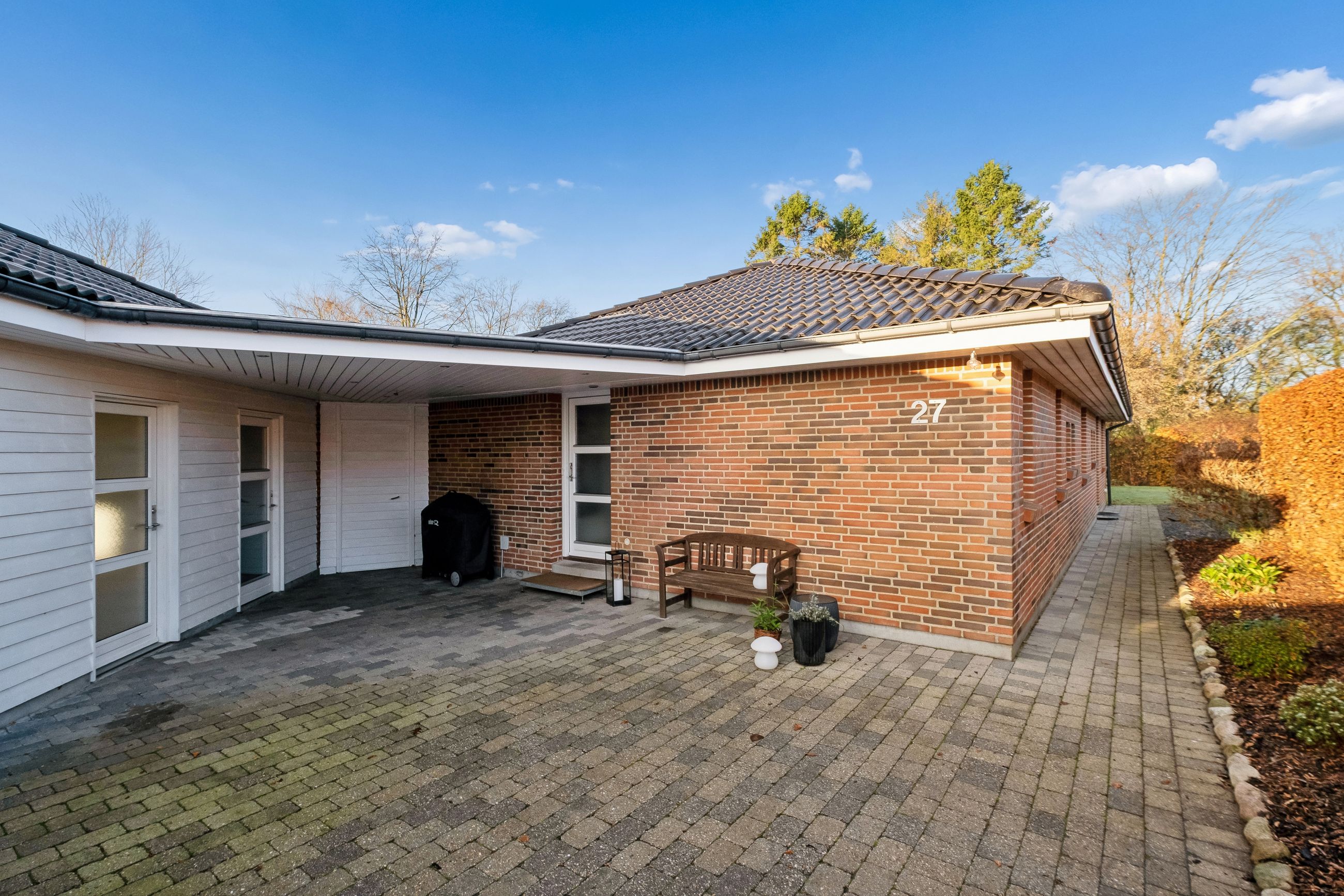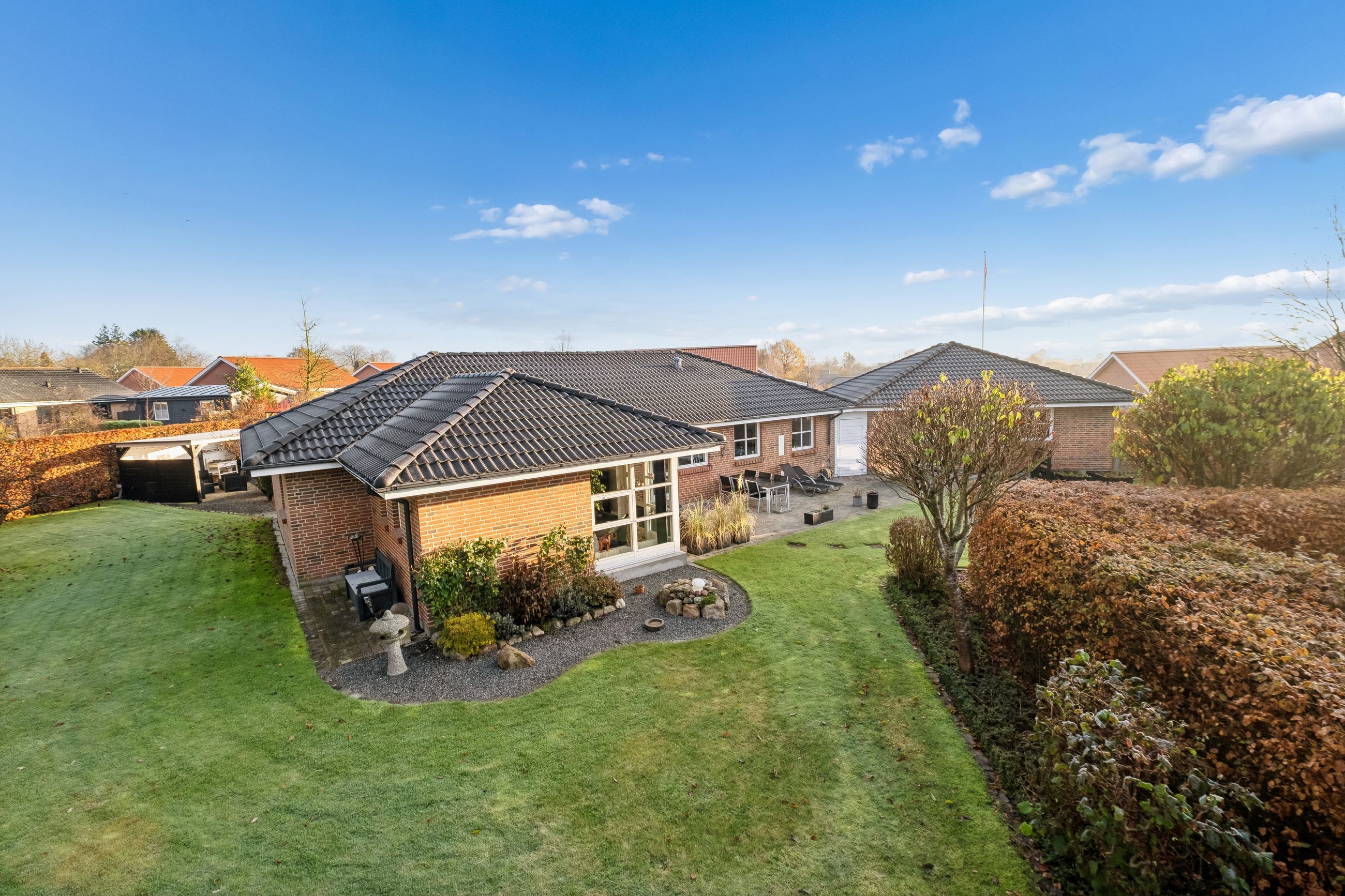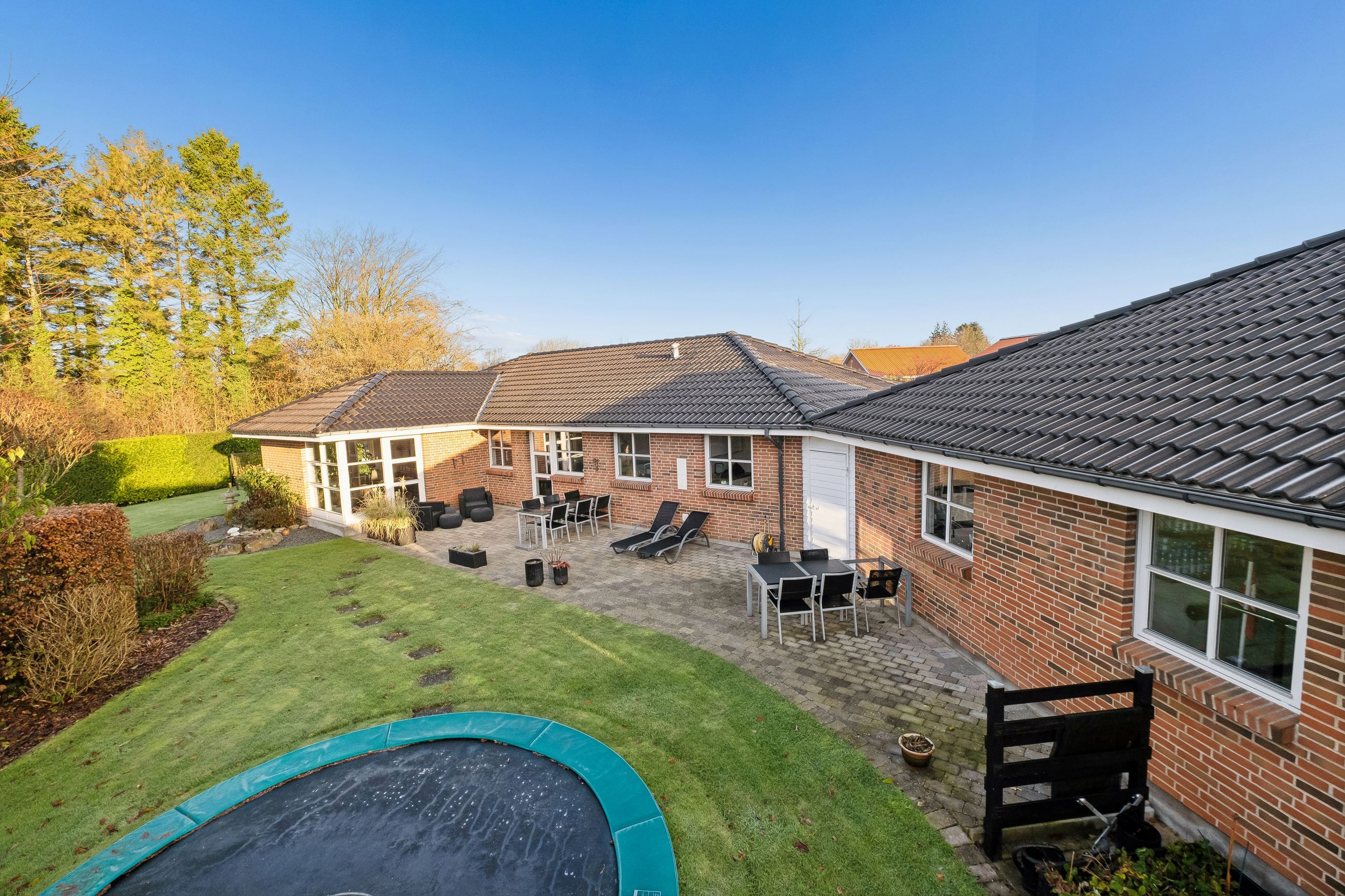 Udenfor bliver boligen fuldendt med et fantastisk havemiljø, hvilket er et ideelt sted for afslapning og samvær. De forskellige terrasser tilbyder alsidige muligheder for ophold, ligegyldigt om du vil nyde solens varme stråler eller finde en skyggefuld plet på den lukkede grund. Ejendommen er med separeret kloaksystem og forsynes med fjernvarme. Det moderne liv understøttes yderligere af tilgængelig fiber og kablet internet.