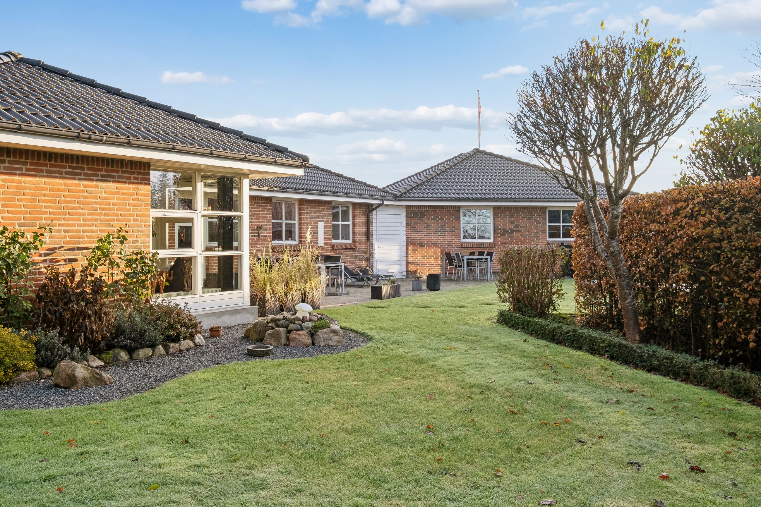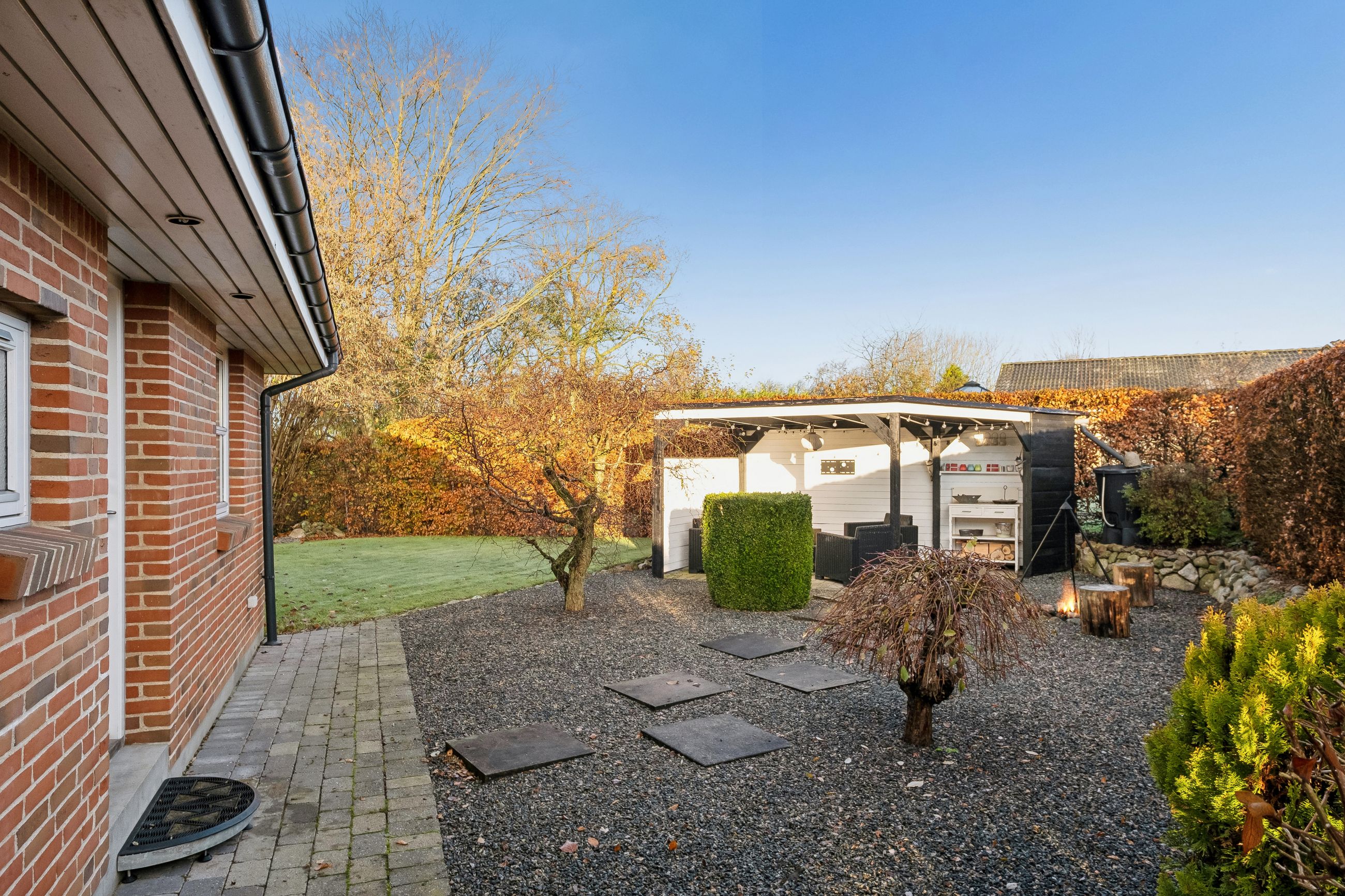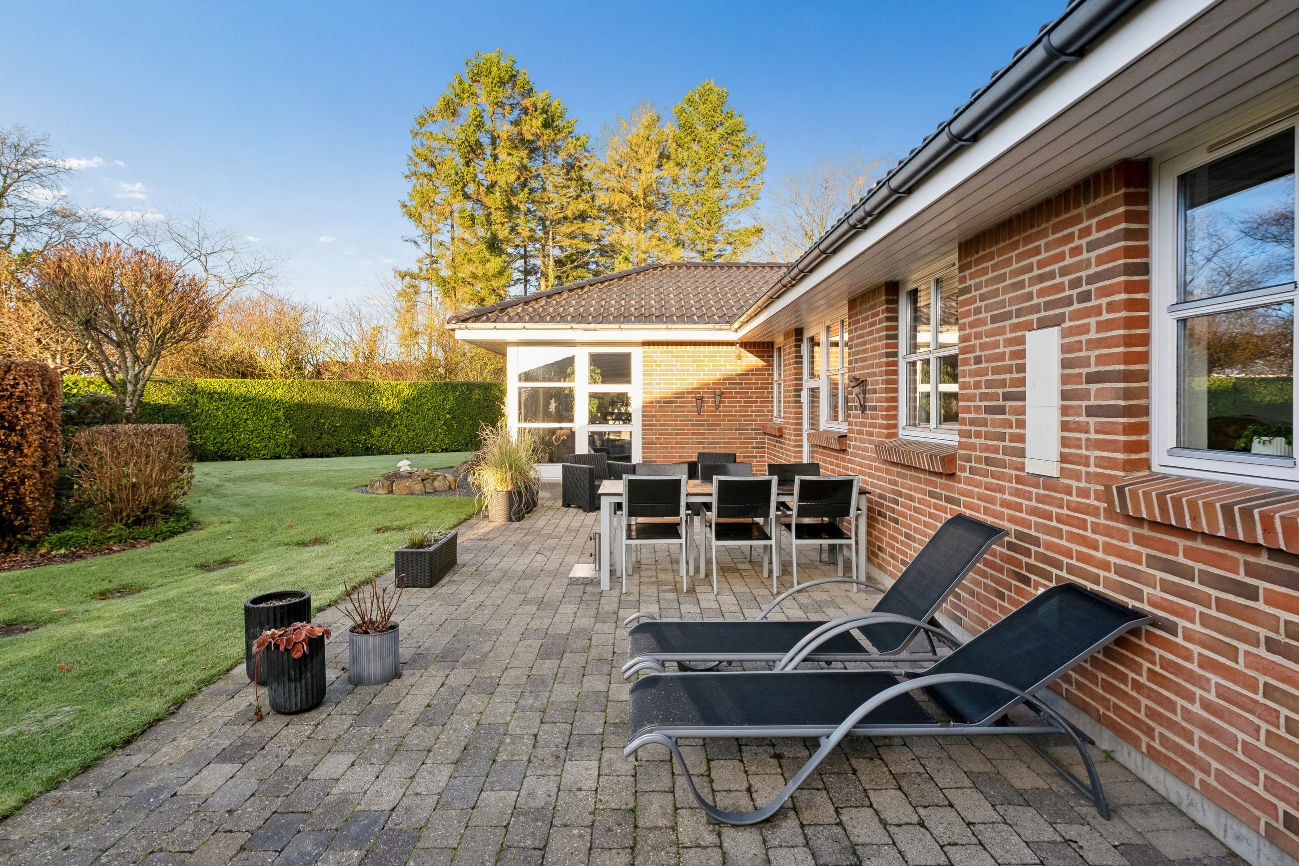 Udenfor bliver boligen fuldendt med et fantastisk havemiljø, hvilket er et ideelt sted for afslapning og samvær. De forskellige terrasser tilbyder alsidige muligheder for ophold, ligegyldigt om du vil nyde solens varme stråler eller finde en skyggefuld plet på den lukkede grund. Ejendommen er med separeret kloaksystem og forsynes med fjernvarme. Det moderne liv understøttes yderligere af tilgængelig fiber og kablet internet.