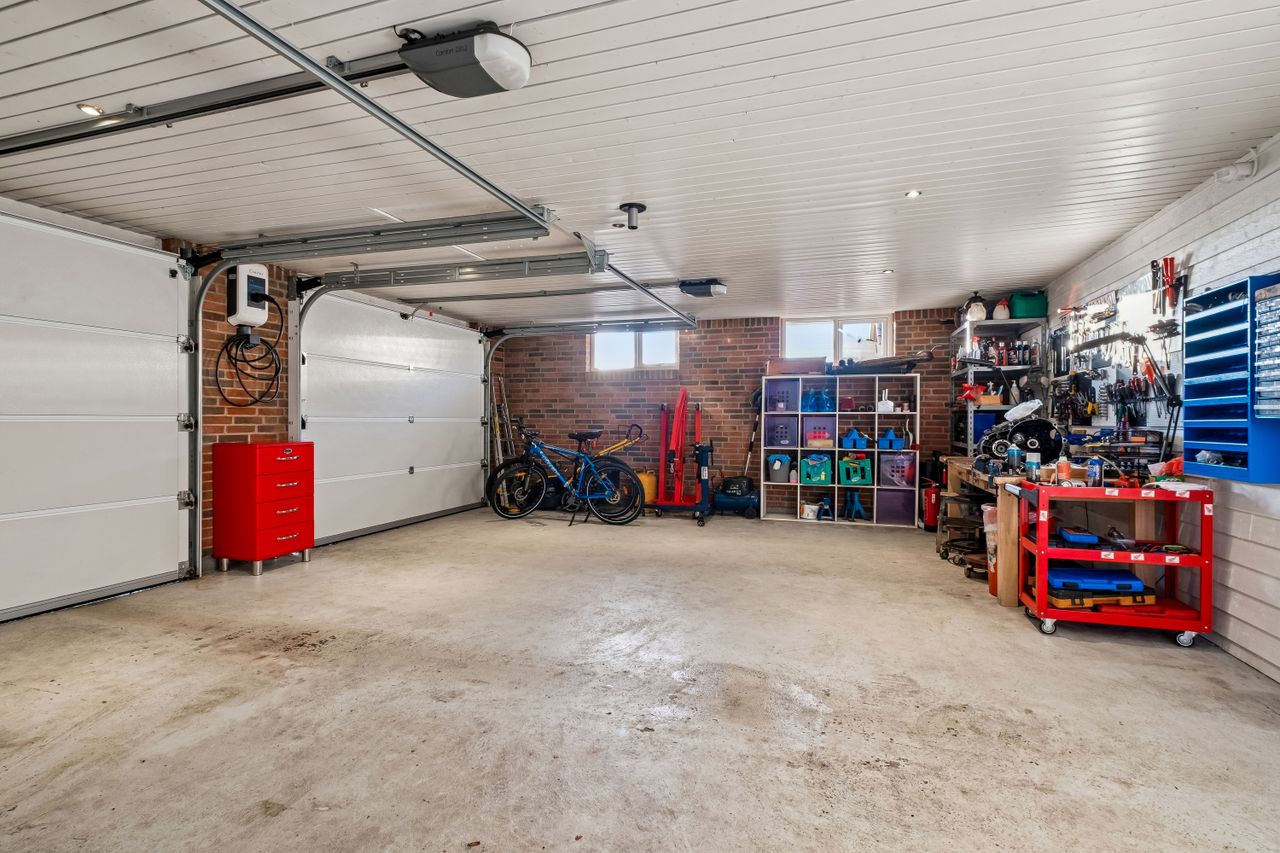 Villaen er opført i år 2000 og suppleret af en muret dobbeltgarage på hele 87 m2 i 2004. Ud over plads til biler i garagen - er her også indrettet to disponible rum, der kan bruges til separat kontor eller træningsrum alt efter behov. Mellem boligen og garagen er der overdækket - så du kan gå tørskoet mellem bygningerne.