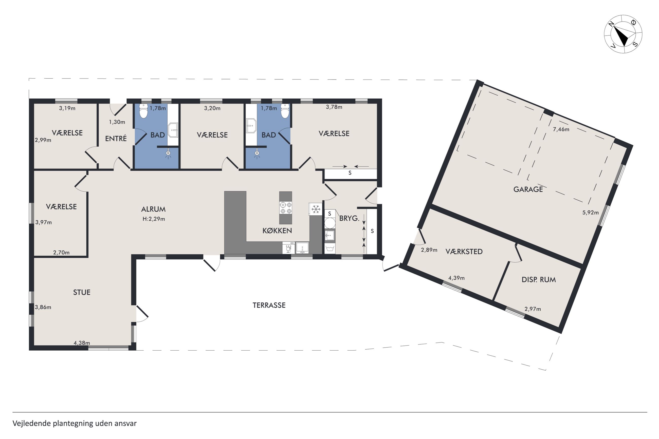 Super velholdt 1-plans villa med kæmpe dobbelt garage - klar til indflytning - med et boligareal på 145 m2 fordelt på 4 værelser, kæmpe alrum, stor stue, 2 badeværelser, entre og bryggers.