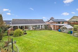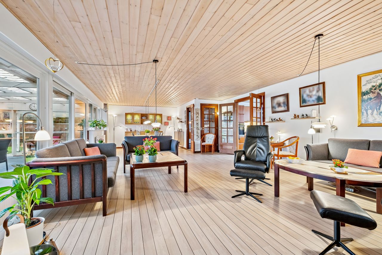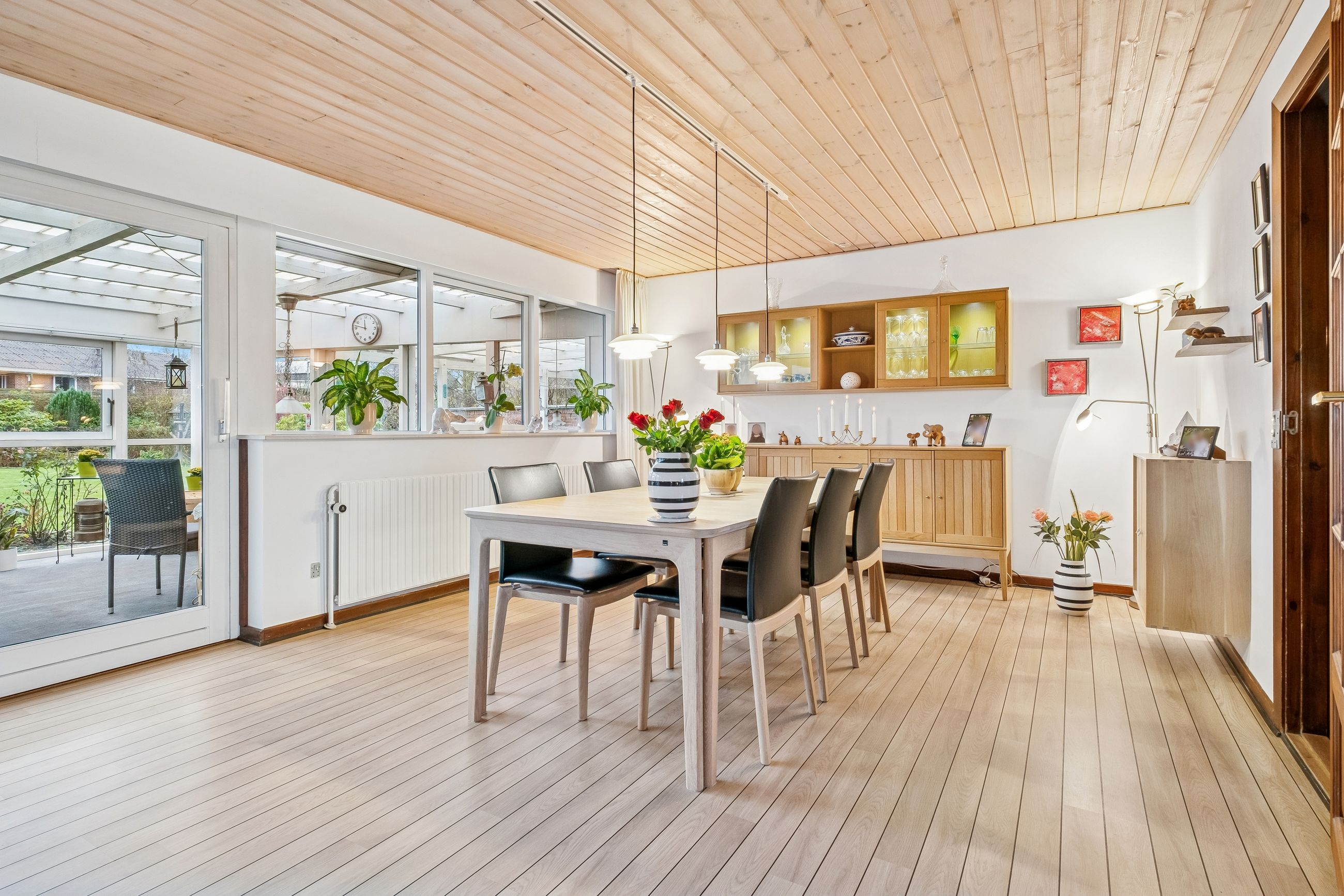 Ejendommen rummer en stor og indbydende stue, der er det ideelle samlingspunkt for familien. Her er en hyggelig brændeovn, perfekt til de køligere måneder, og direkte adgang til en rummelig udestue, som forlænger stuen. Haveafsnittet byder desuden på en skøn terrasse, hvor der er rig mulighed for at nyde udendørslivet i fulde drag. Haven vender selvfølgelig helt perfekt med masser af sol.