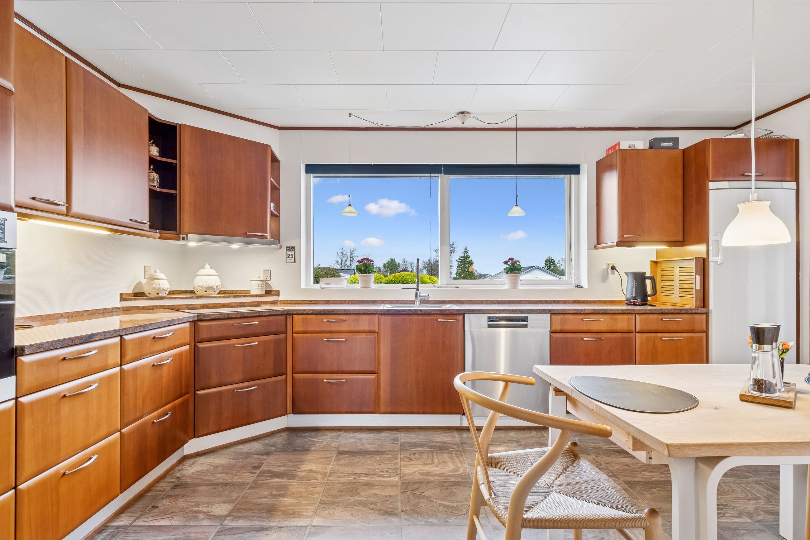 Køkkenet er fra 2002 og er designet som et rummeligt spisekøkken, hvilket gør det til et naturligt værested sammen.