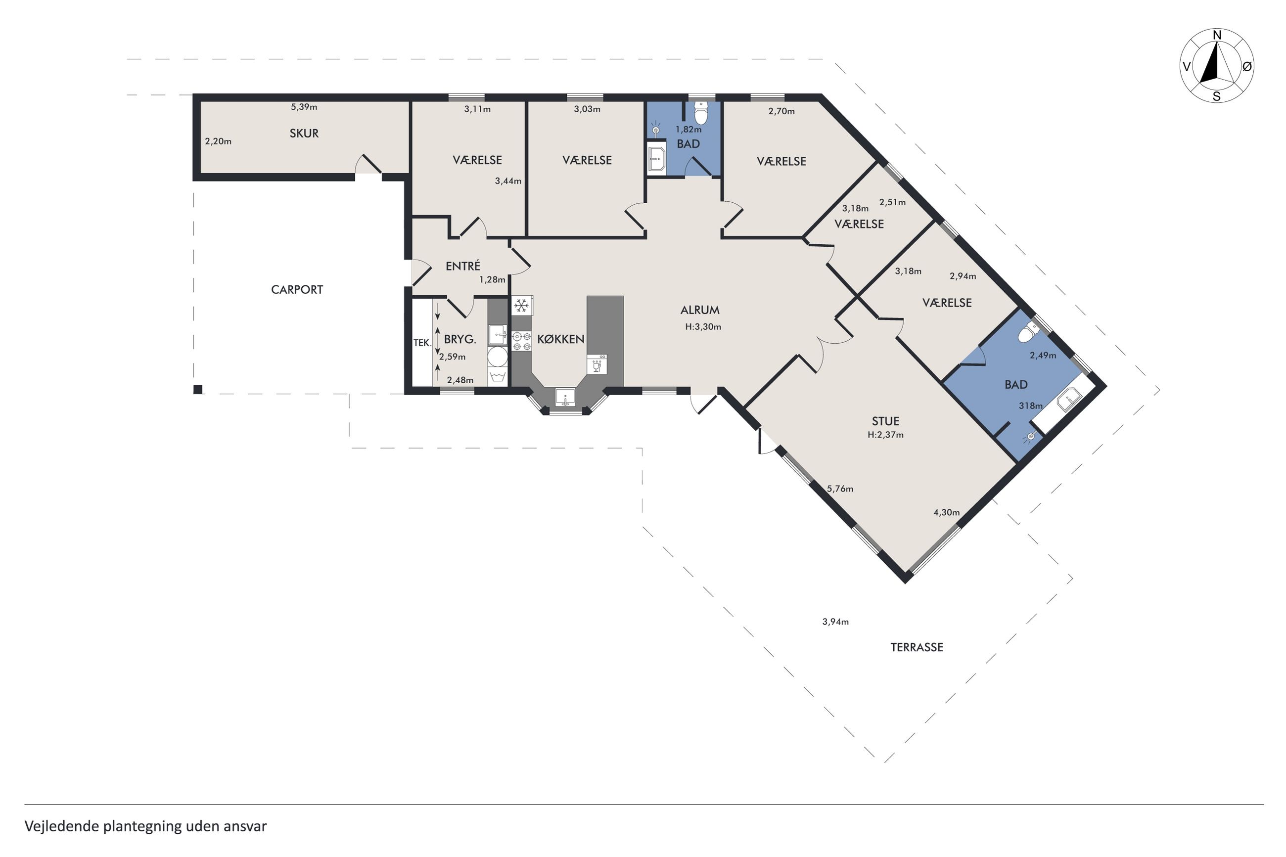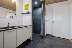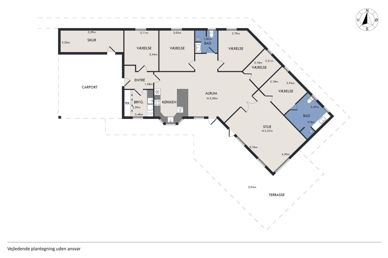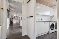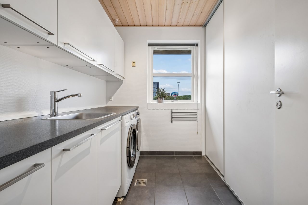 Med sine 155 m2 fordelt på ét plan, byder denne ejendom på hele fem værelser, der åbner op for mange indretningsmuligheder, herunder muligheden for at sammenlægge to værelser og skabe en separat voksenafdeling med et stort soveværelse, badeværelse og walk-in closet. Indretningen indbyder til en ligeså fleksibel som funktionel hverdag. Denne egenskab vil tilfredsstille både børnefamilier og de, der søger et hjem, der tilpasser sig livets forskellige faser.