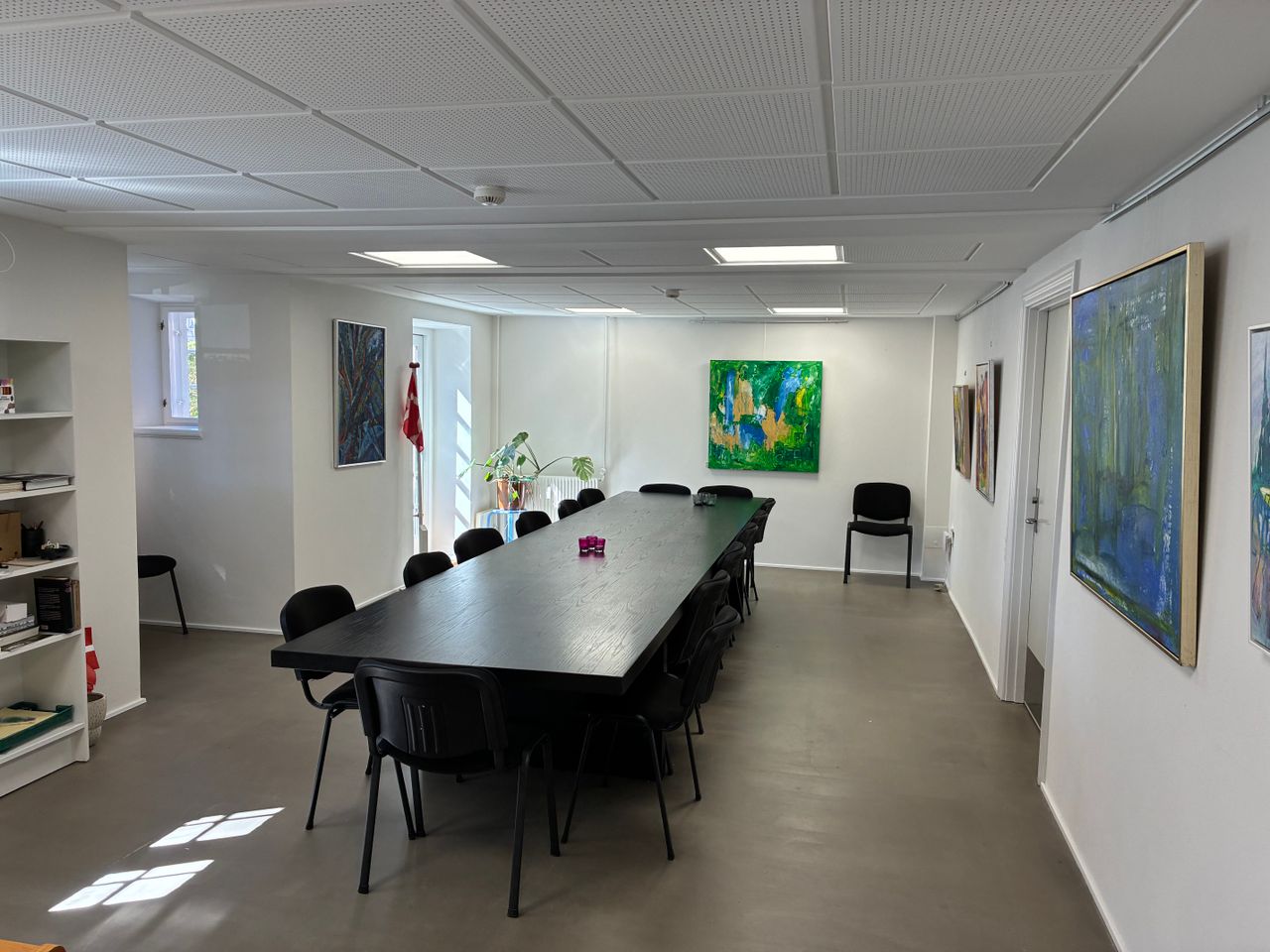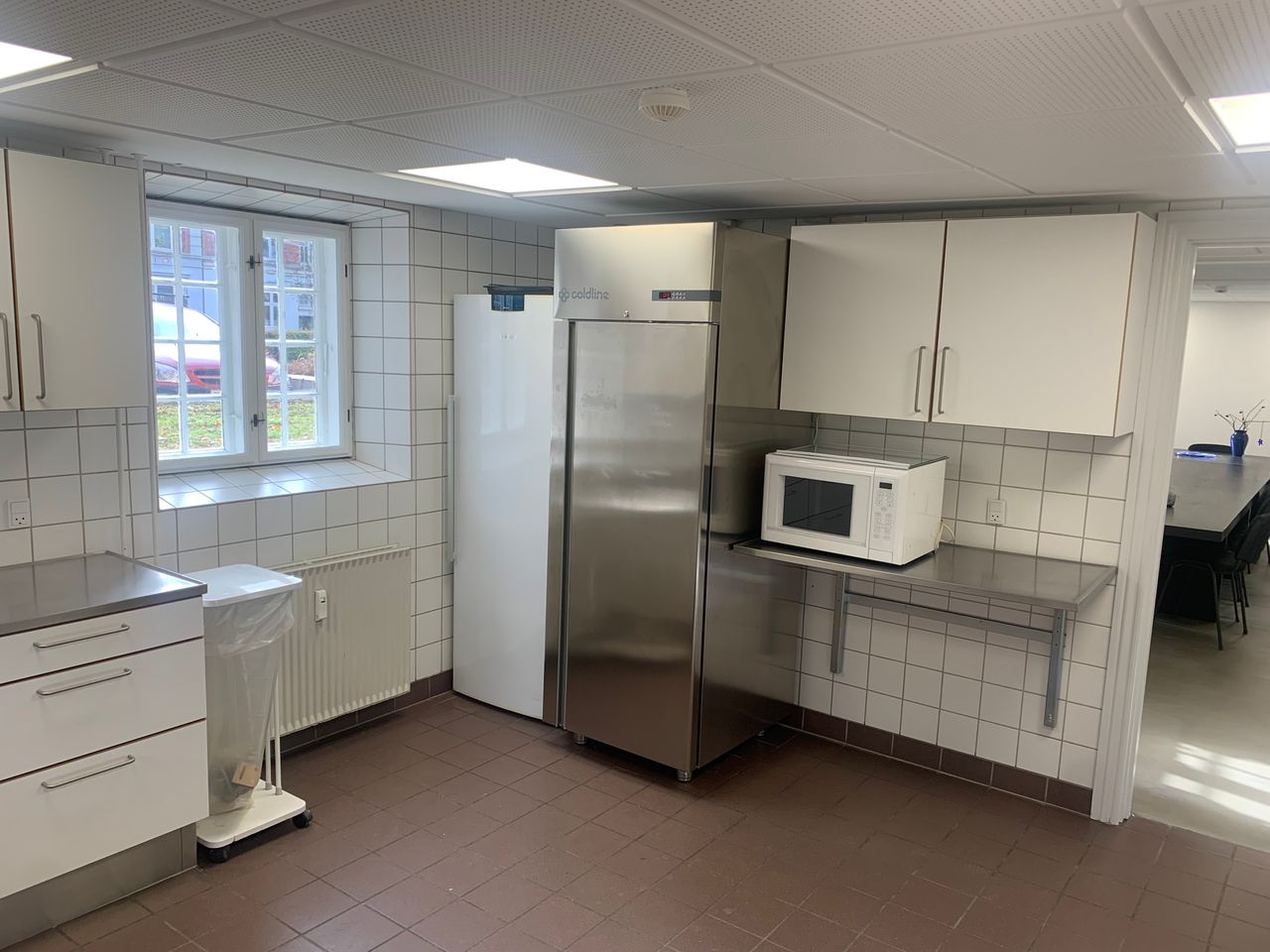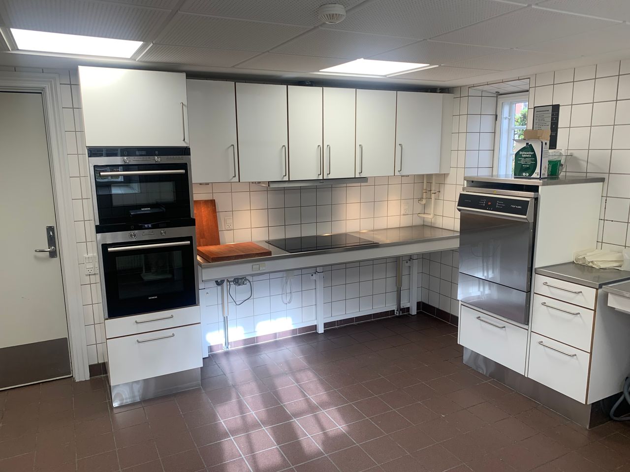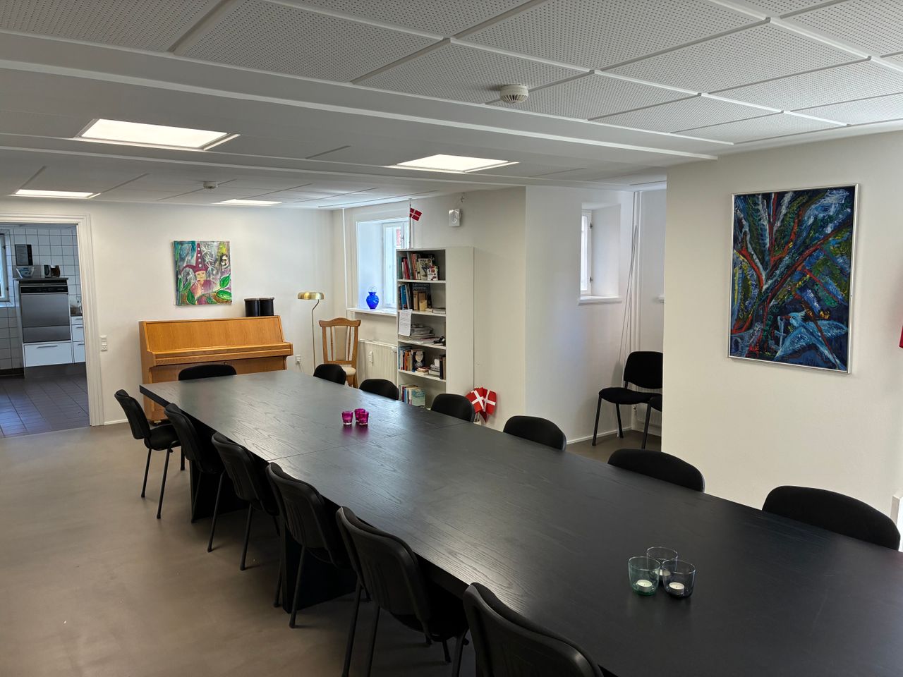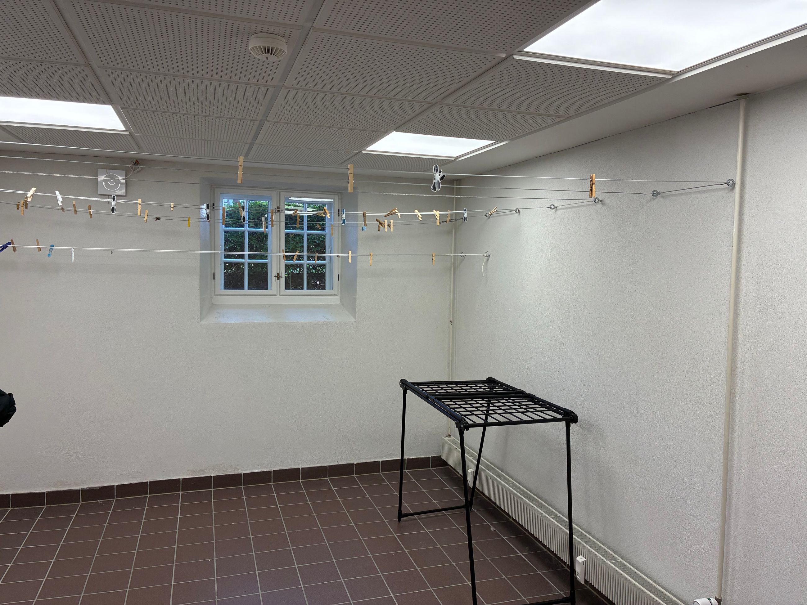 I kælderen er der et stort køkken og et hyggeligt fælleslokale med plads til ca. 20 personer; Oplagt til sammenkomster. Der er også etableret et tørrerum til beboernes brug.