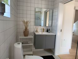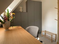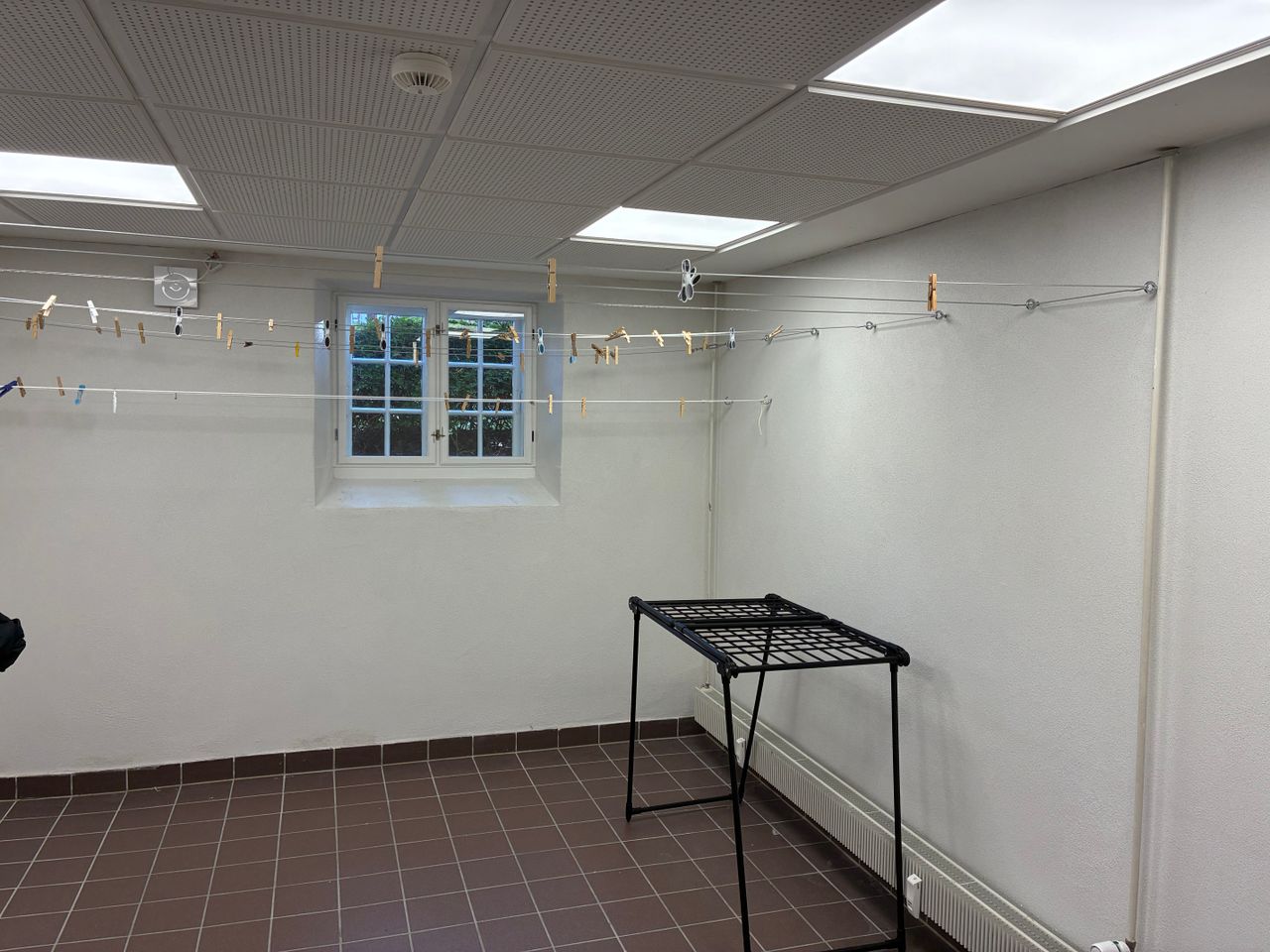 I kælderen er der et stort køkken og et hyggeligt fælleslokale med plads til ca. 20 personer – oplagt til sammenkomster. Der er også etableret et tørrerum til beboernes brug.