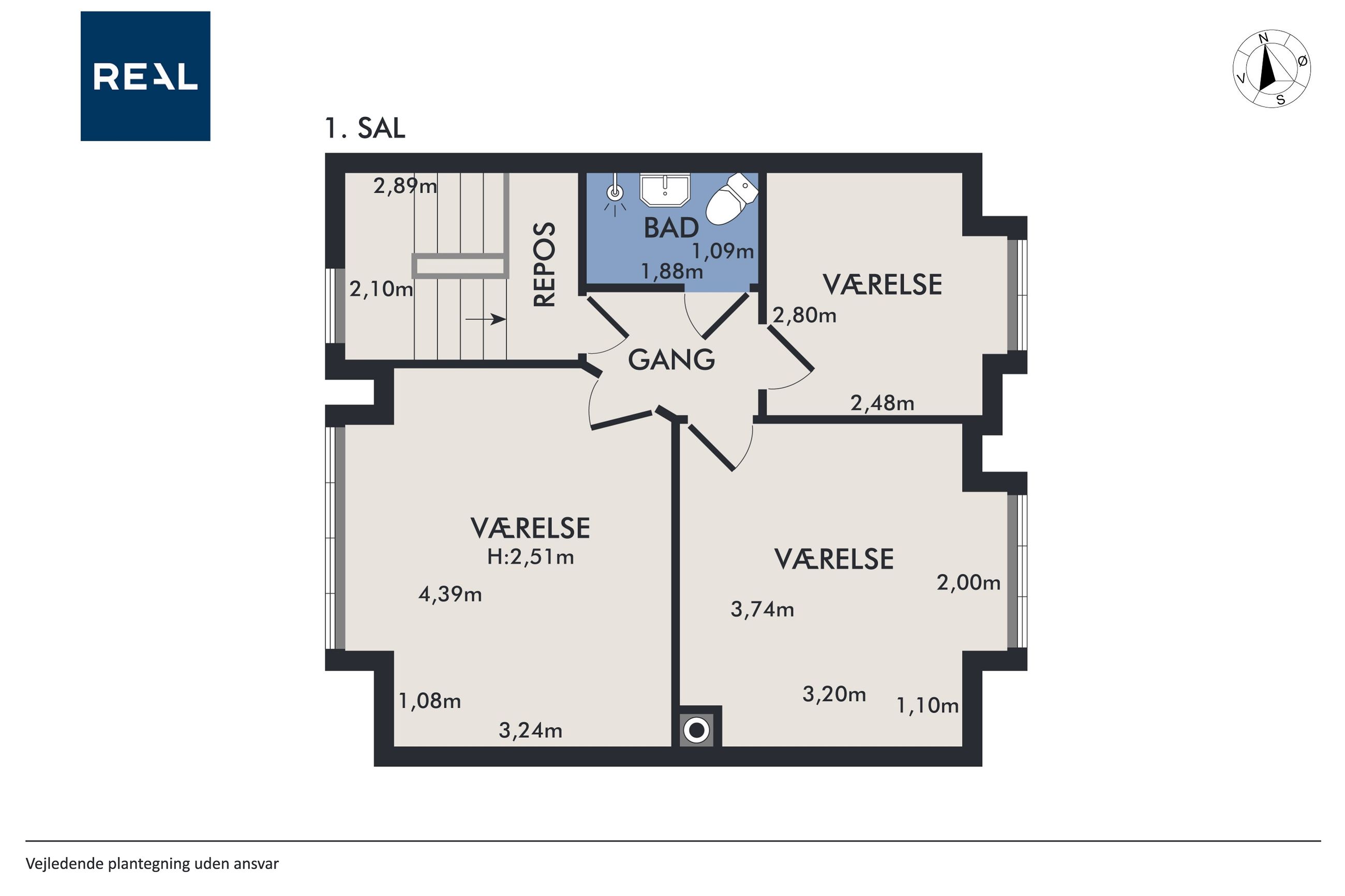 På første sal finder du tre gode værelser, som kan anvendes efter behov – hvad enten det er som soveværelser, kontor eller hobbyrum. Et badeværelse med bruseniche sikrer komforten på denne etage og gør morgenerne mere bekvemme for hele familien.