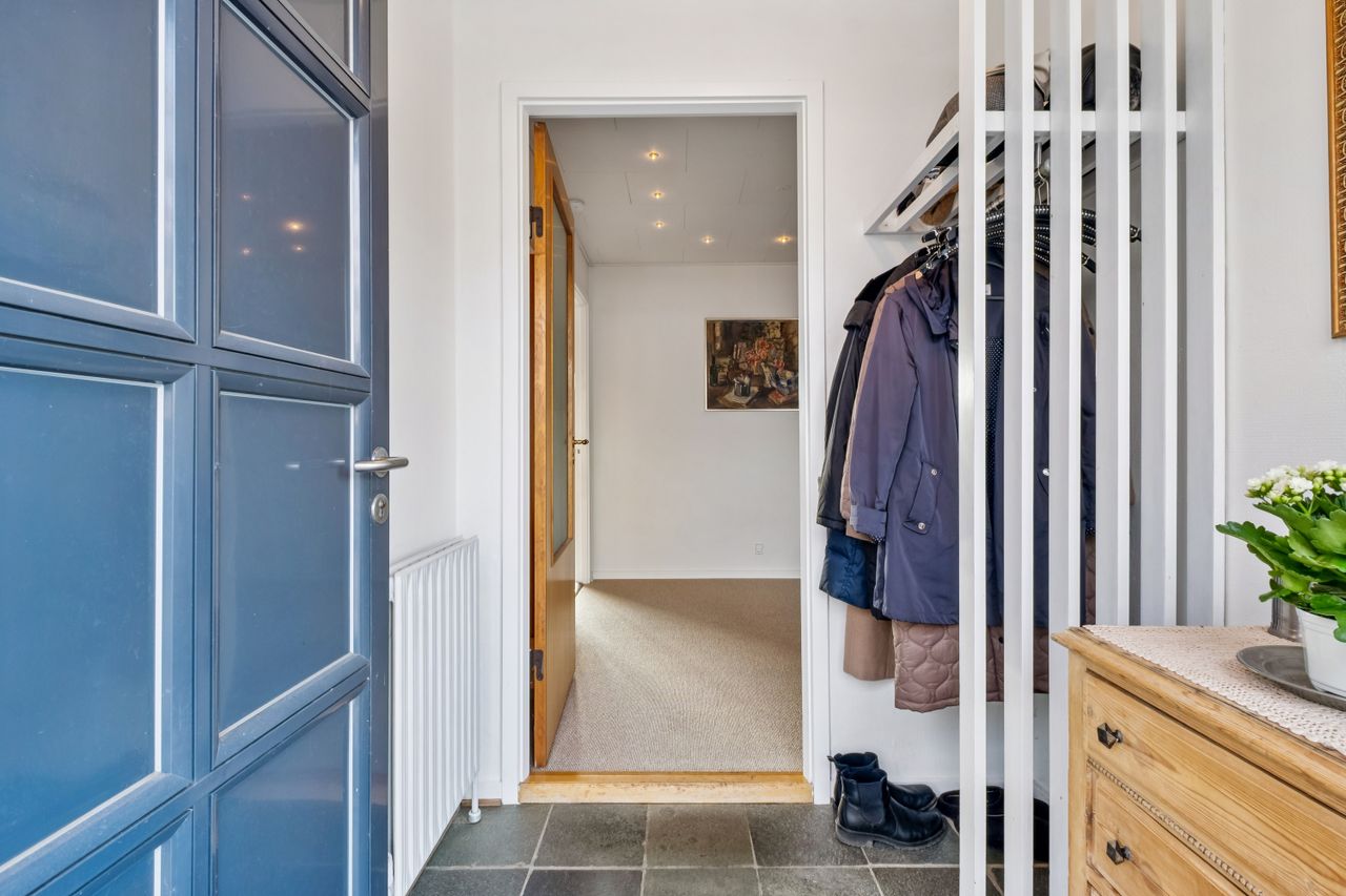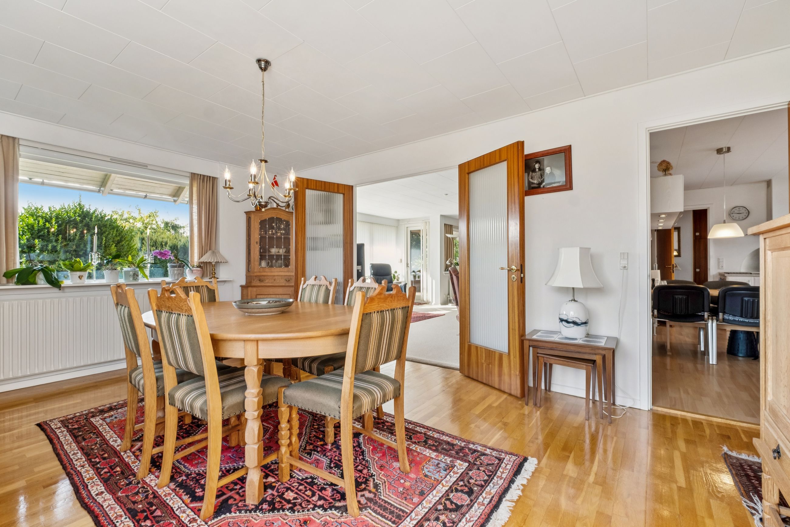 Fra det øjeblik du træder ind ad døren, bliver du mødt af en stor og rummelig entre med rigelig plads til sko og overtøj. Denne entre leder dig videre ind i hjemmets hjerte – den store stue. Stuen er lys og rummelig med direkte udgang til en syd/vest vendt terrasse, hvor man kan nyde solen fra morgen til aften. Terrassen er ideel til hyggelige grillaftener eller afslapning med udsigt over den smukt anlagte have. I forlængelse af stuen ligger endnu en stue, som i dag bruges som spisestue; et oplagt sted at samle familie og venner omkring middagsbordet.
