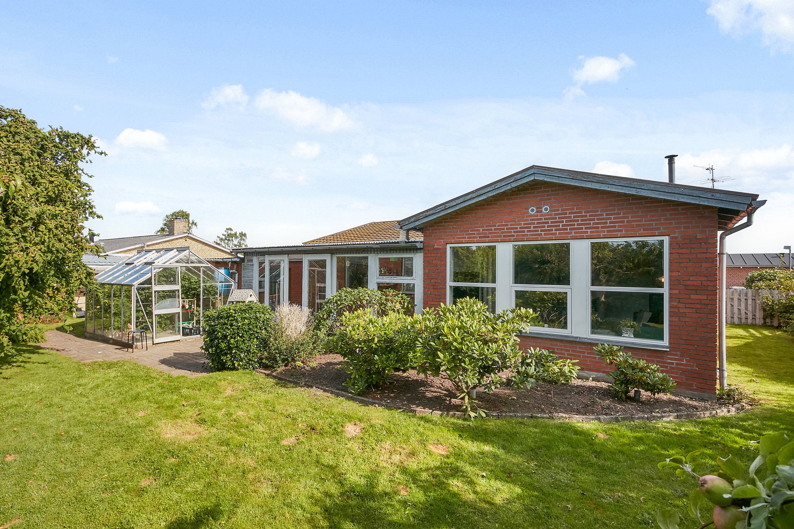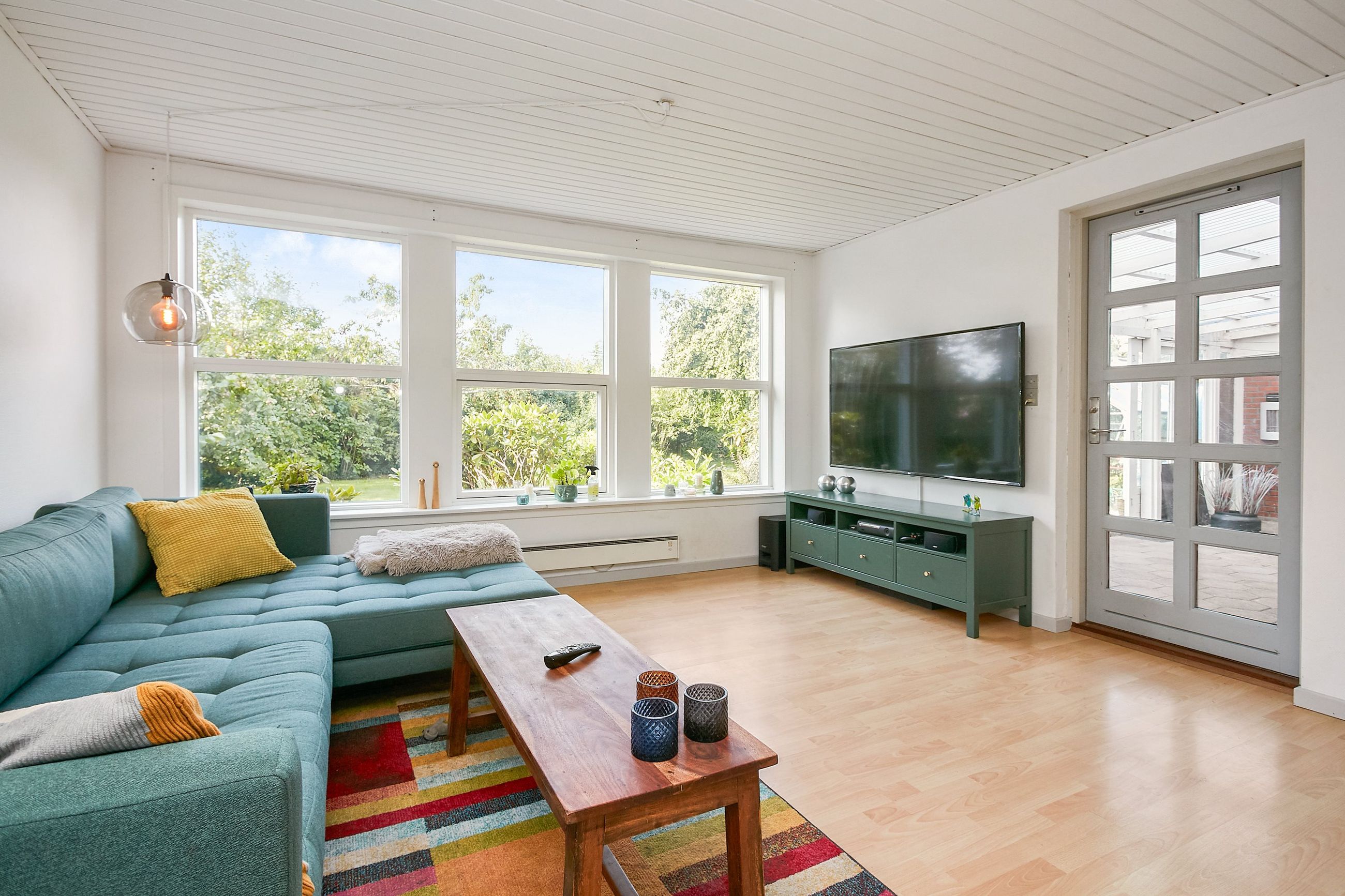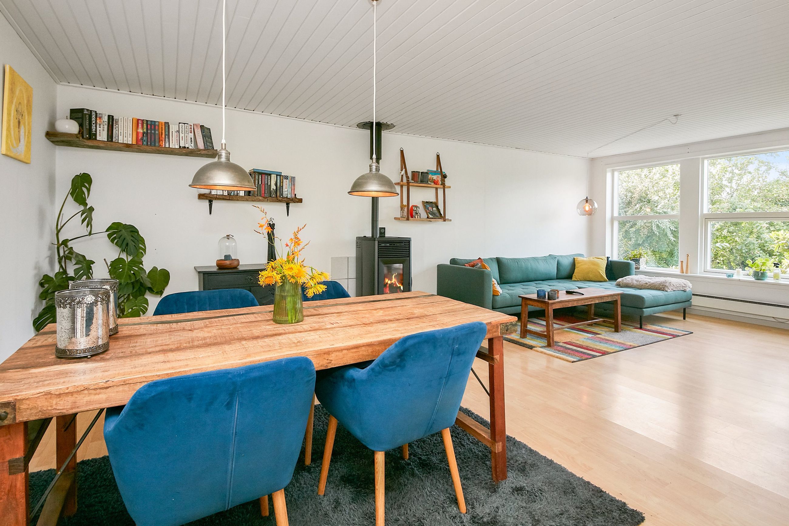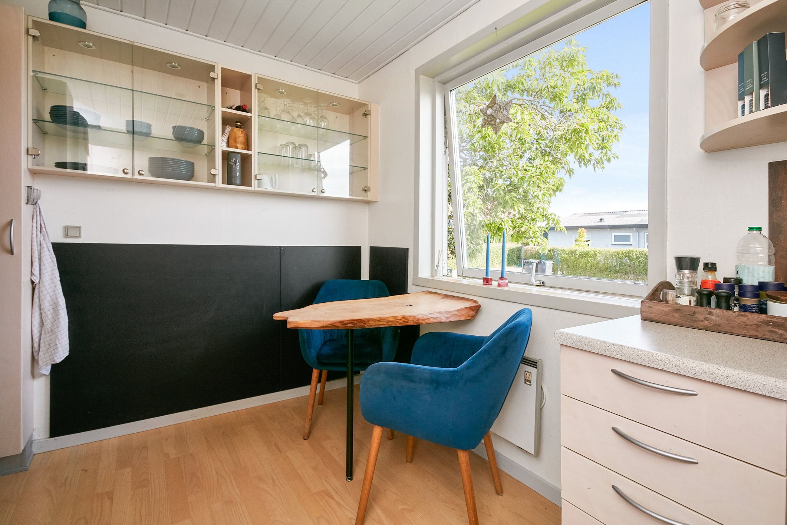 Når du træder ind ad døren, mødes du af en indbydende entre, der fører dig videre ind i huset som indeholder en rummelige stue, her er der rigelig plads til både spisebord og sofaarrangement. Det store vinduesparti sørger for et flot naturligt lysindfald hele dagen igennem, mens pillebrændeovnen tilfører ekstra varme og hygge på de køligere dage. Fra stuen er der direkte udgang til en charmerende udestue.