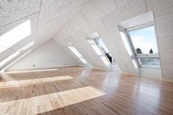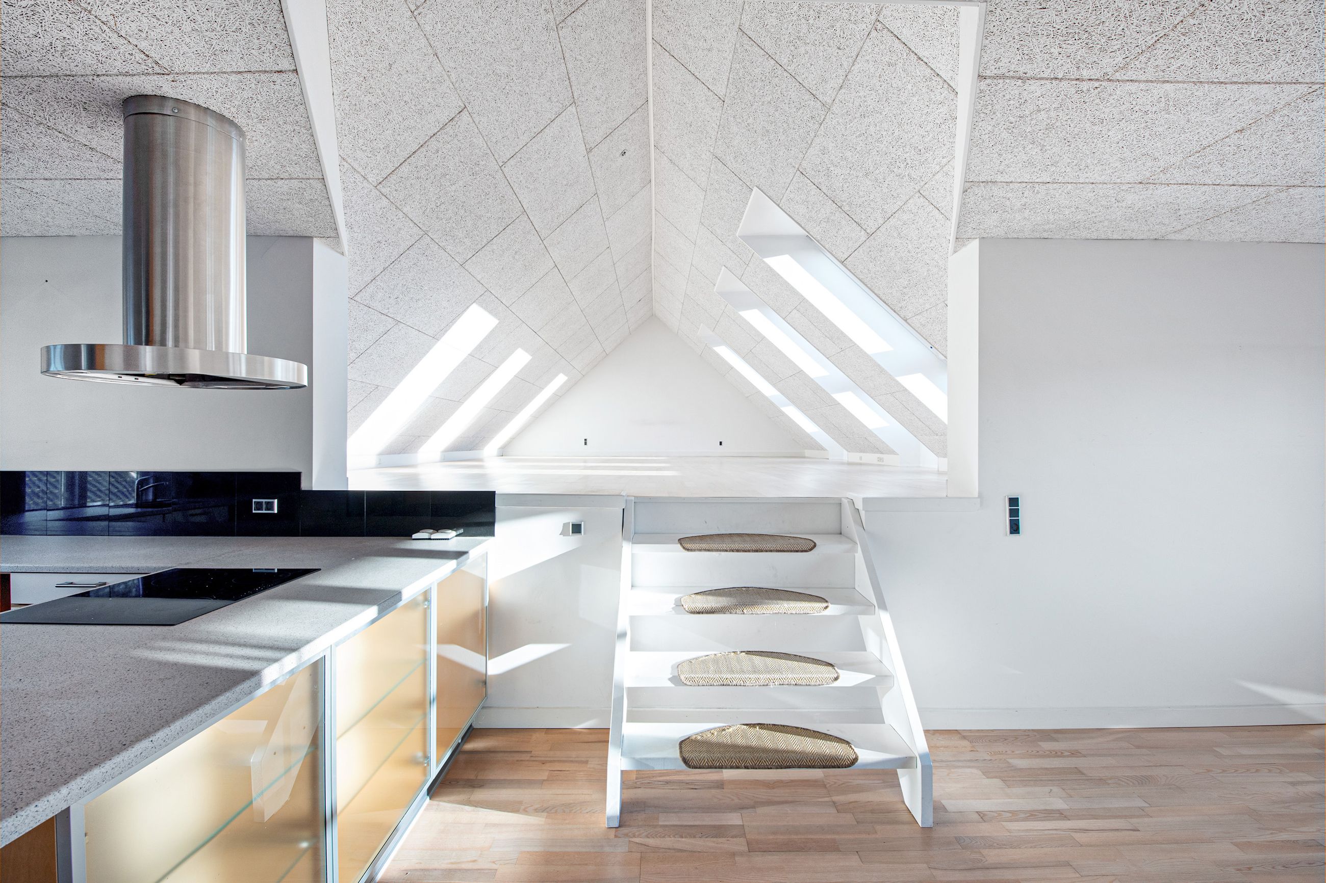 loftet er beklædt med troldtekt og de store veluxvinduer giver et behageligt lysindfald. Alle