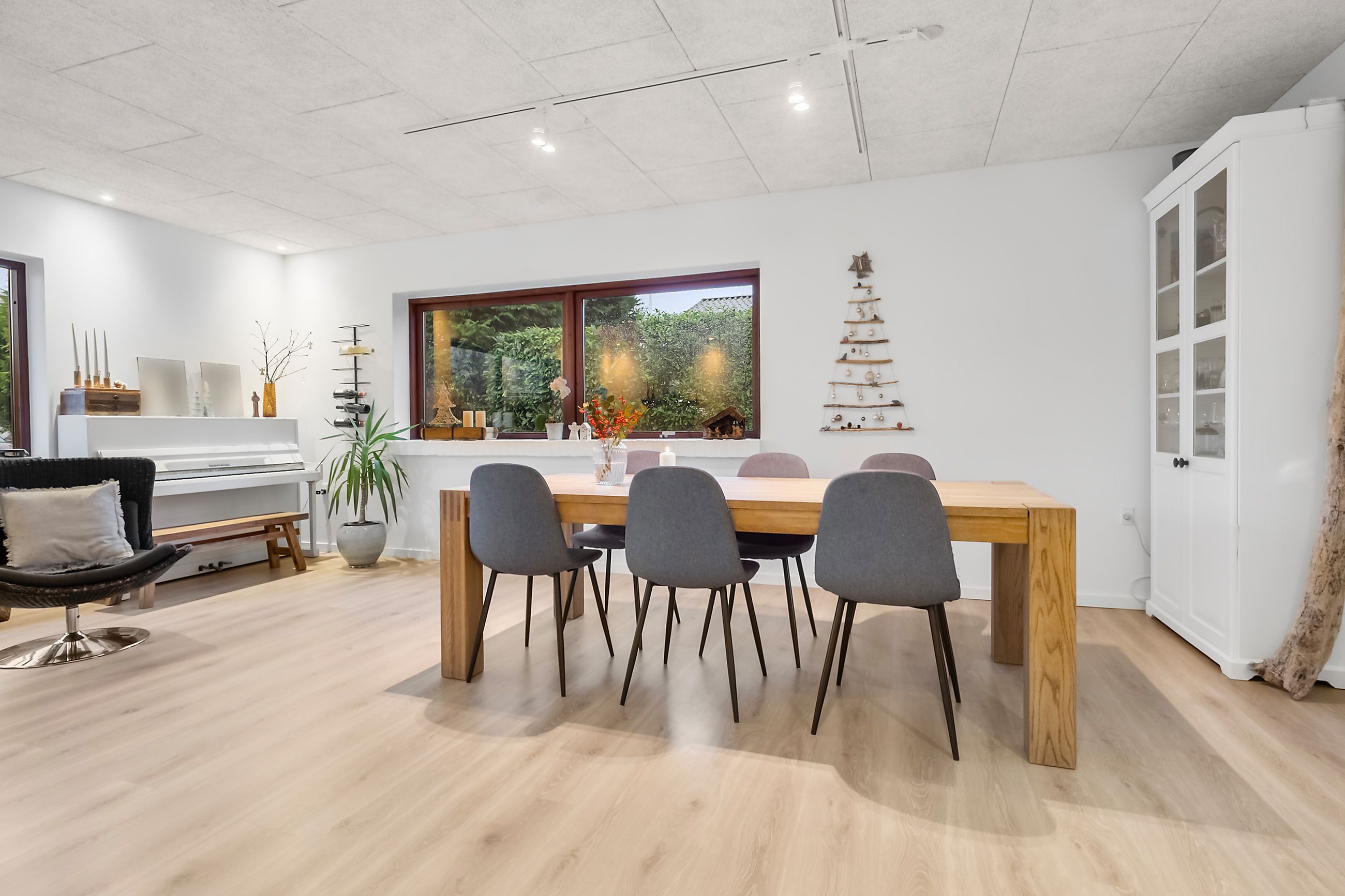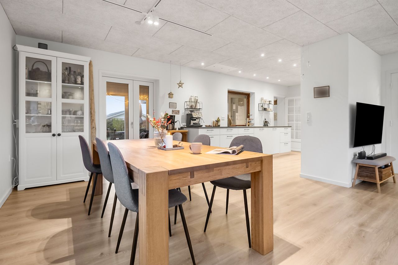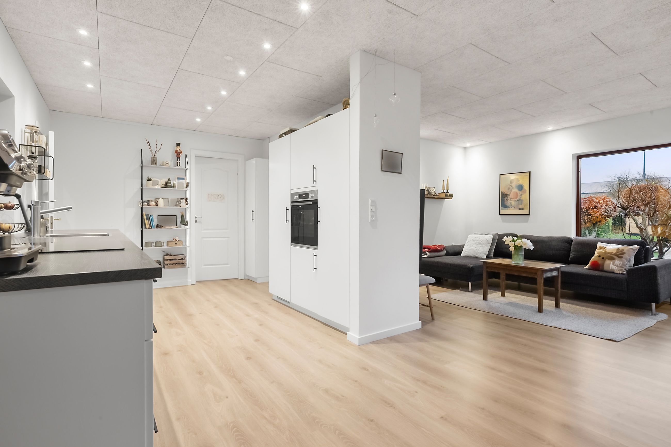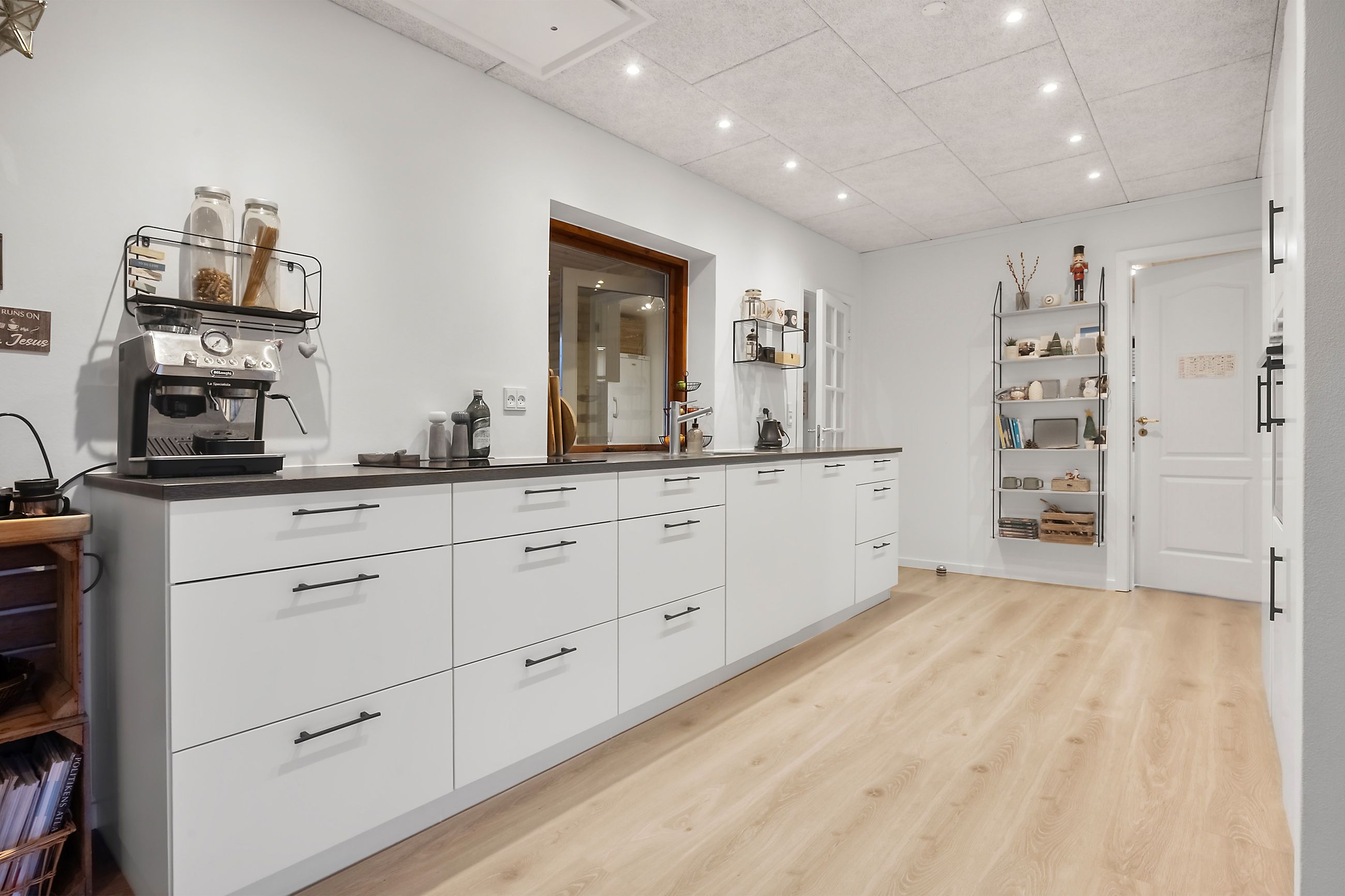Allerede når du træder indenfor, fornemmer du den gode planløsning, hvor rummelighed og funktionalitet går hånd i hånd. Det renoverede køkken/alrum er husets naturlige samlingspunkt – et lyst og åbent rum, hvor familien kan mødes til måltider, lektier ved bordet eller hyggelige aftener med venner. Herfra er der nem adgang til både stue og udestue. Udestuen forlænger sommeren og giver en ekstra dimension til boligen, hvor du kan nyde haven, lyset og årstidernes skiften. Der er installeret gulvvarme i hele køkkenet og stuen, samt opsat troldtektslofter.