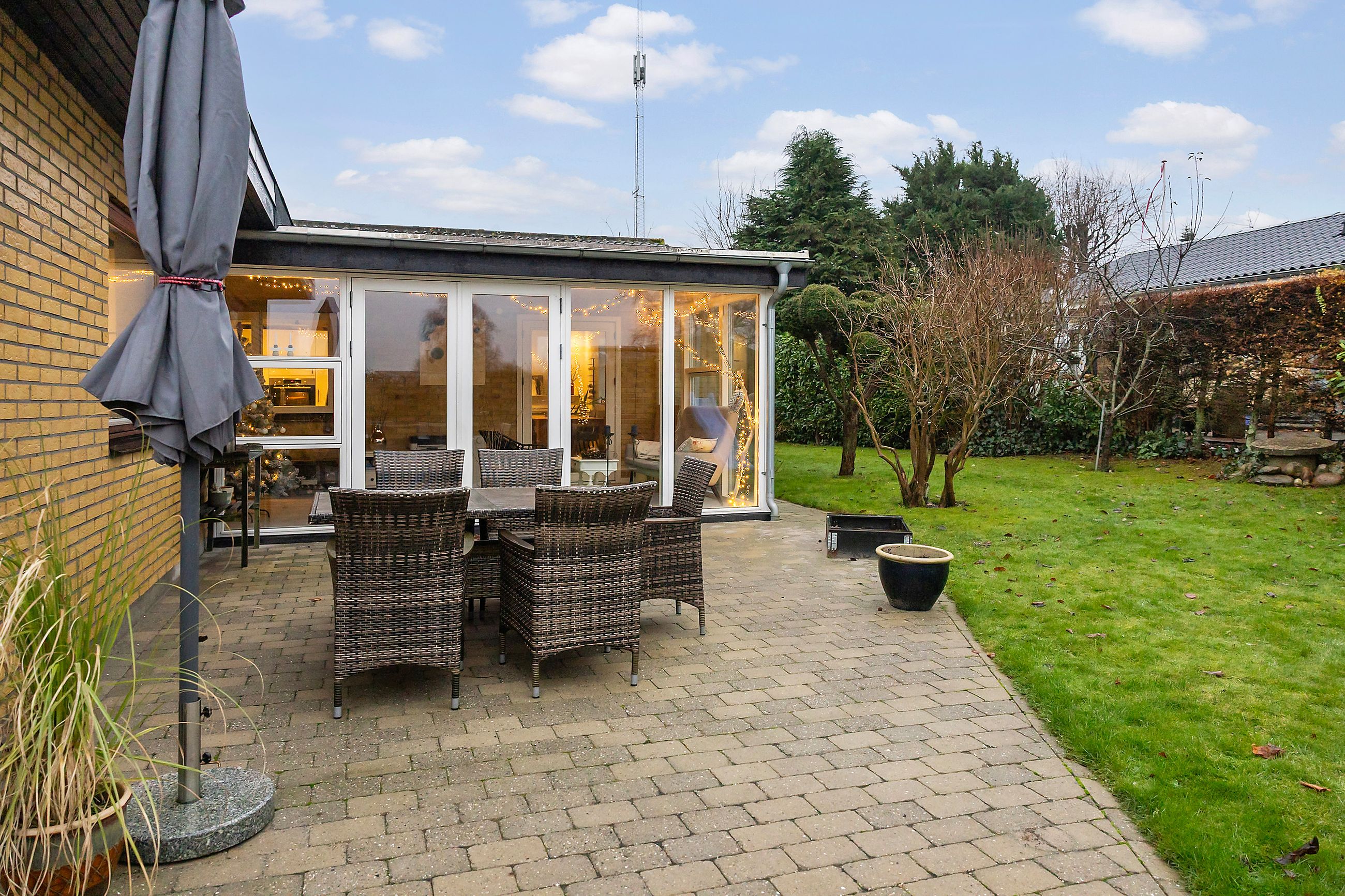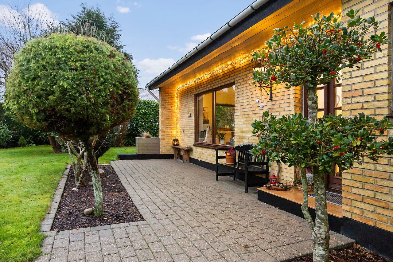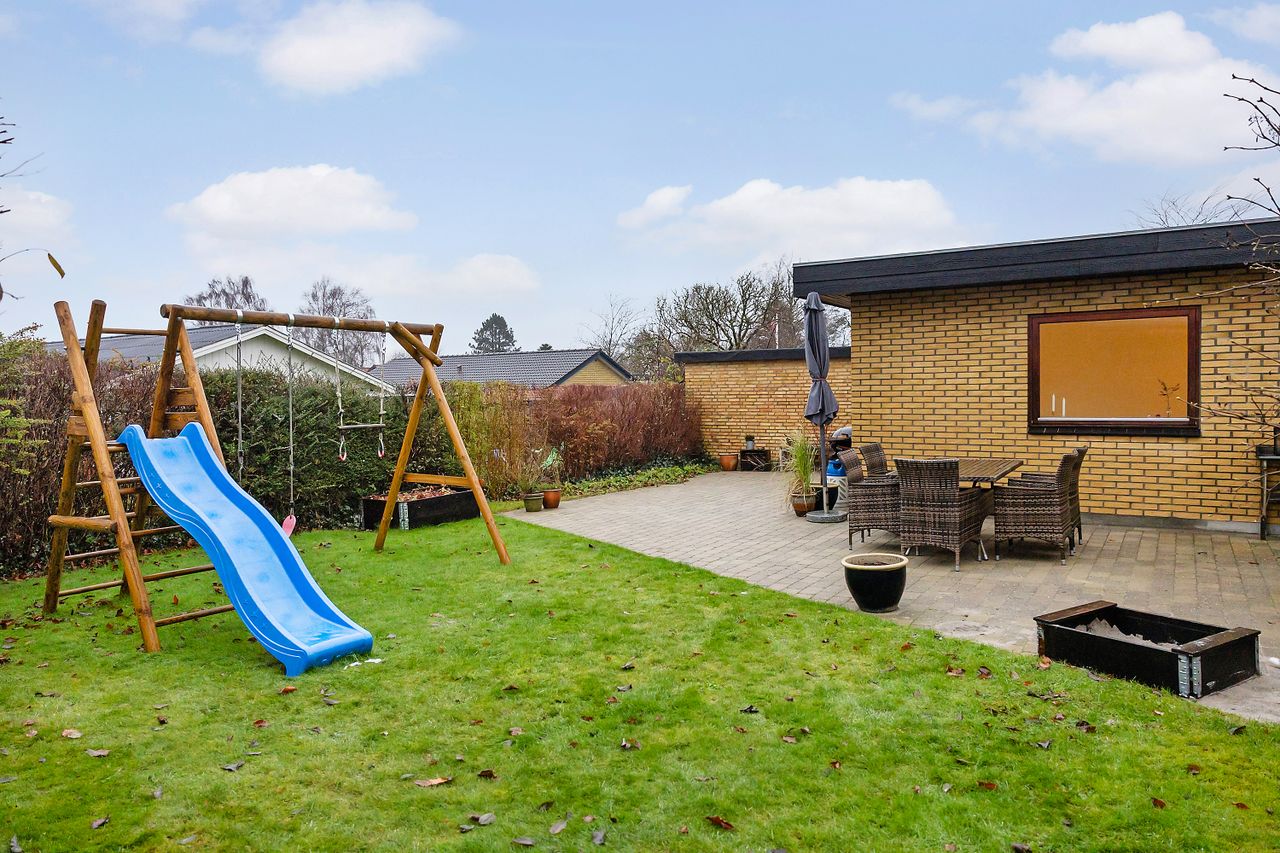 Udenfor venter en overskuelig og velholdt have, der både indbyder til leg, afslapning og hyggelige grillaftener. Her er plads til at børnene kan boltre sig, samtidig med at de voksne kan finde ro og fordybelse i grønne omgivelser.