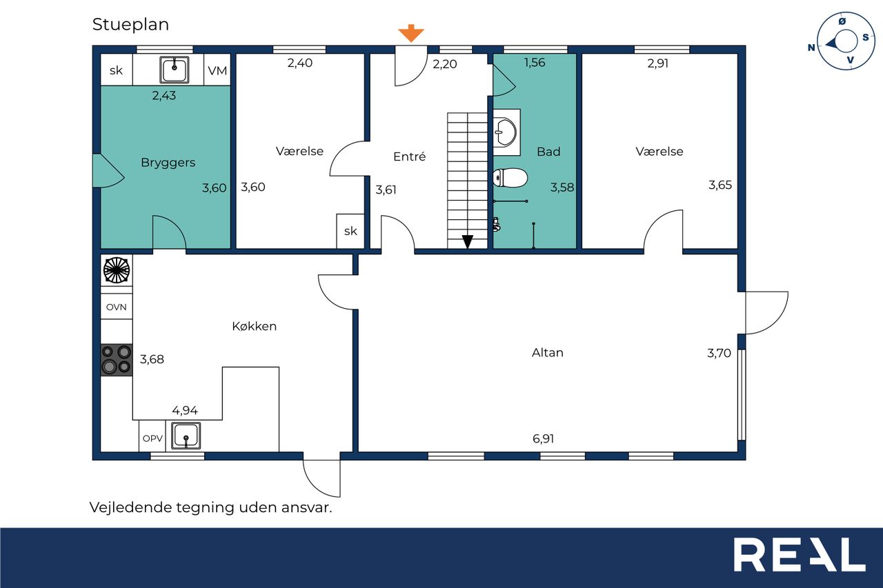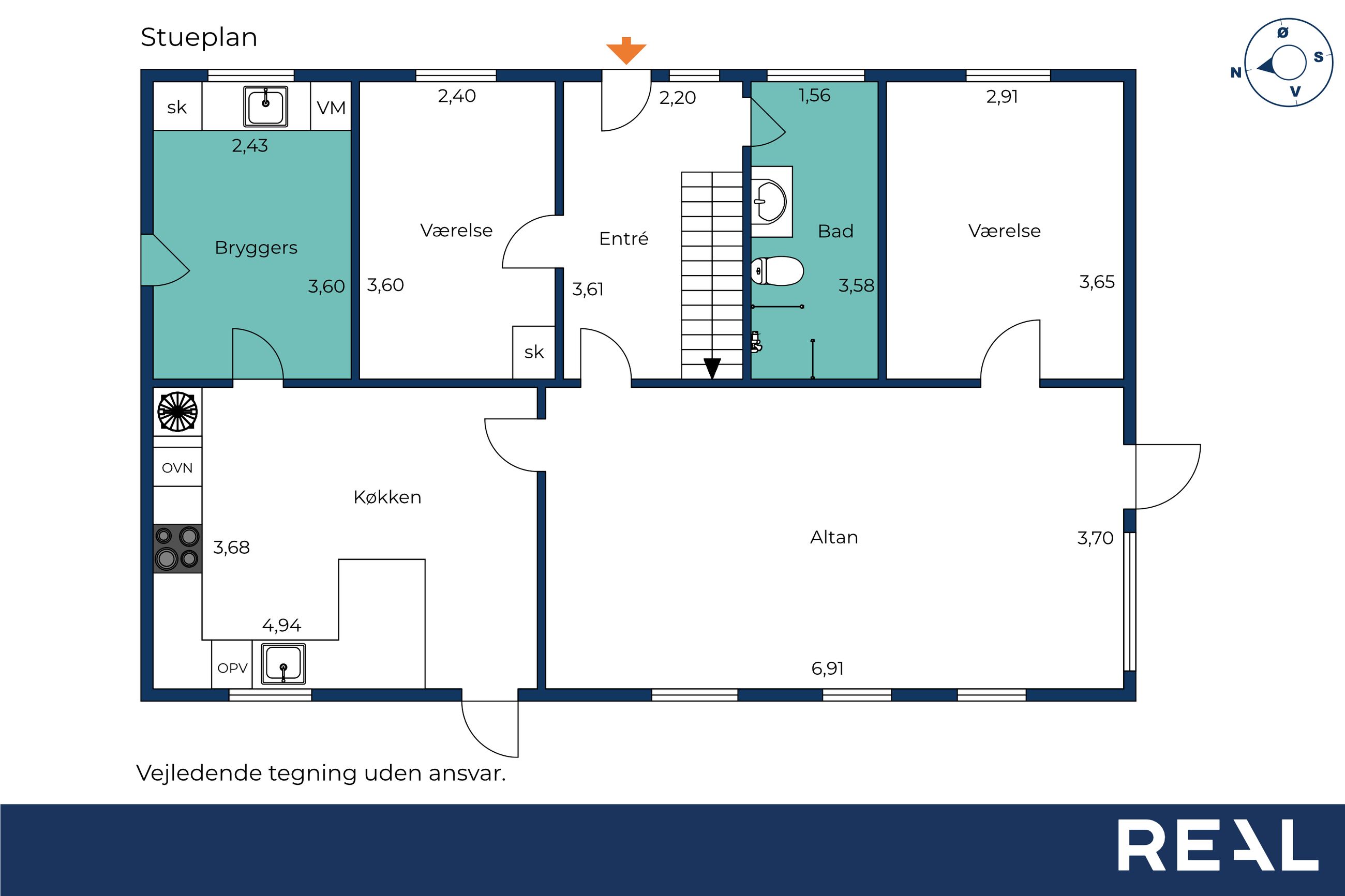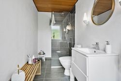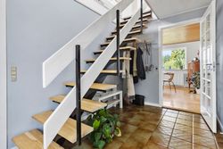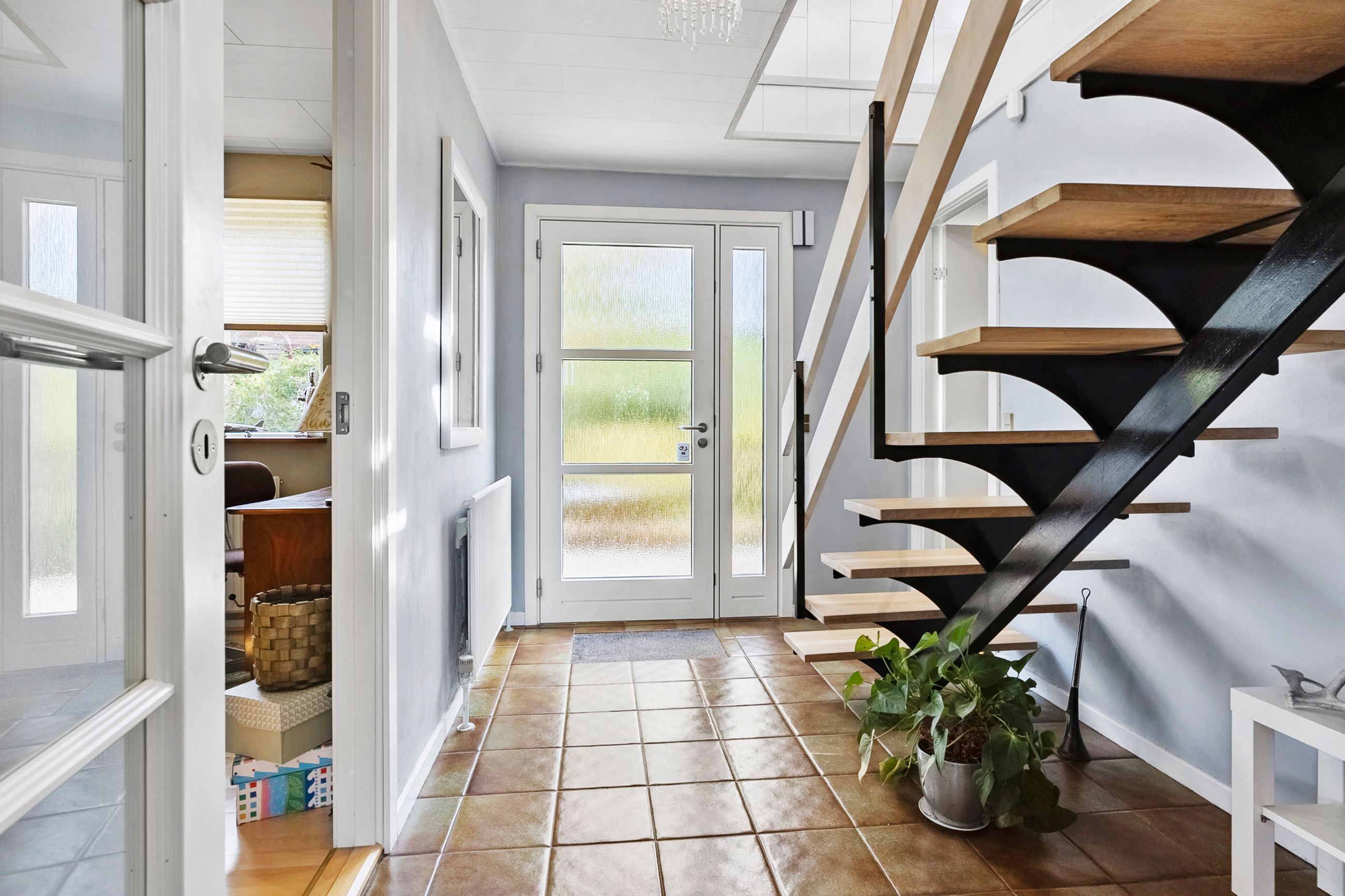Når man træder ind i villaen bliver man mødt af en lys entré. I stueplan finder man desuden et stort nyere gæstetoilet med brus. Endvidere er det 2 gode værelser.