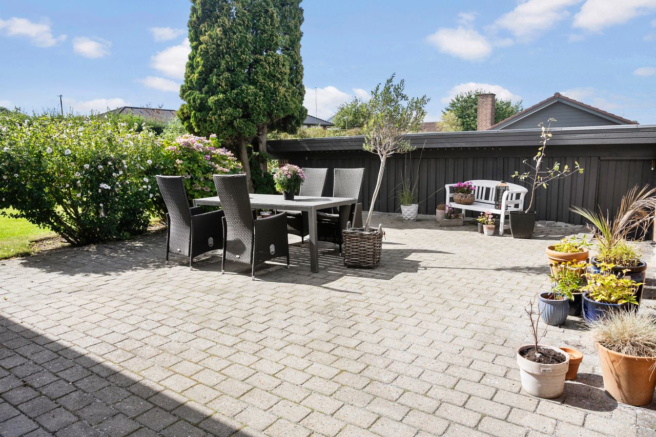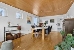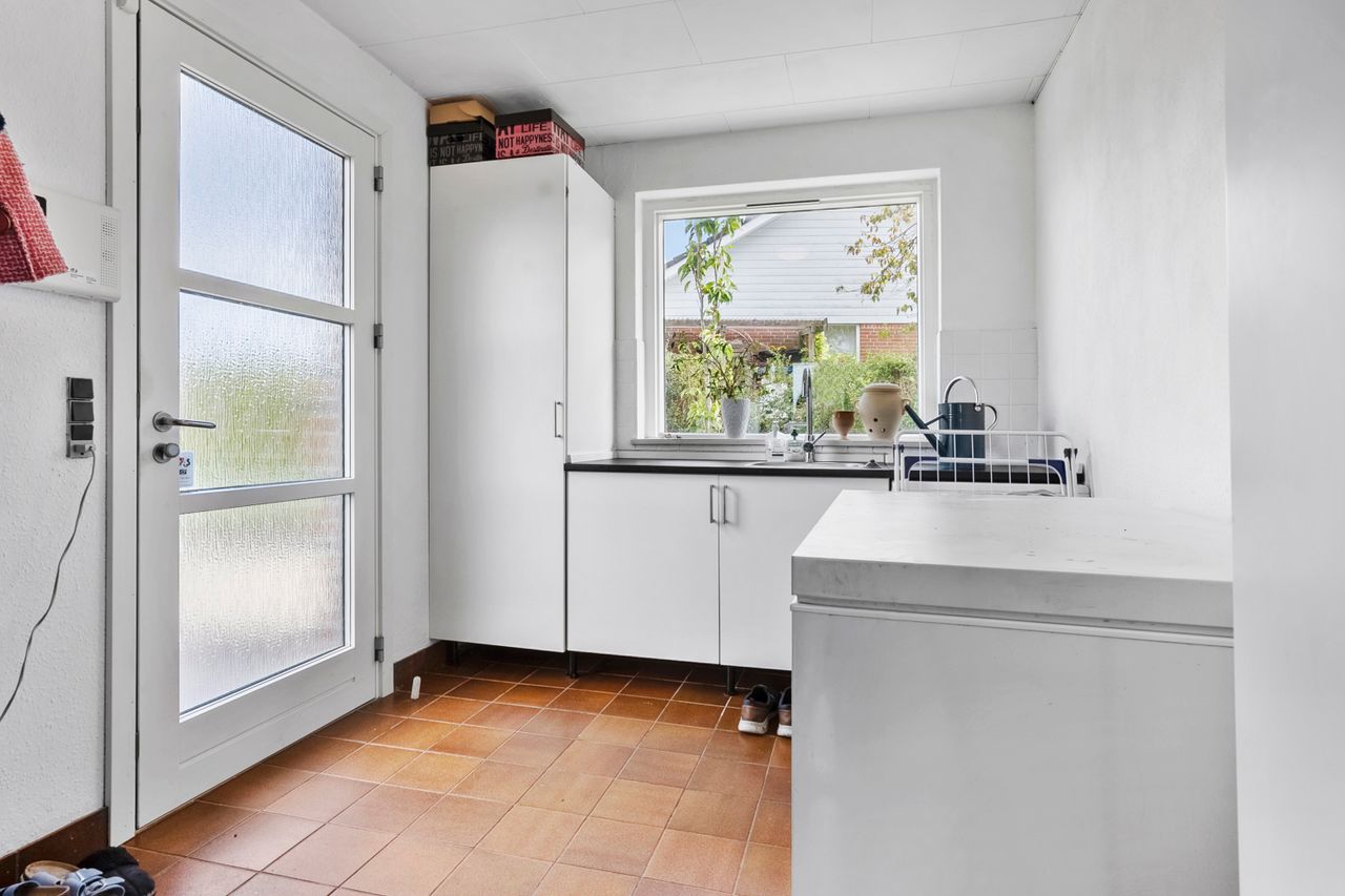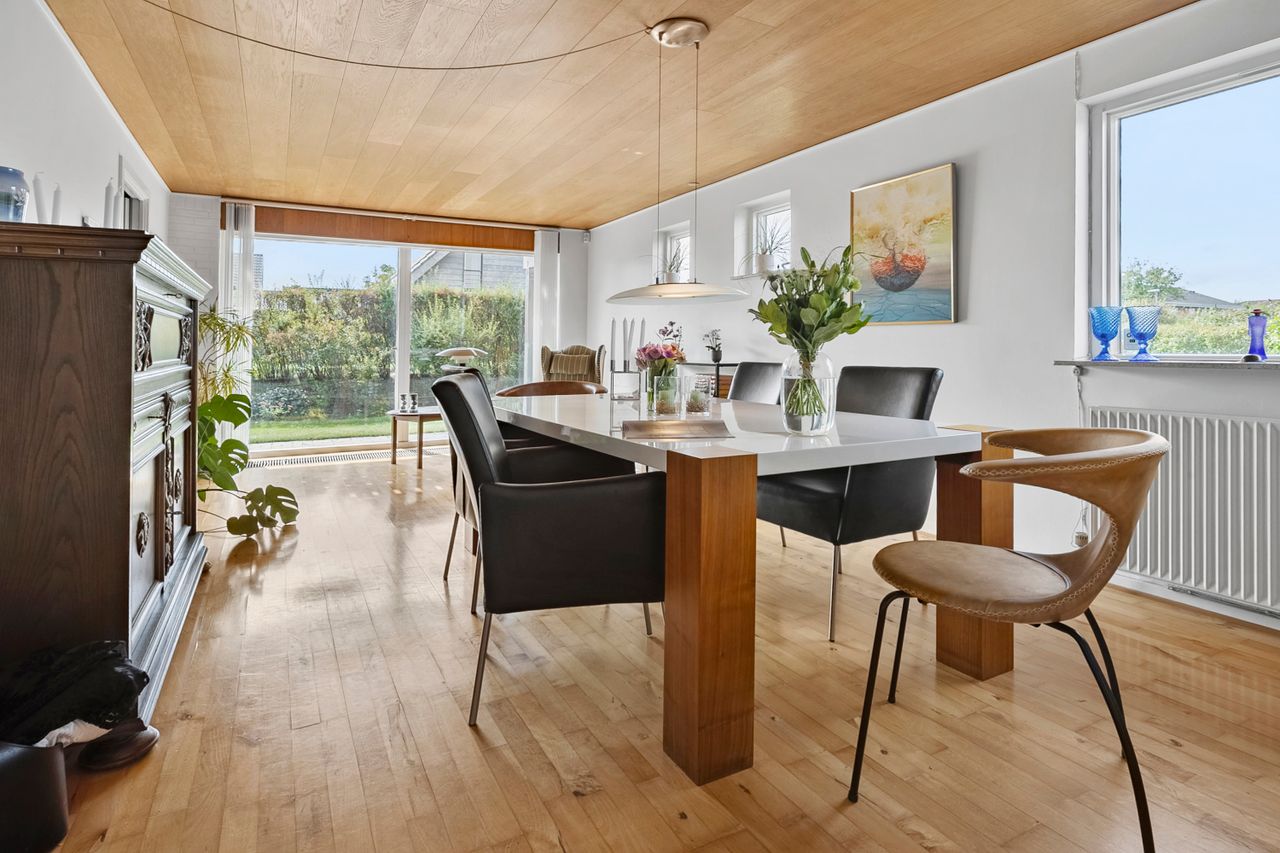 Der er en stor spisestue med direkte udgang til terrasse. I forbindelse med spisestuen kommer man ud i et stort funktionelt køkken med direkte udgang til dejlig lukket solgård. Der er også et større bryggers med bagindgang.