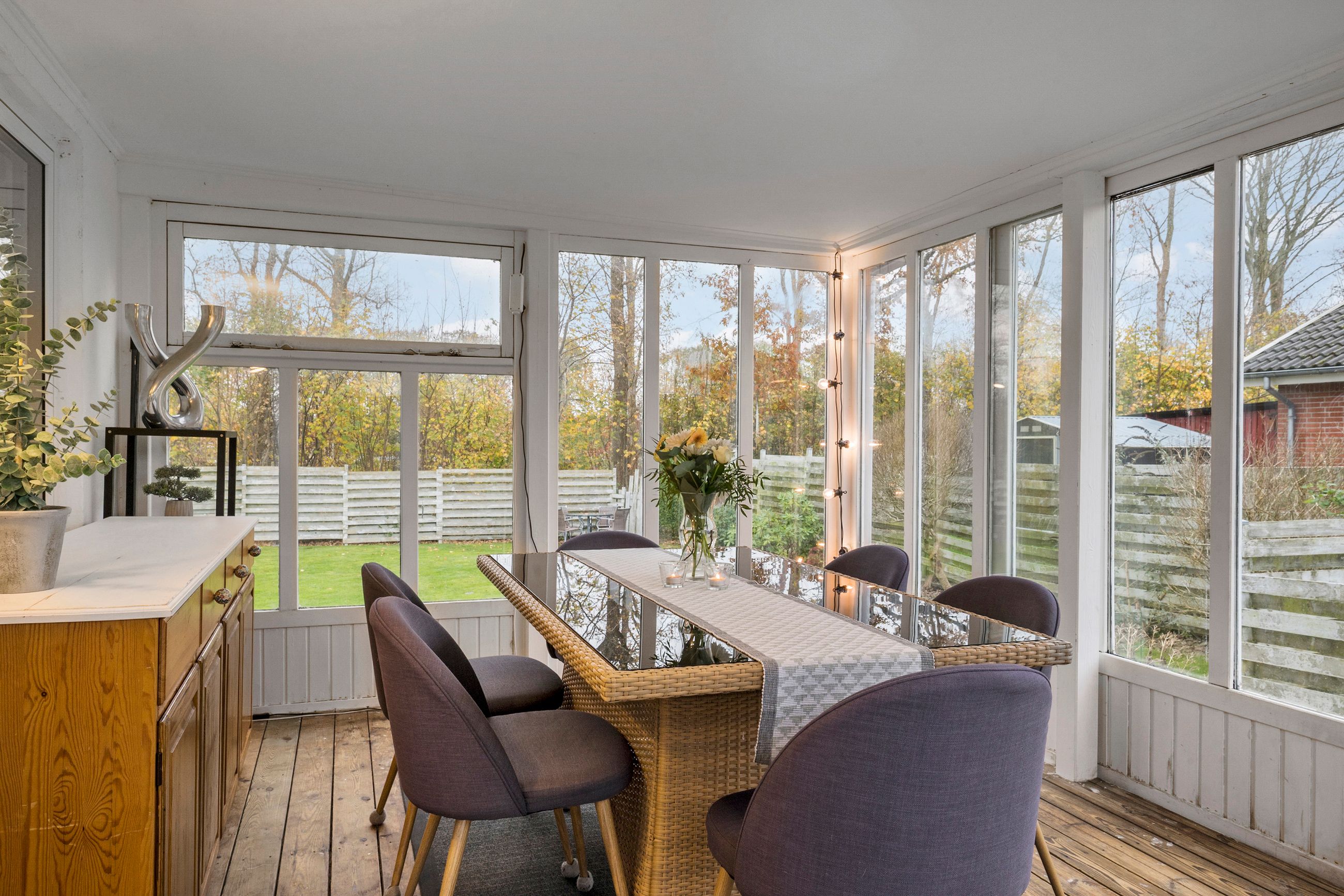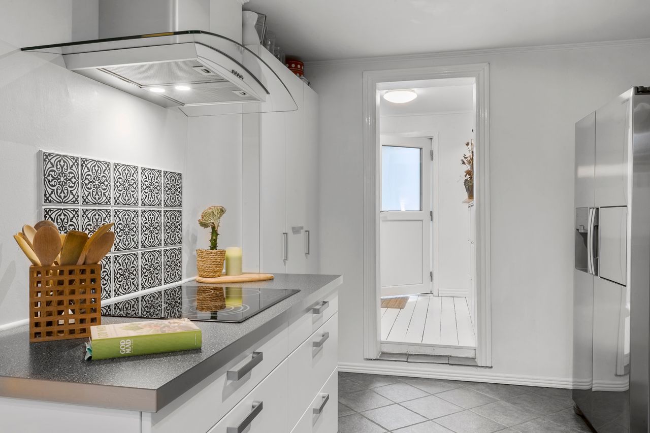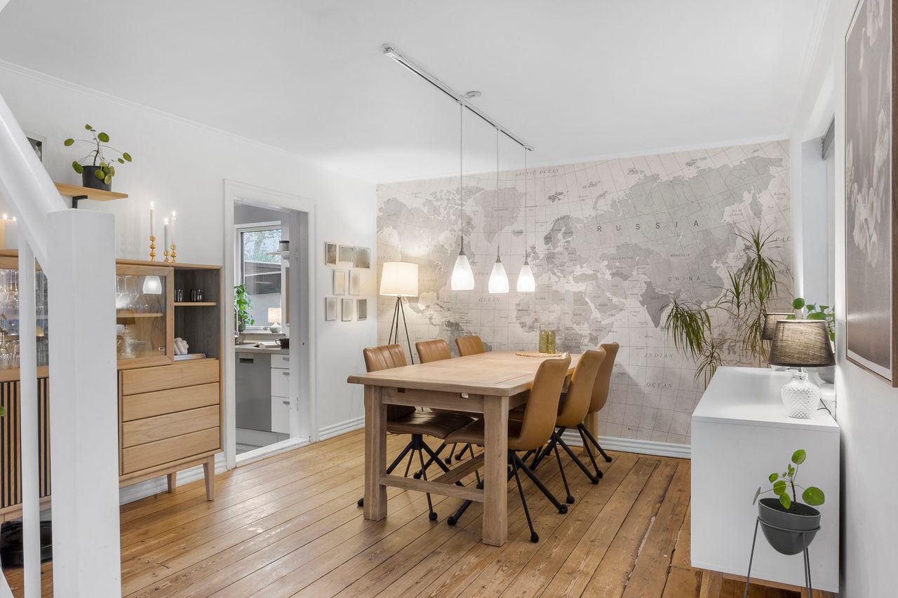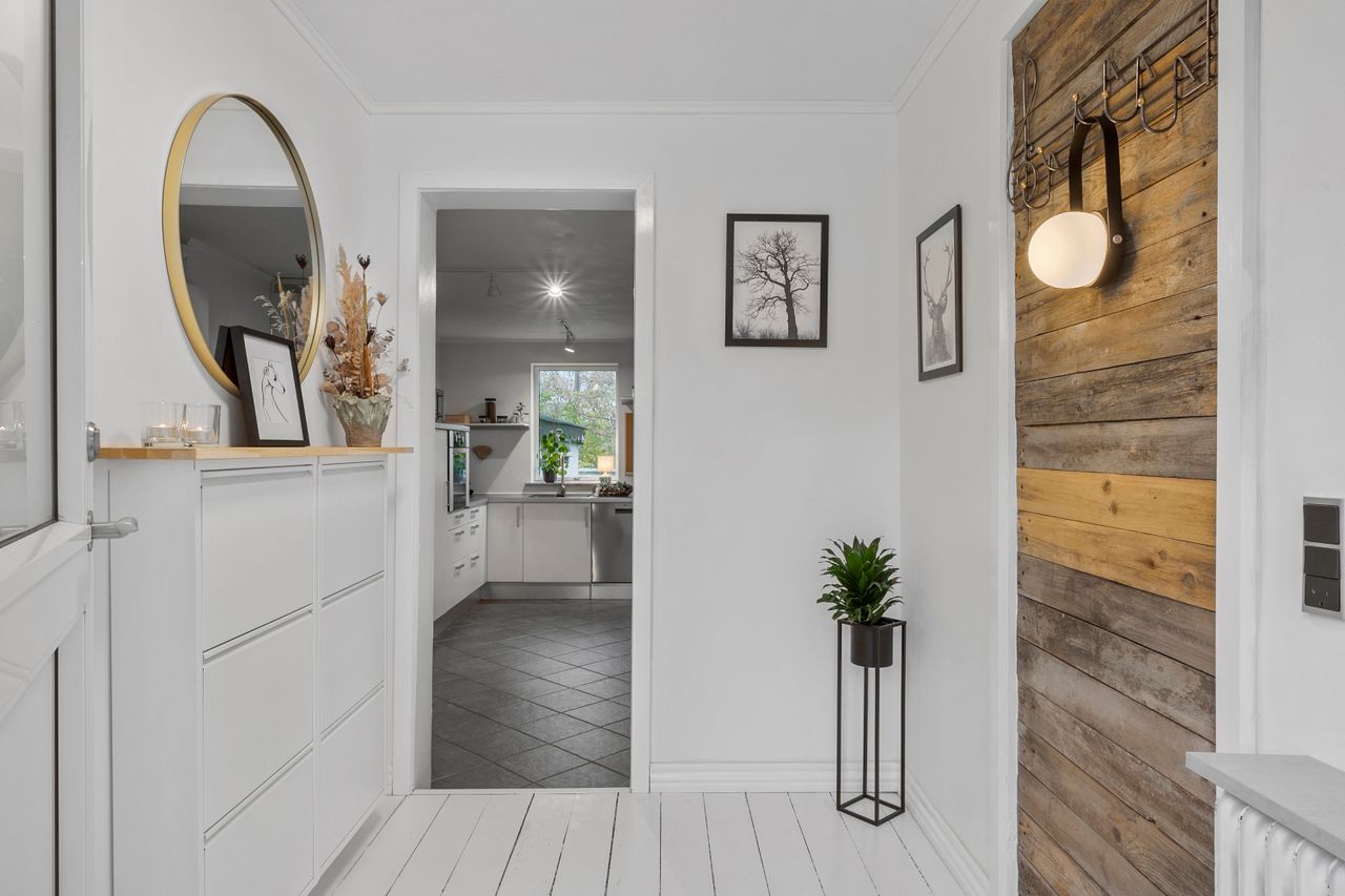 Huset byder velkommen med en rummelig entré, der fører videre til det hyggelige køkken med åben forbindelse til stuen. Her er der plads til både hyggelige middage og afslapning i stueområdet, som har direkte adgang til en lys udestue – perfekt til at nyde en kop kaffe og udsigten til den grønne have.