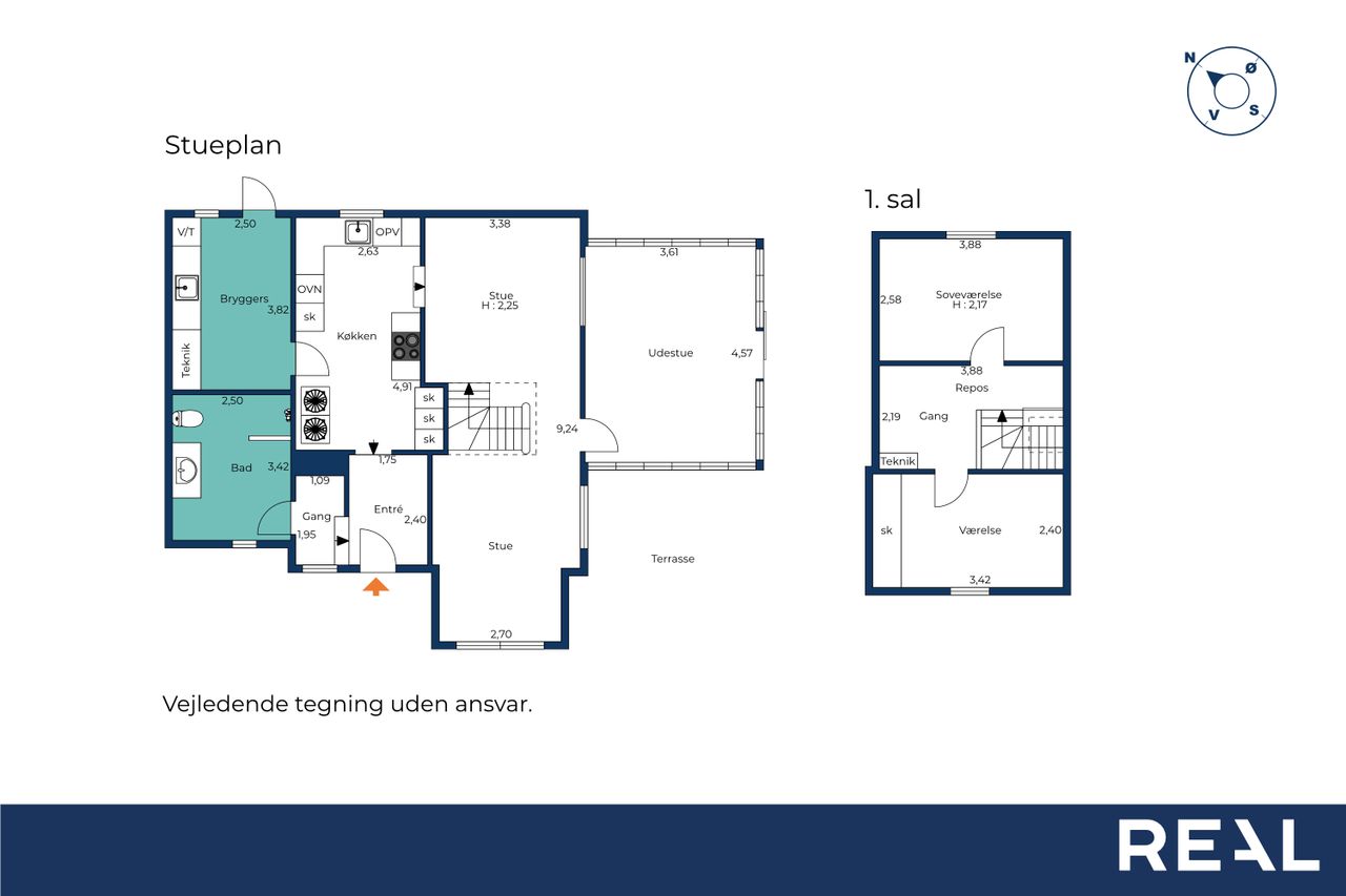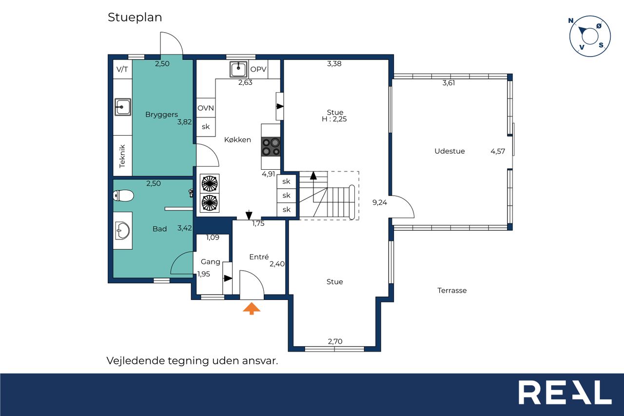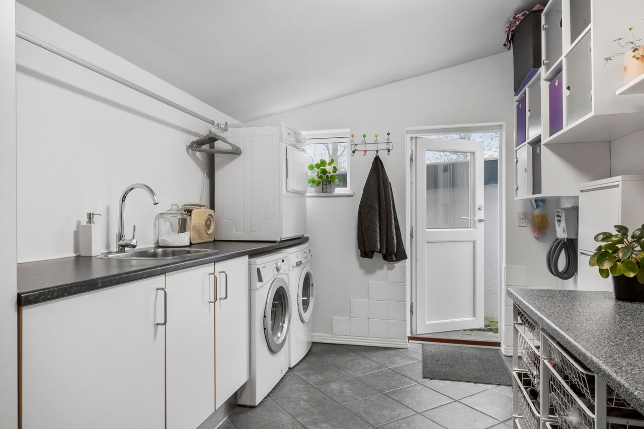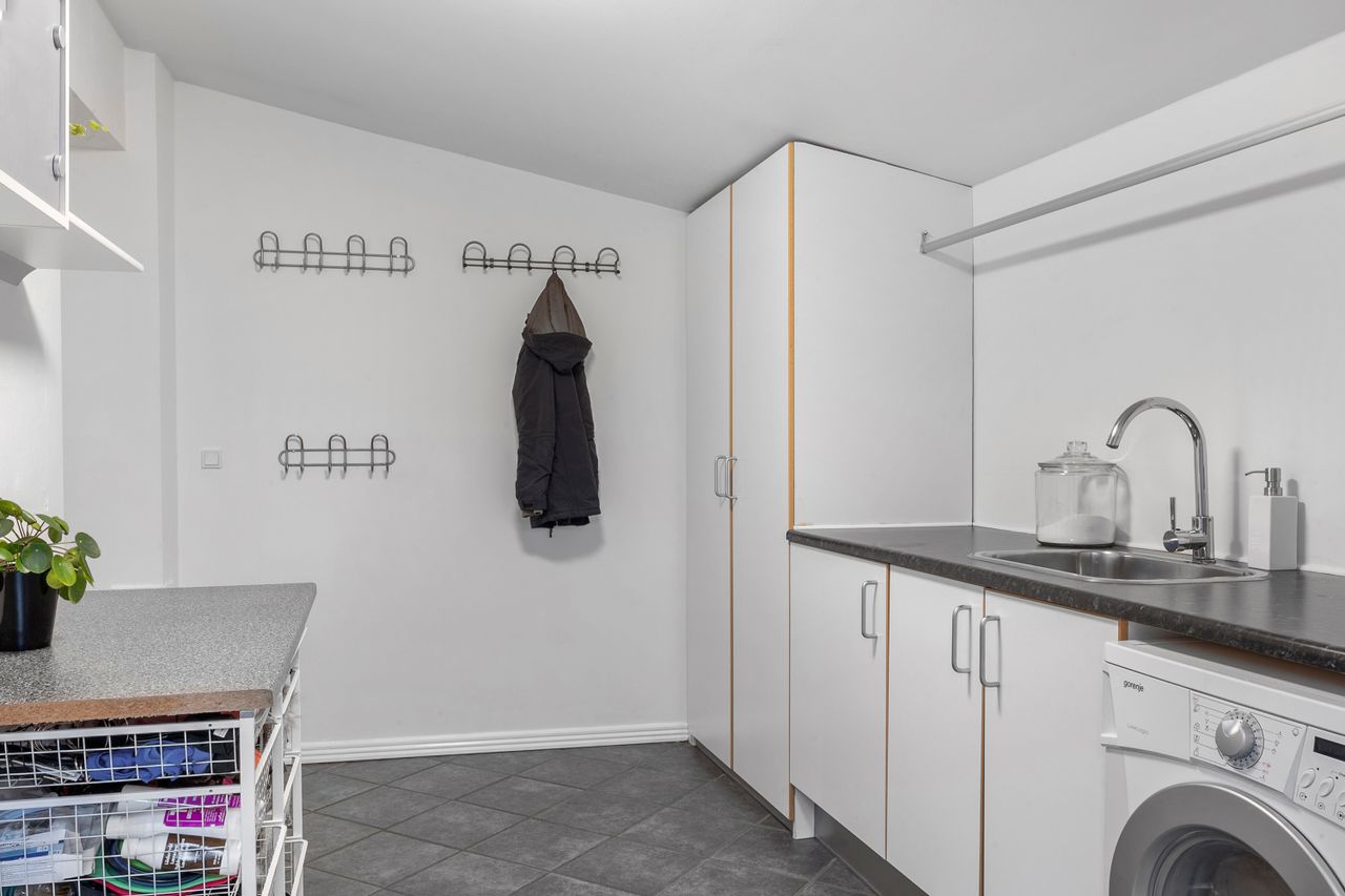 Stueplan rummer også et praktisk bryggers, et badeværelse og flere disponible rum, der kan indrettes efter behov – hvad enten det er opbevaring, hobbyrum eller kontor.
