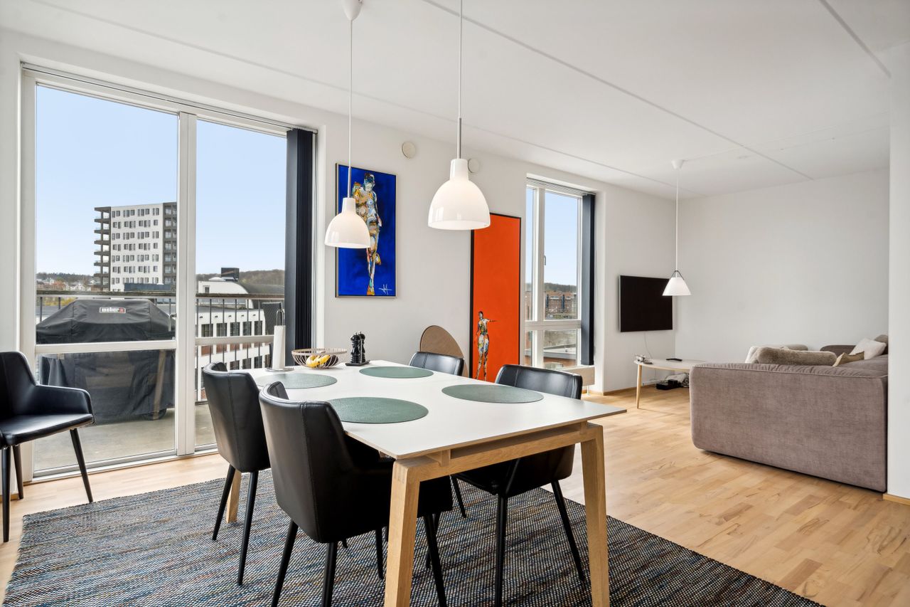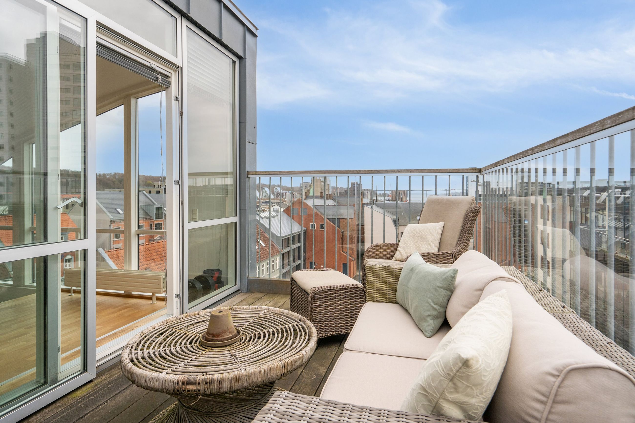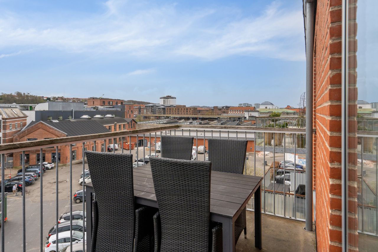 Savner du en nem hverdag med parkering i kælderen, elevator, gåafstand til indkøb vinmanden og alle byens andre faciliteter. Så er det måske på denne lejligheds altan du skal nyde byens liv og kigget til fjorden med et koldt glas i hånden.