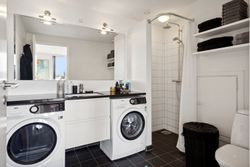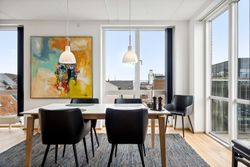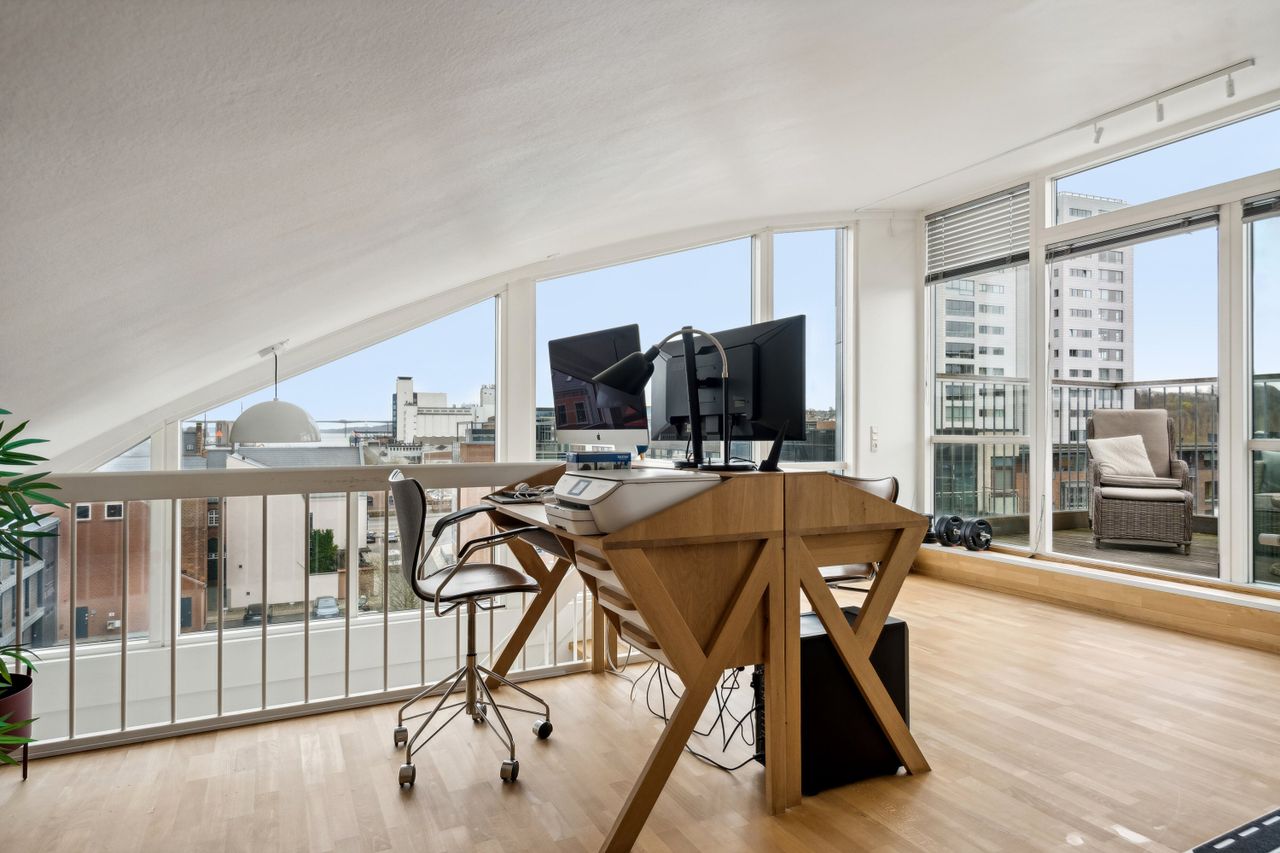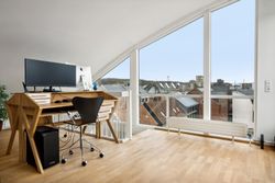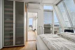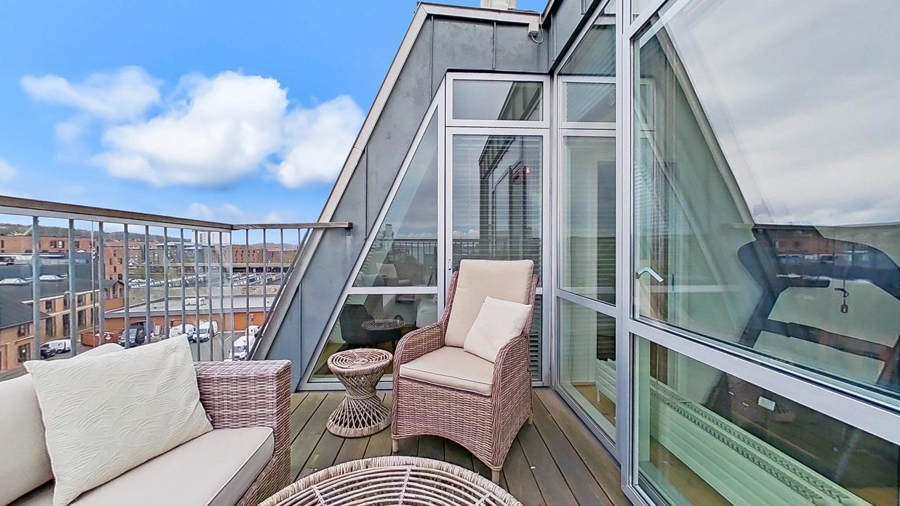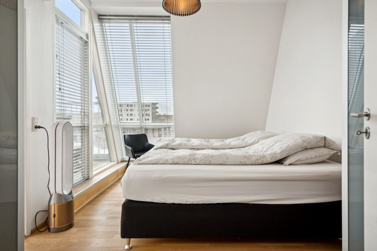 Tagterrassen er uden tvivl lejlighedens juvel; her er der plads nok til både loungesæt og spisebordssæt – perfekt til hyggelige grillaftener eller afslapning under åben himmel. Det lyse soveværelse på denne etage drager fordel af store tagvinduer, som også giver adgang til eget badeværelse.