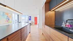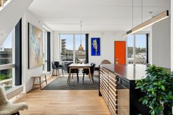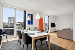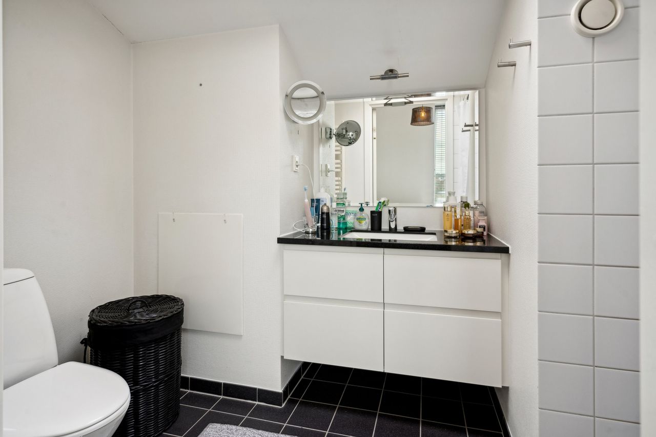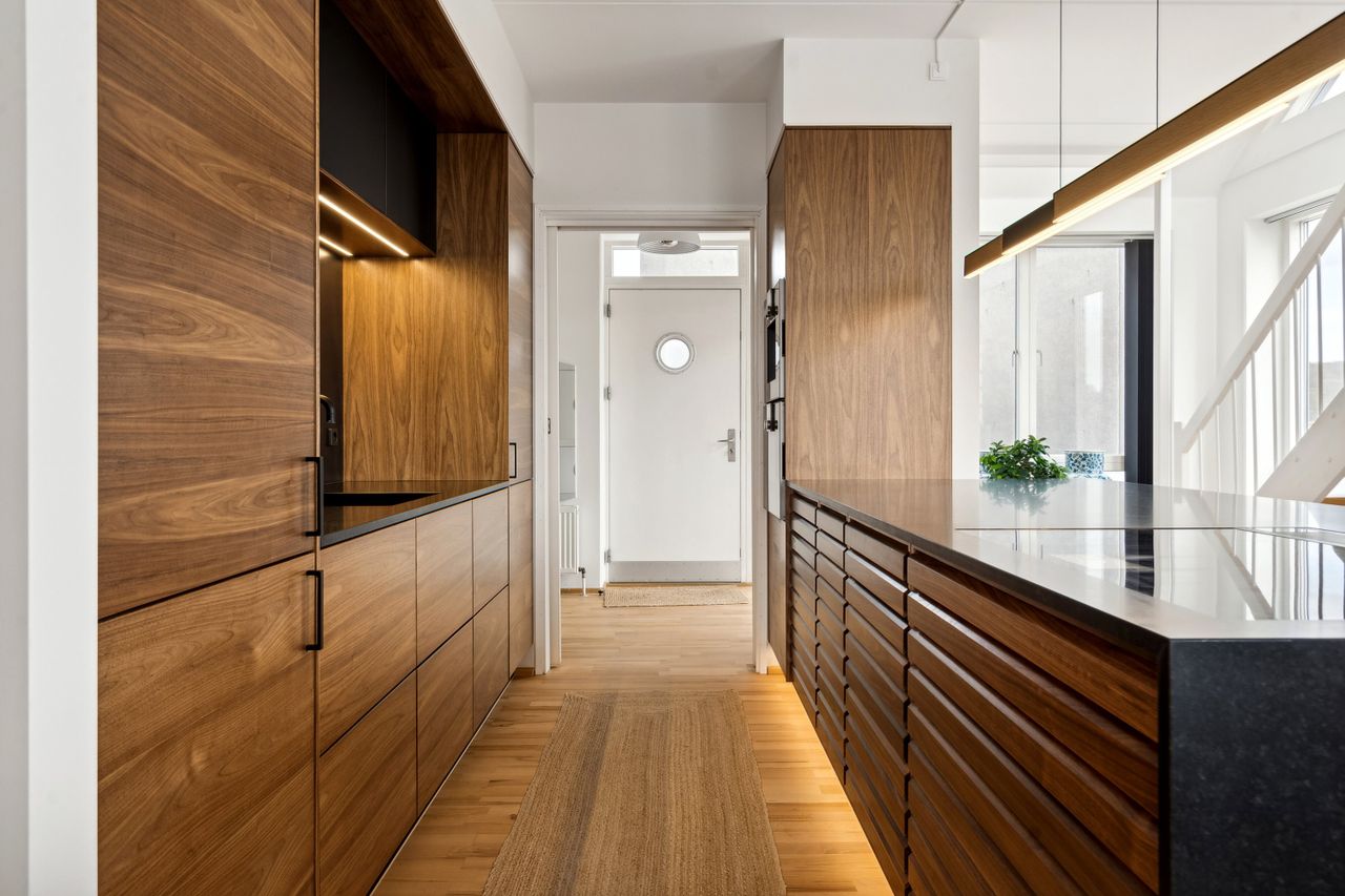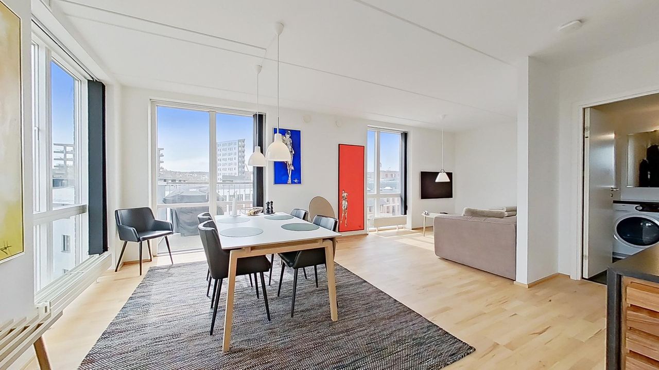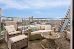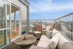 Tagterrassen er uden tvivl lejlighedens juvel; her er der plads nok til både loungesæt og spisebordssæt – perfekt til hyggelige grillaftener eller afslapning under åben himmel. Det lyse soveværelse på denne etage drager fordel af store tagvinduer, som også giver adgang til eget badeværelse.