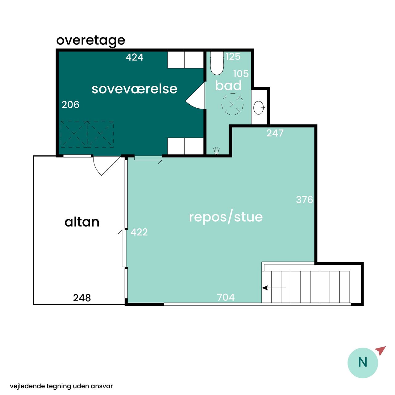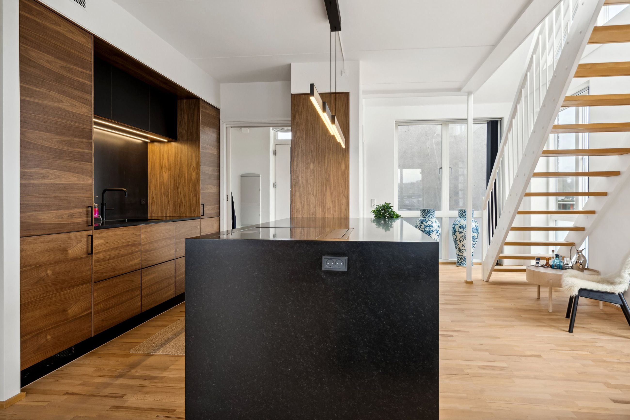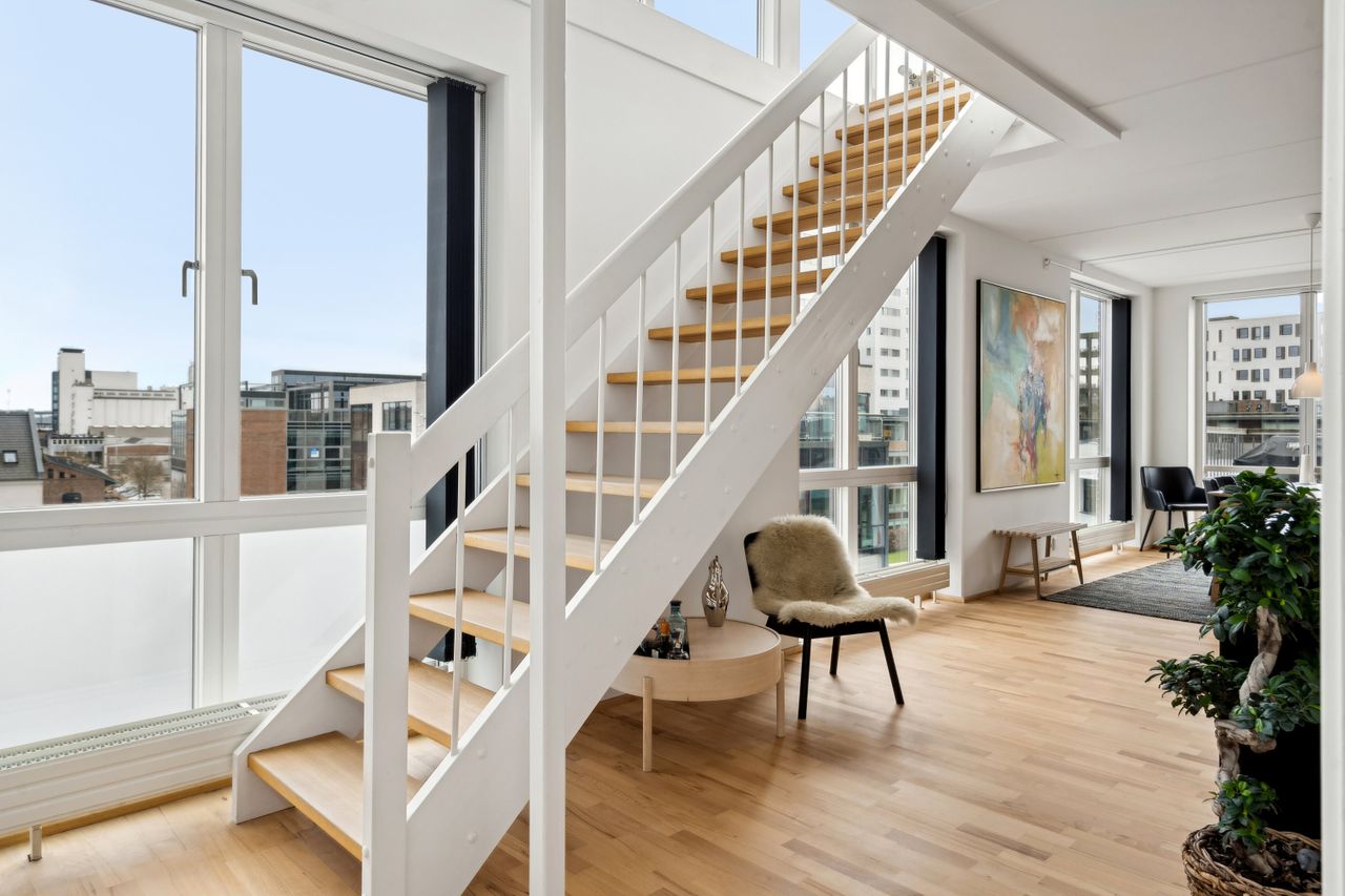 Stueplan fuldendes af et elegant badeværelse samt et godt værelse, der kan fungere som gæsteværelse eller hjemmekontor. Når du bevæger dig op ad trappen til overetagen, bliver du mødt af en stor stue med imponerende gulv-til-loft-vinduer. Disse specialdesignede vinduer fylder rummet med naturligt lys og giver samtidig adgang til den fantastiske tagterrasse.