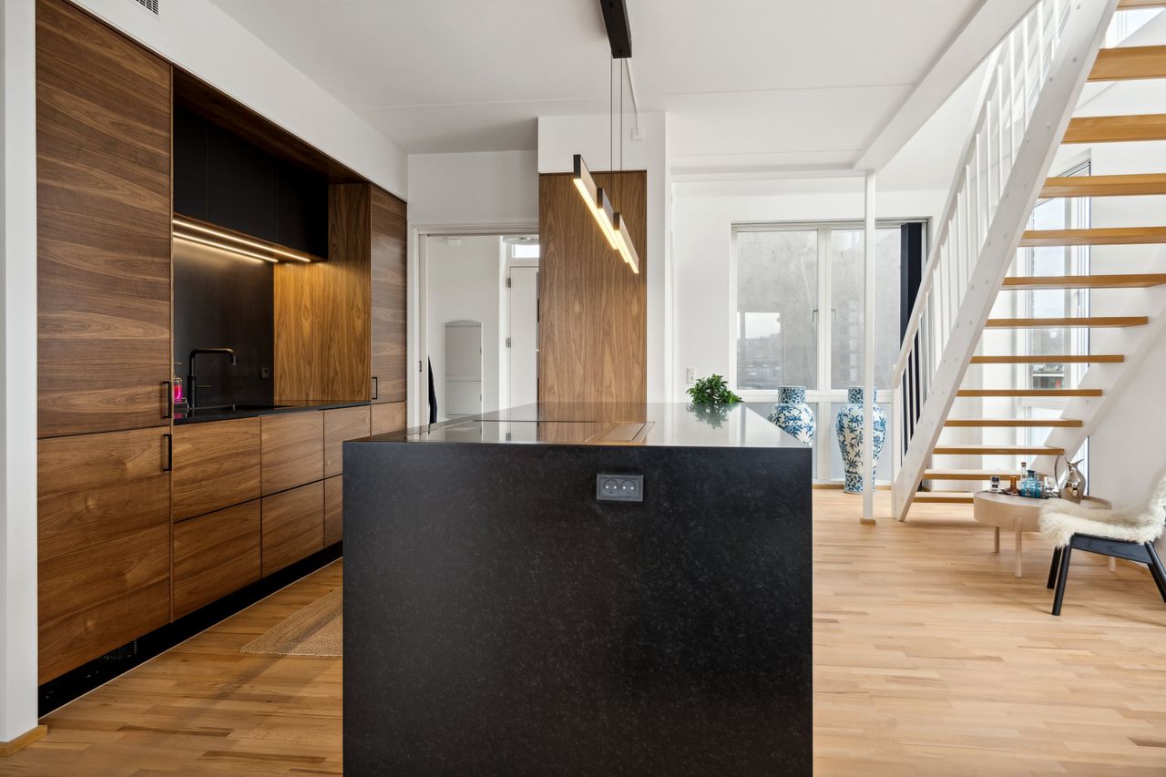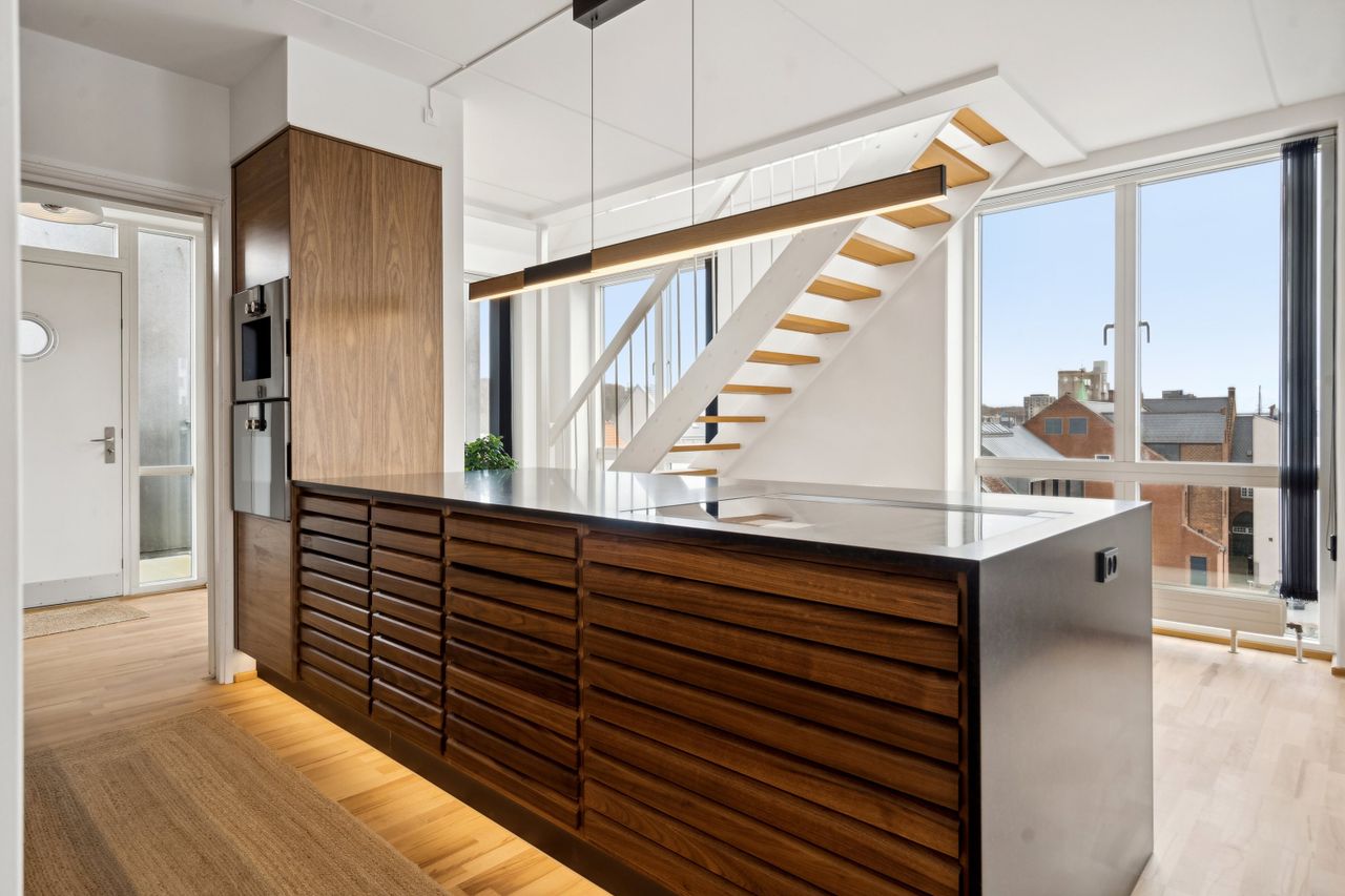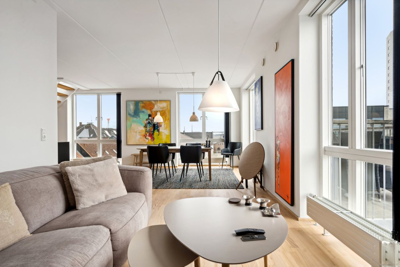 Velkommen til en ekstraordinær ejerlejlighed, der tilbyder en unik kombination af moderne komfort og betagende udsigt over byen. Denne imponerende bolig strækker sig over to plan og er beliggende i en ejendom opført i 2005, hvilket sikrer et moderne udtryk og funktionalitet. Med et boligareal på hele 143 kvadratmeter er der rigelig plads til at udfolde sig.