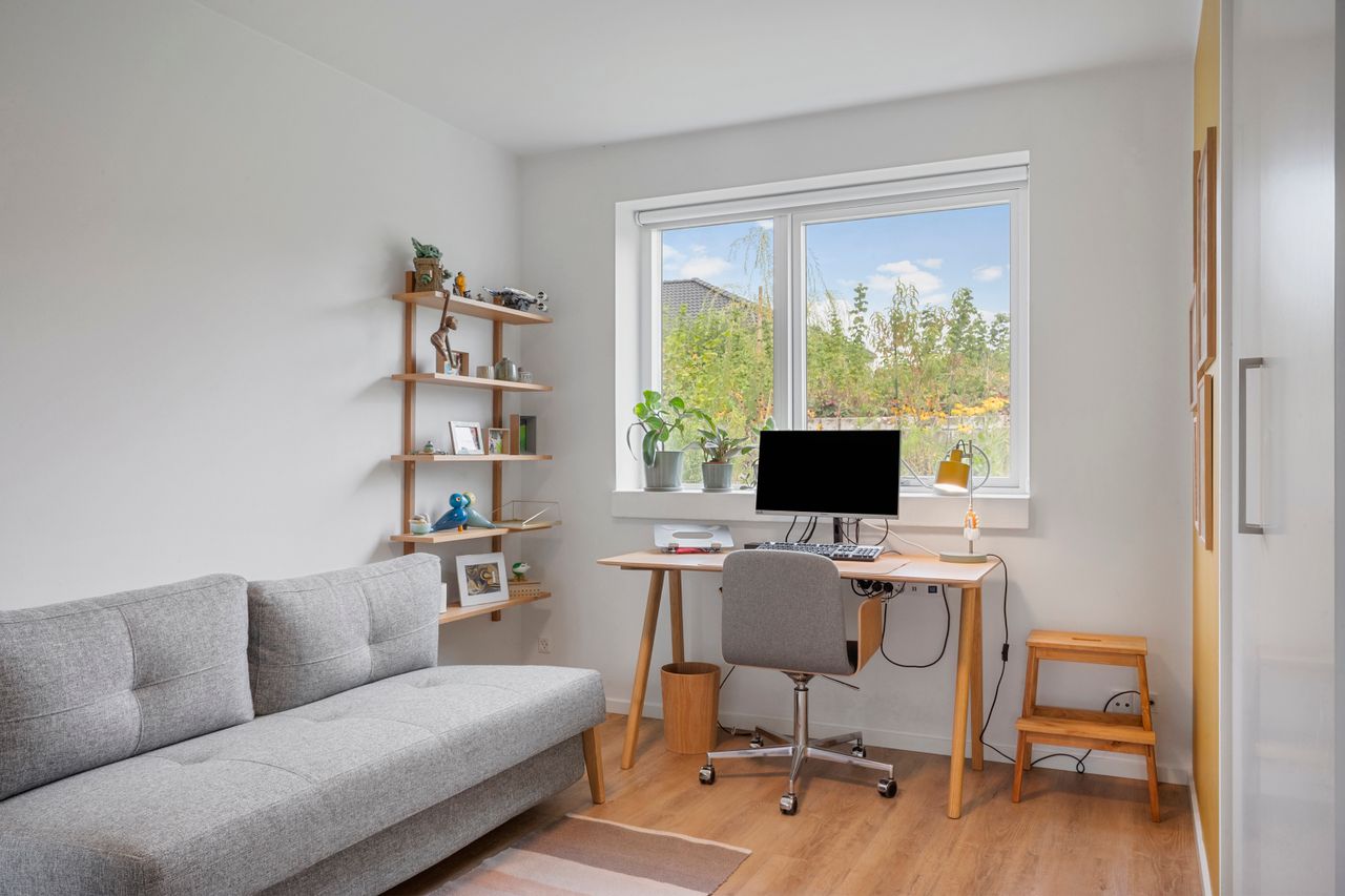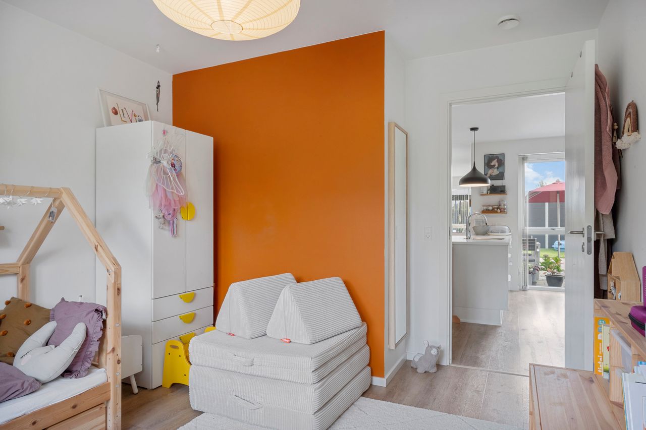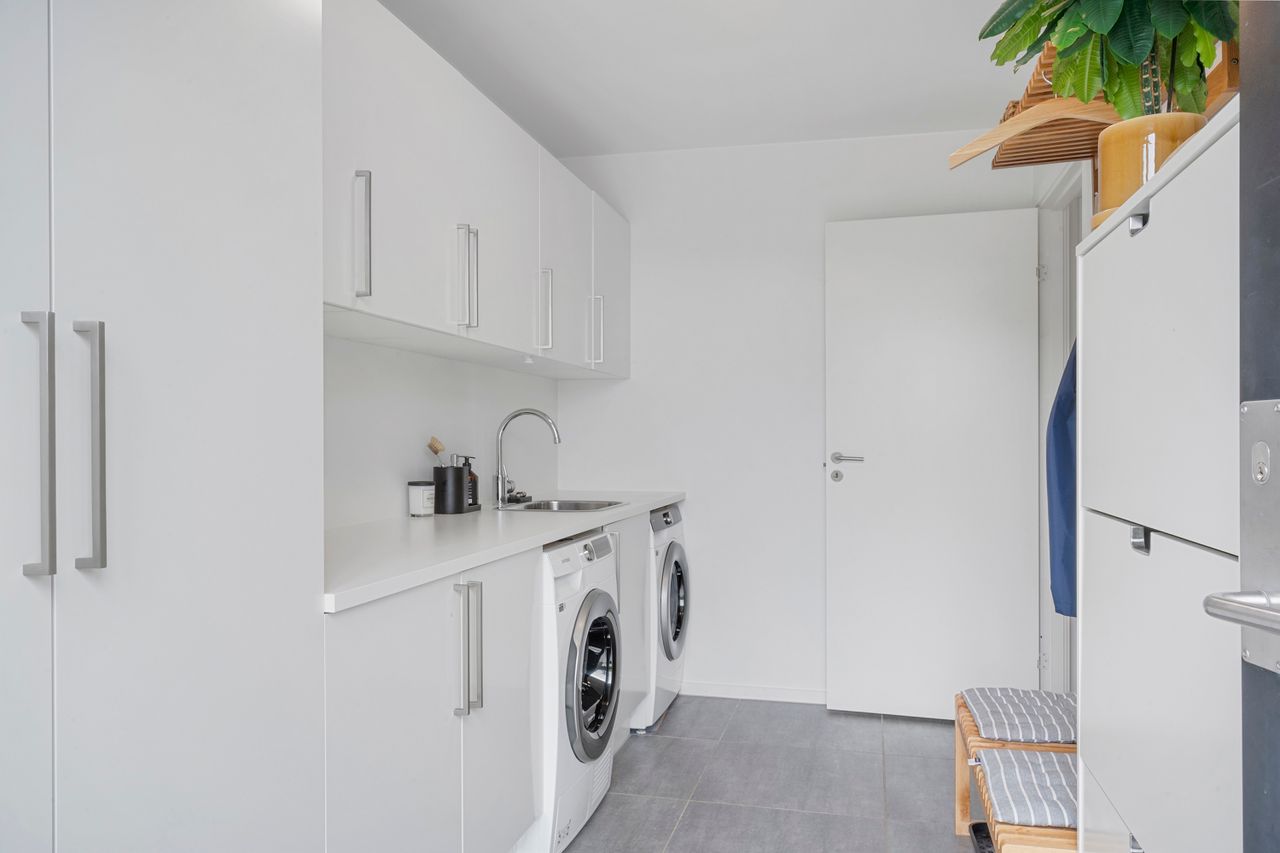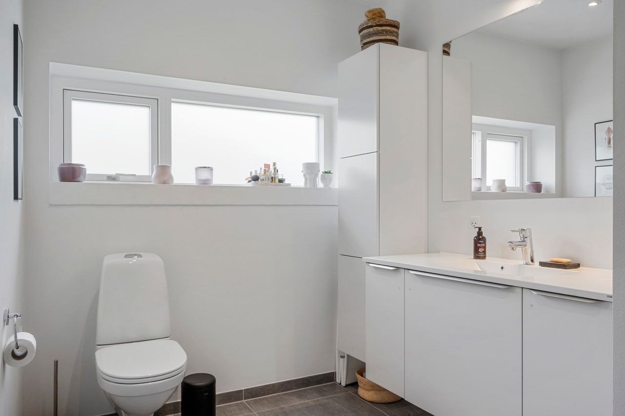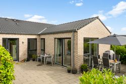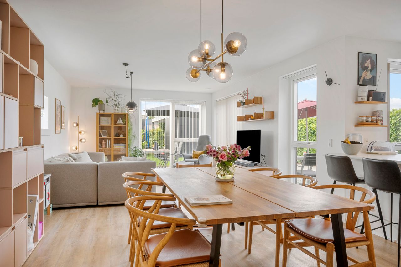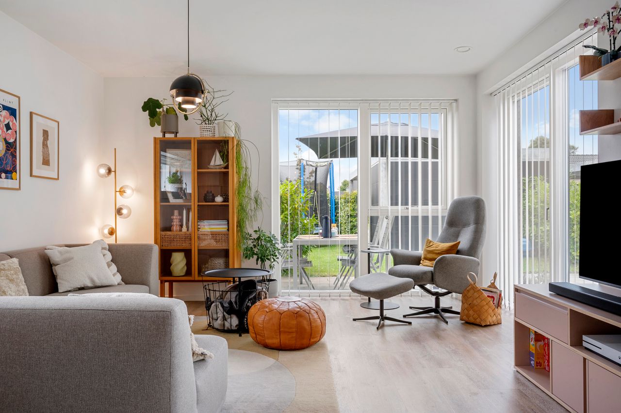 Fra stuen er der udgang til en stor, åben terrasse og en nem, vedligeholdelsesfri have, hvor du kan nyde solen eller samle familie og venner til hyggelige stunder.