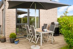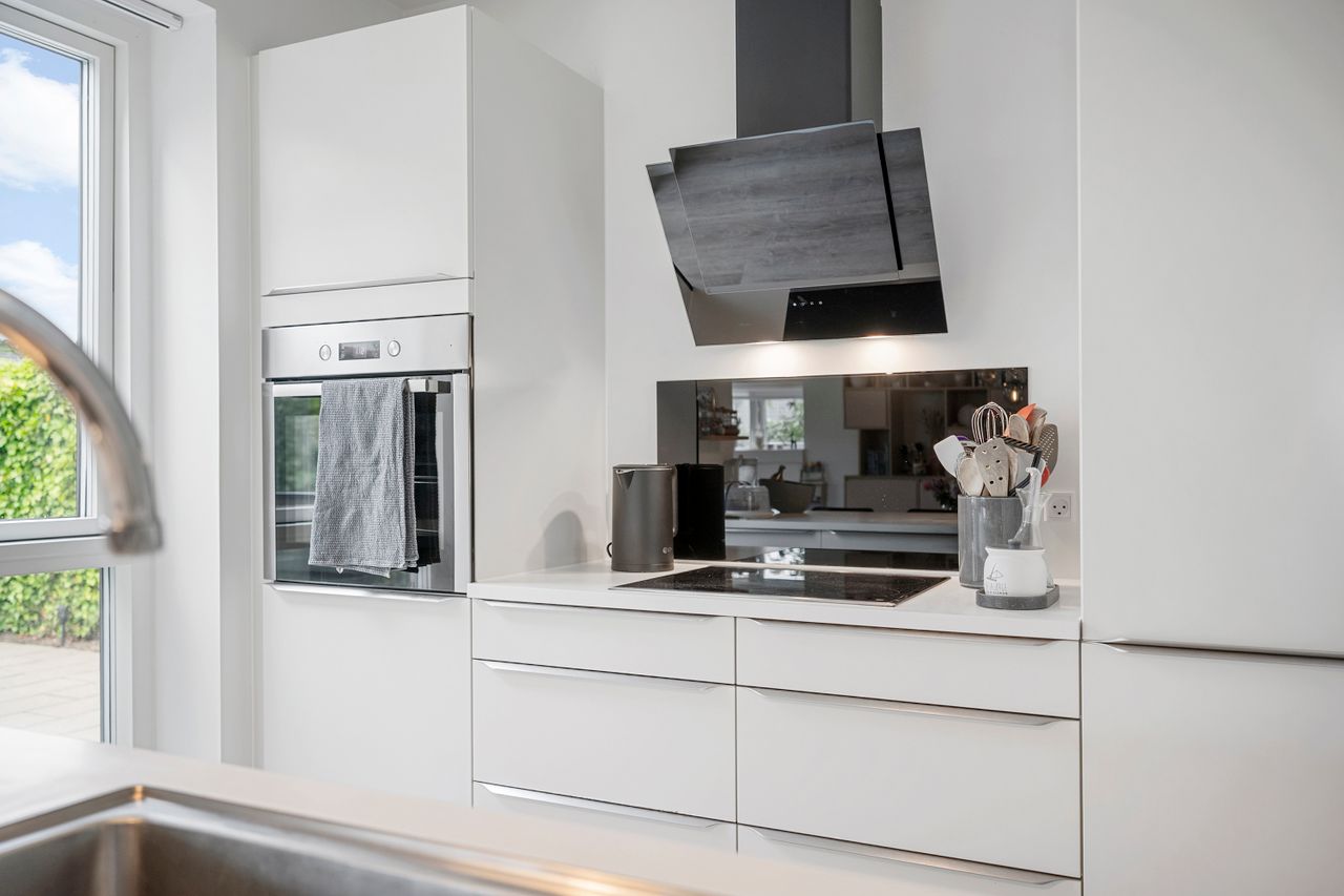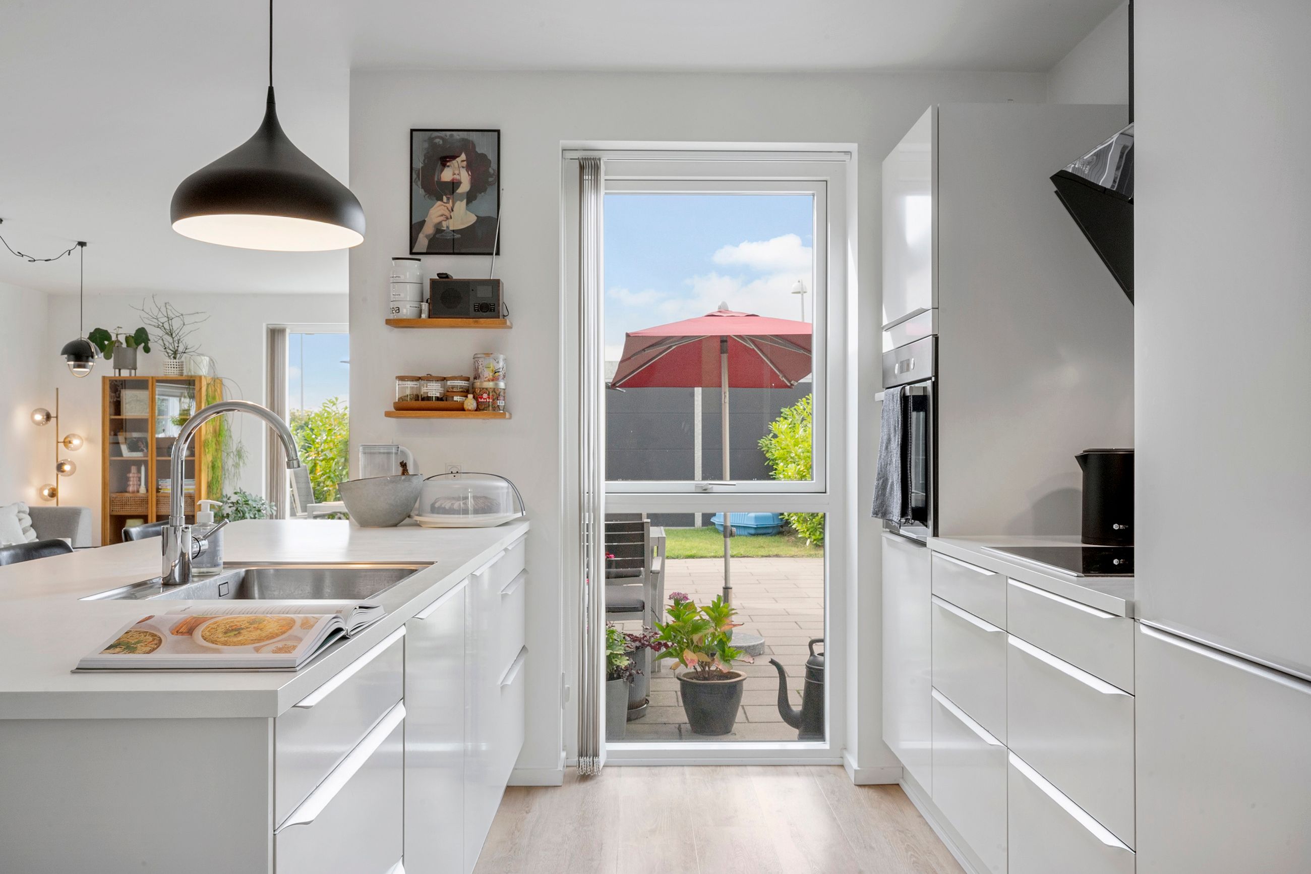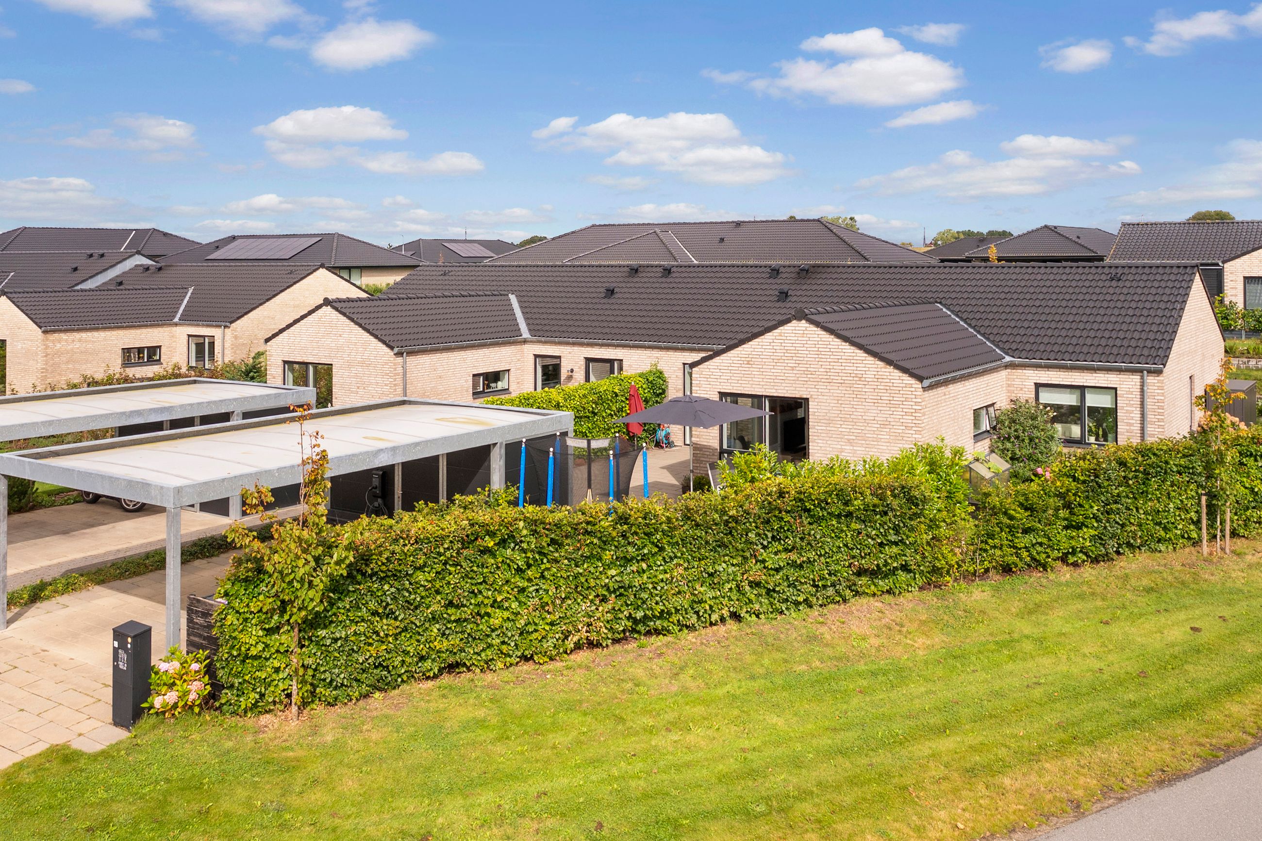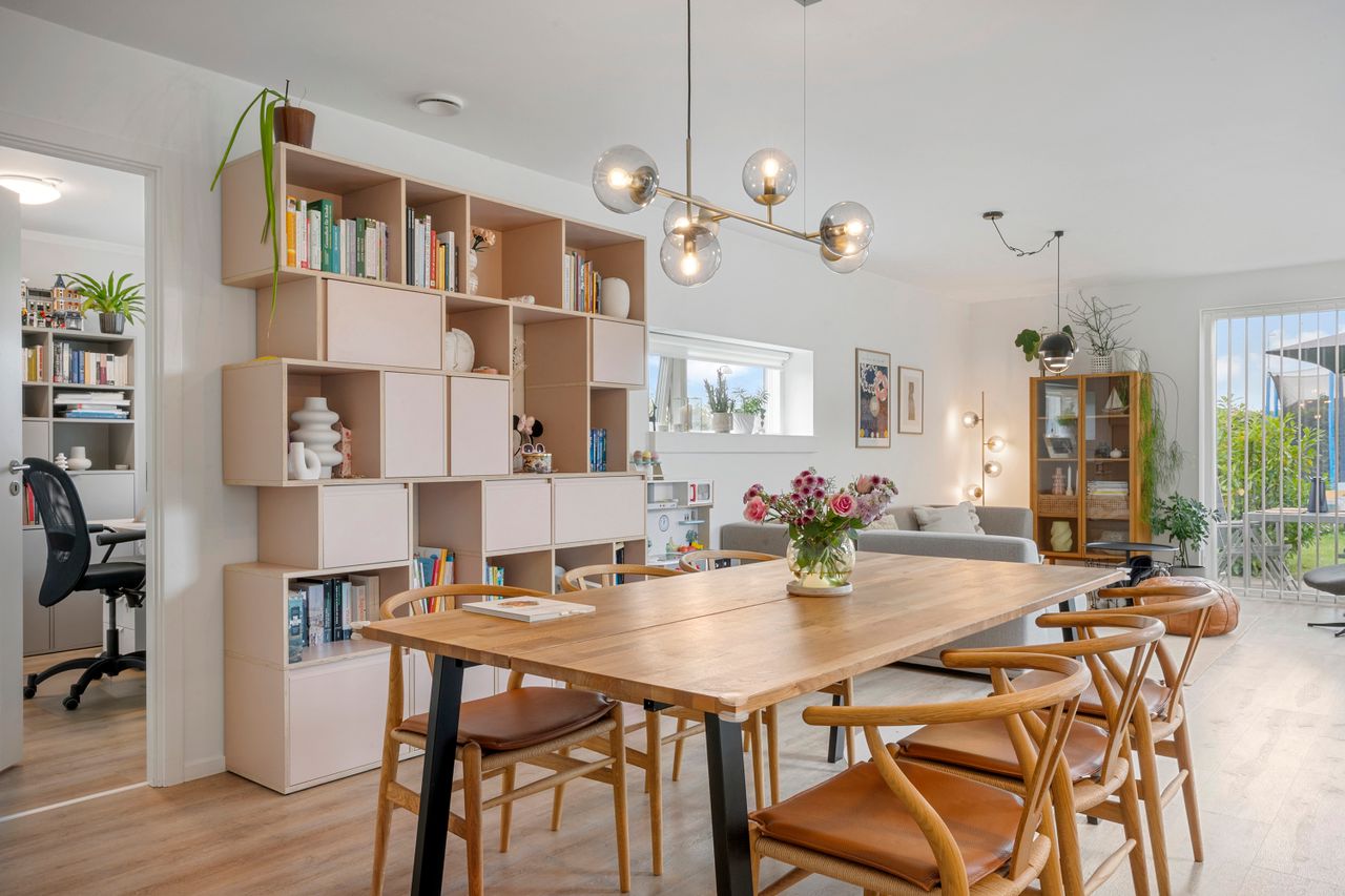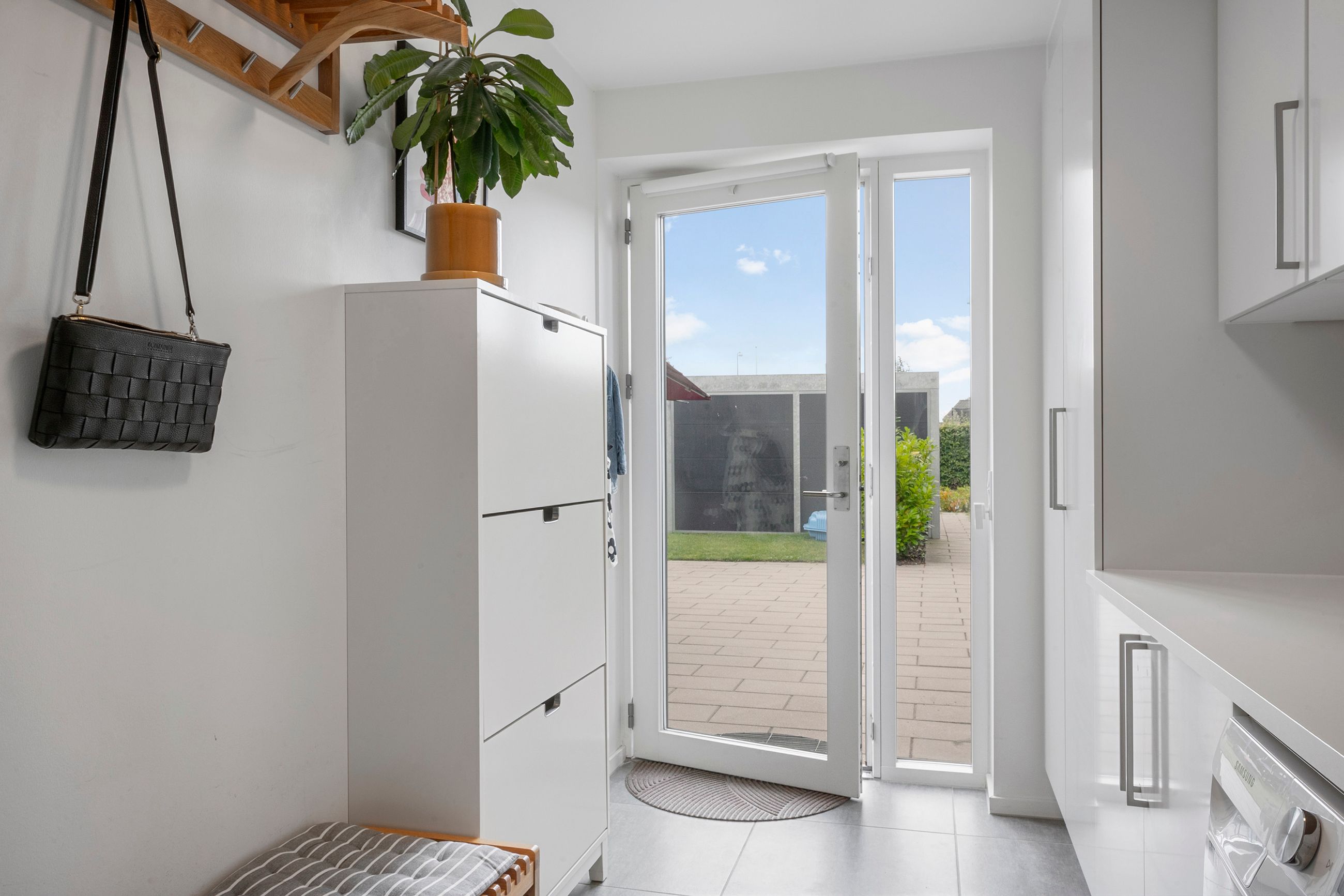 Fra stuen er der udgang til en stor, åben terrasse og en nem, vedligeholdelsesfri have, hvor du kan nyde solen eller samle familie og venner til hyggelige stunder.