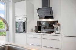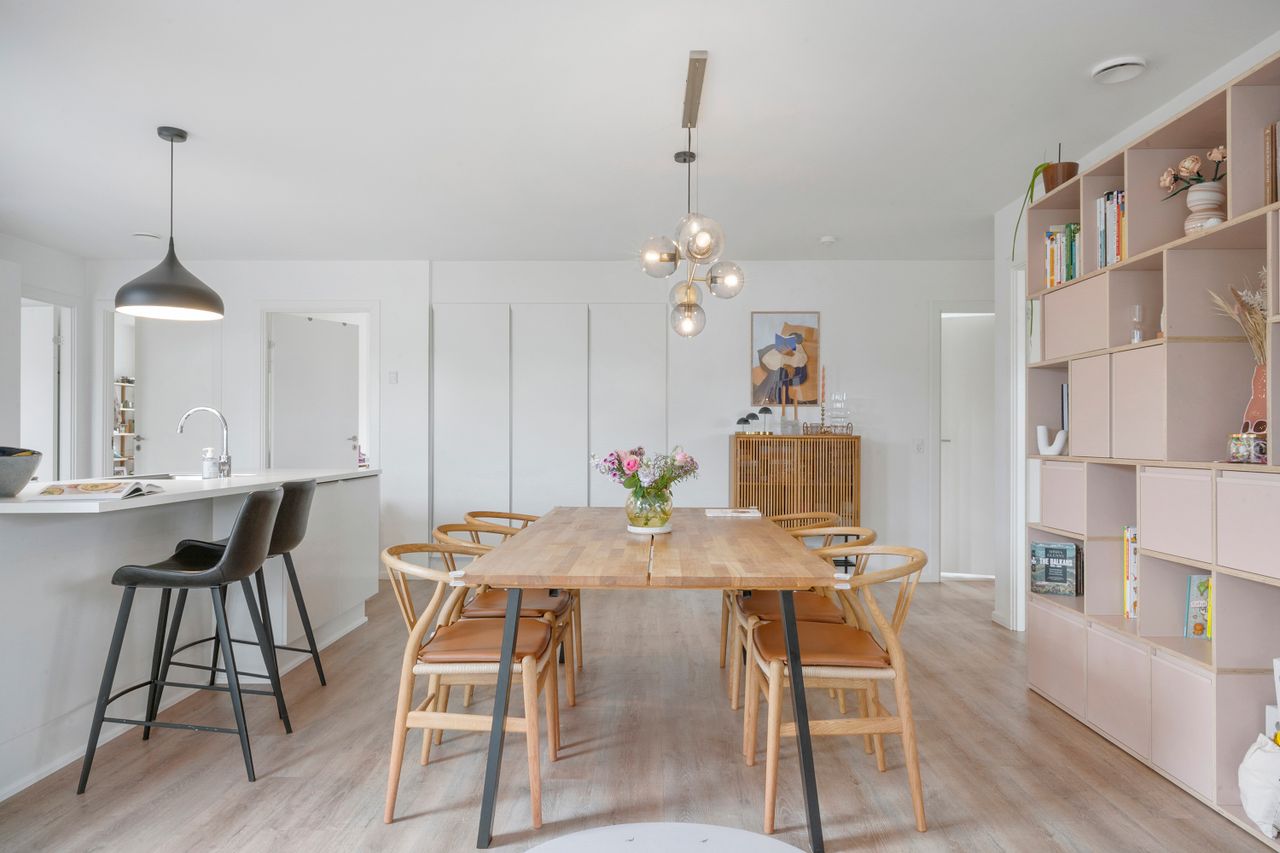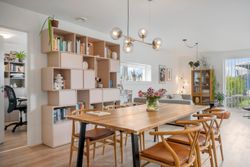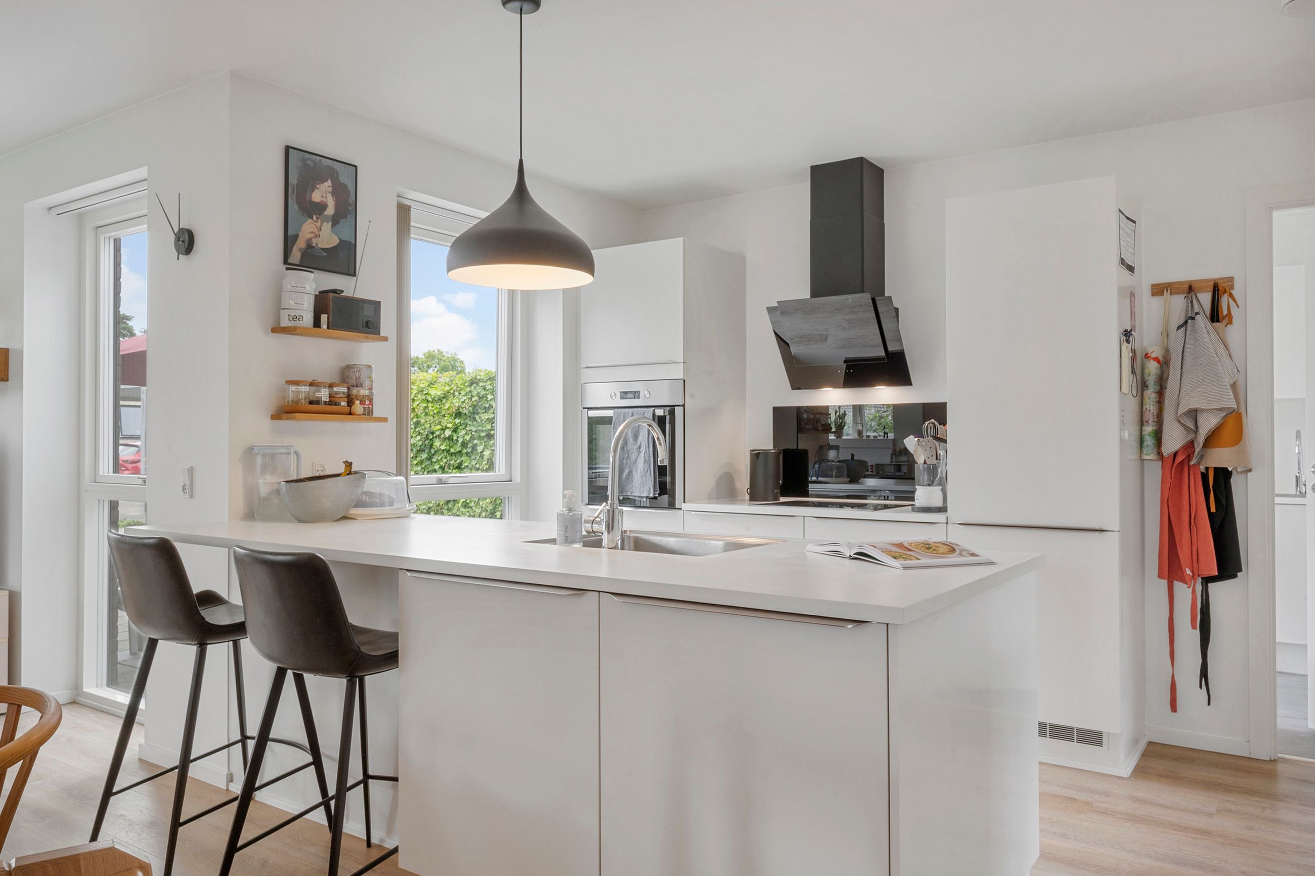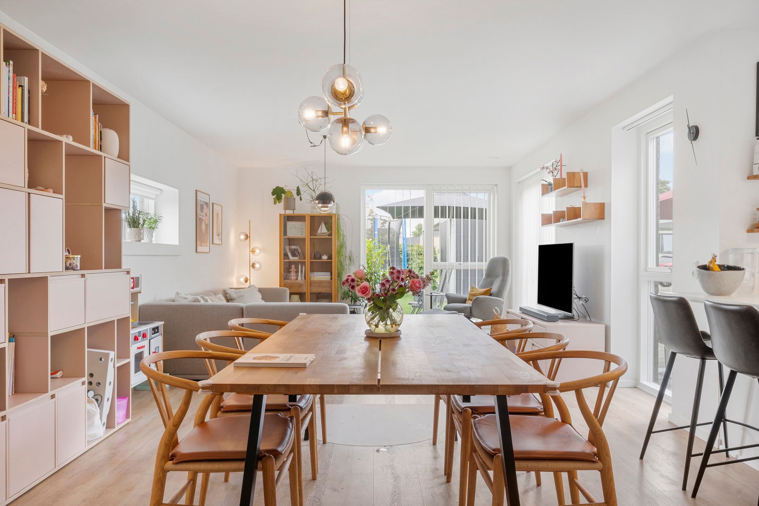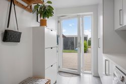 Når du træder ind, mødes du af en entré, der også fungerer som praktisk bryggers. Herfra går turen videre ind i det store køkken-alrum, der ligger i åben forbindelse med en rummelig stue – hjemmets naturlige samlingspunkt, hvor der er plads til både fælles måltider og hyggelige stunder.
