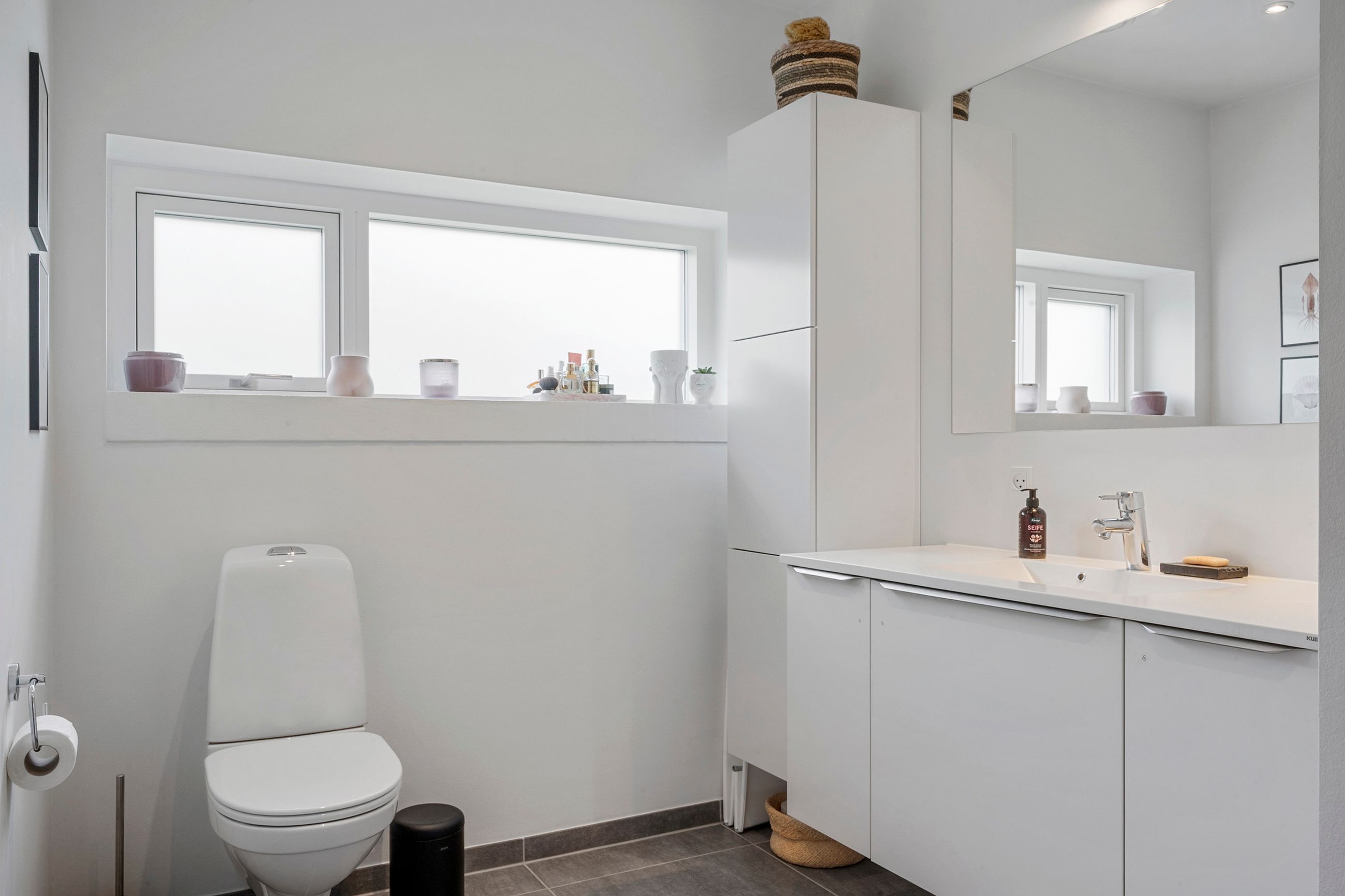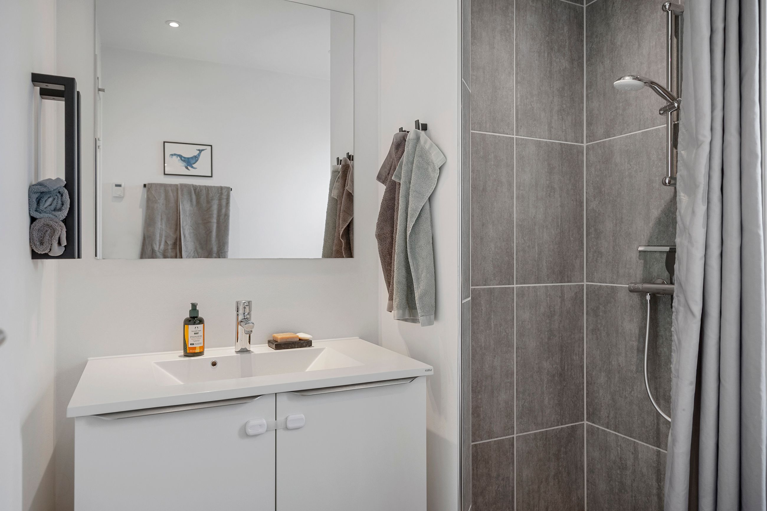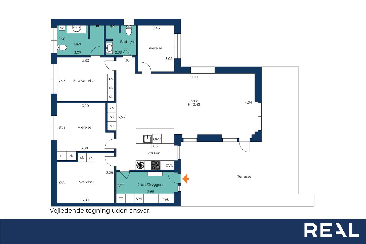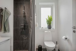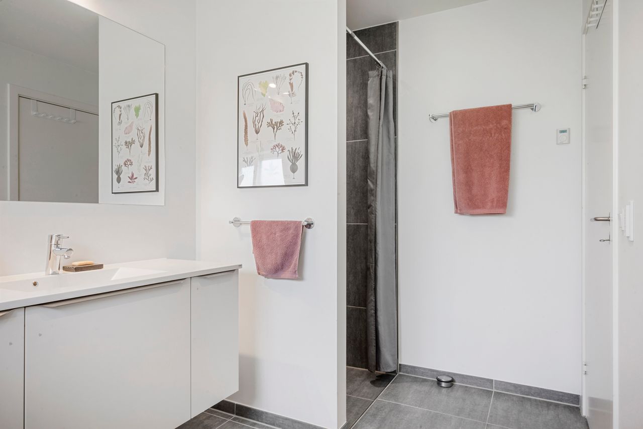 Boligen rummer tre værelser samt et soveværelse med eget badeværelse. Derudover finder du endnu et badeværelse, hvilket giver en fleksibel og velfungerende planløsning for hele familien.