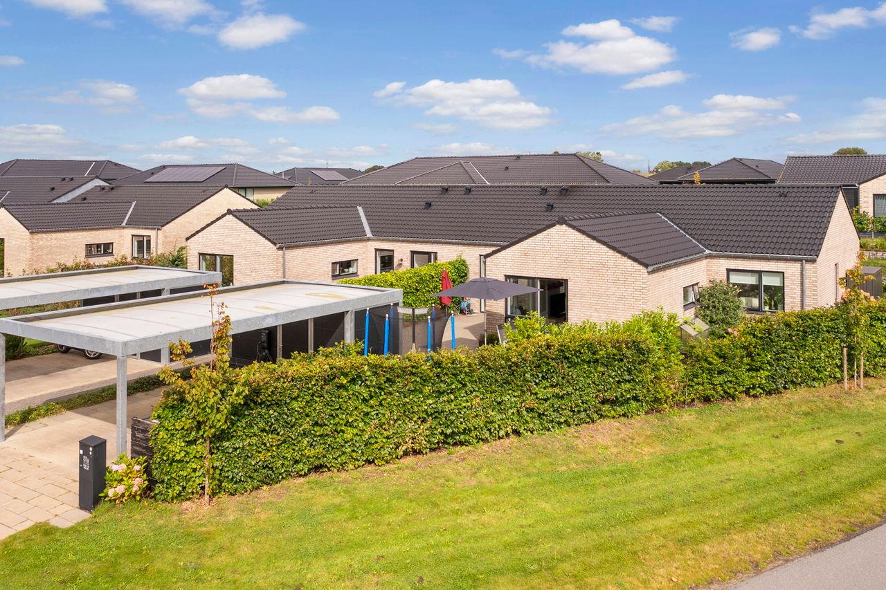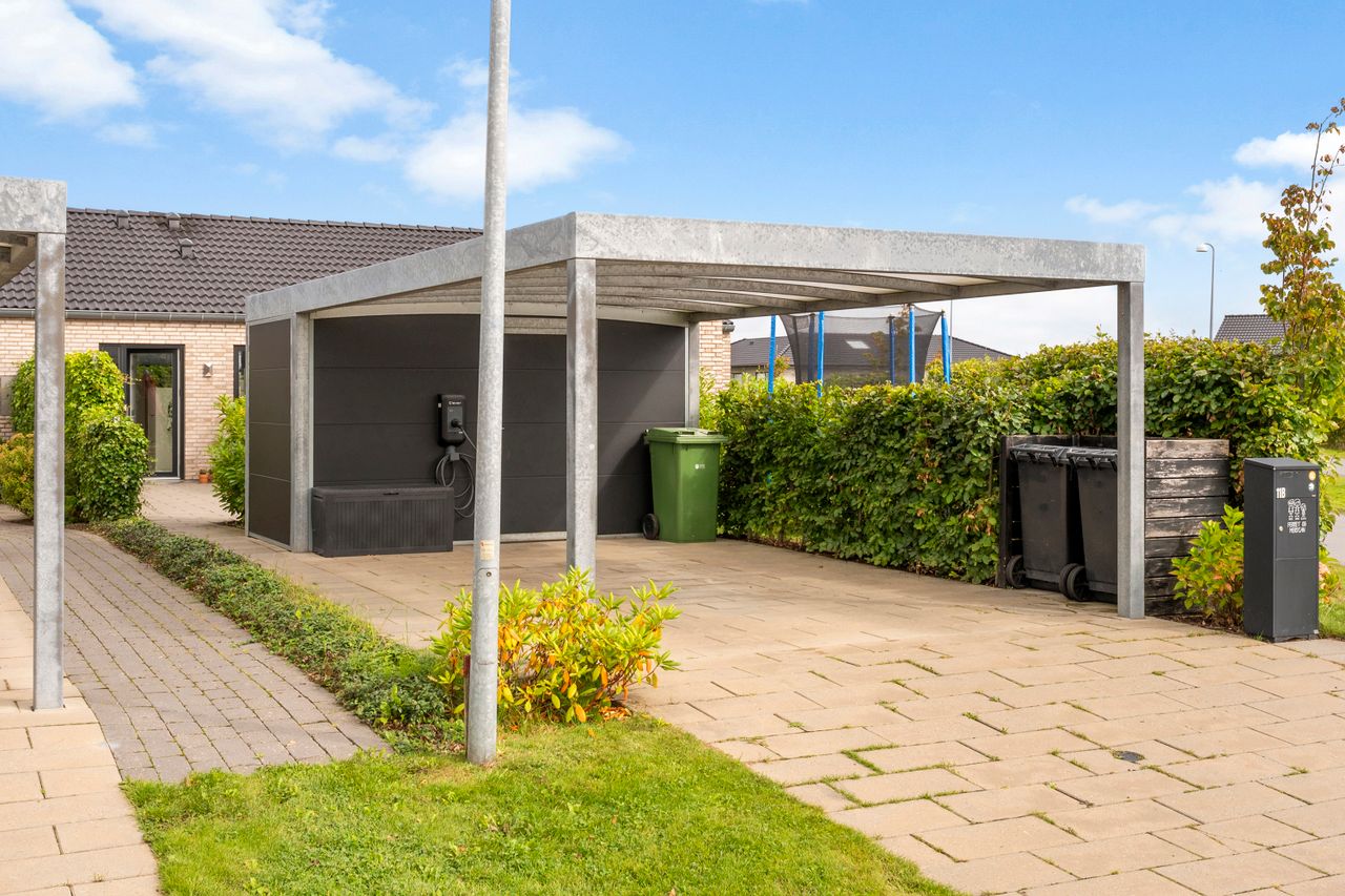 Til huset hører desuden en indkørsel med carport, og beliggenheden er attraktiv med kort afstand til hverdagens fornødenheder, skoler og indkøb – og samtidig kun 10 min til Vejle centrum.