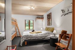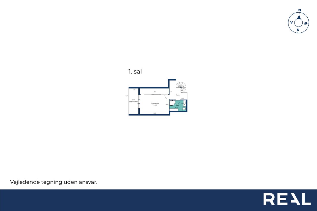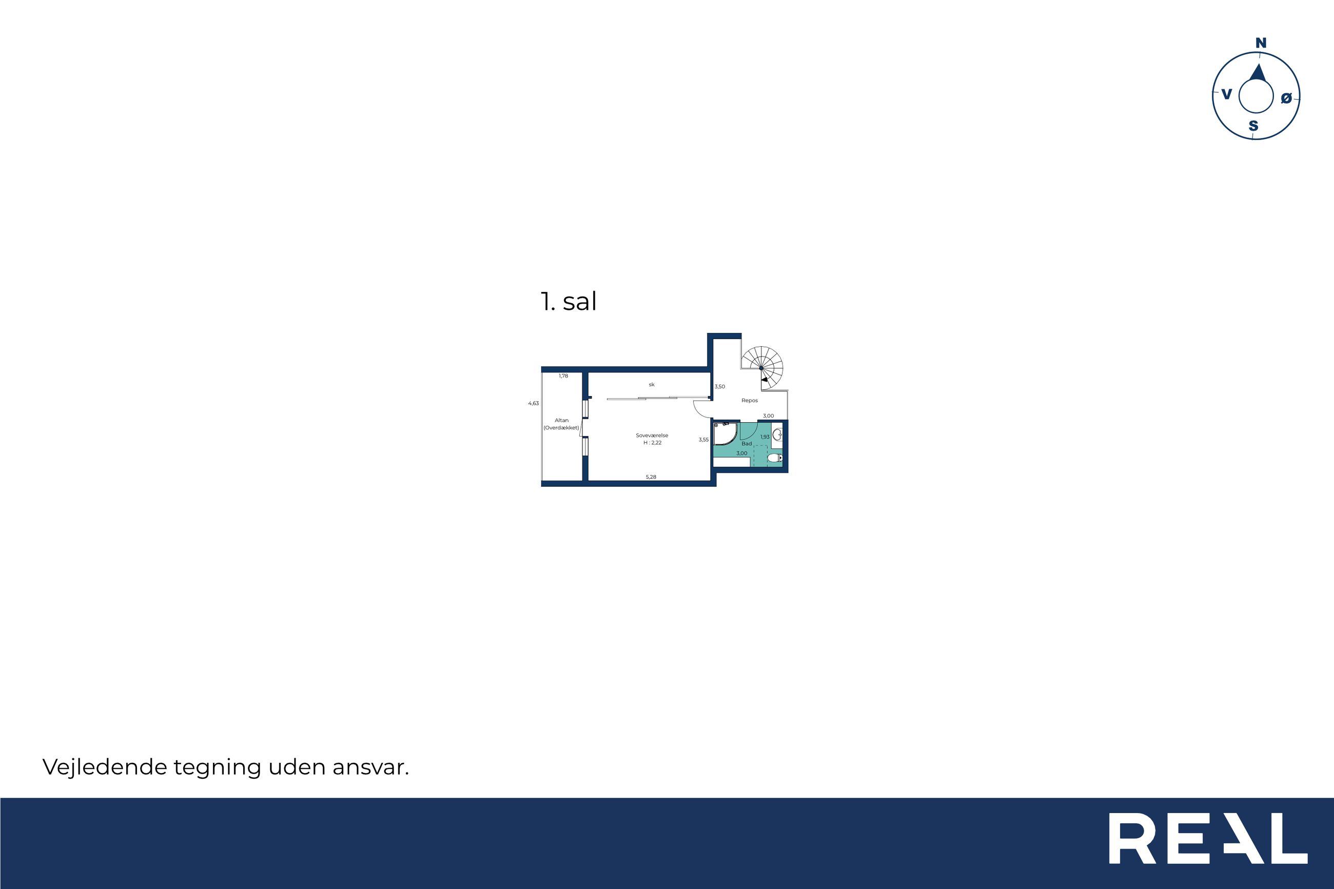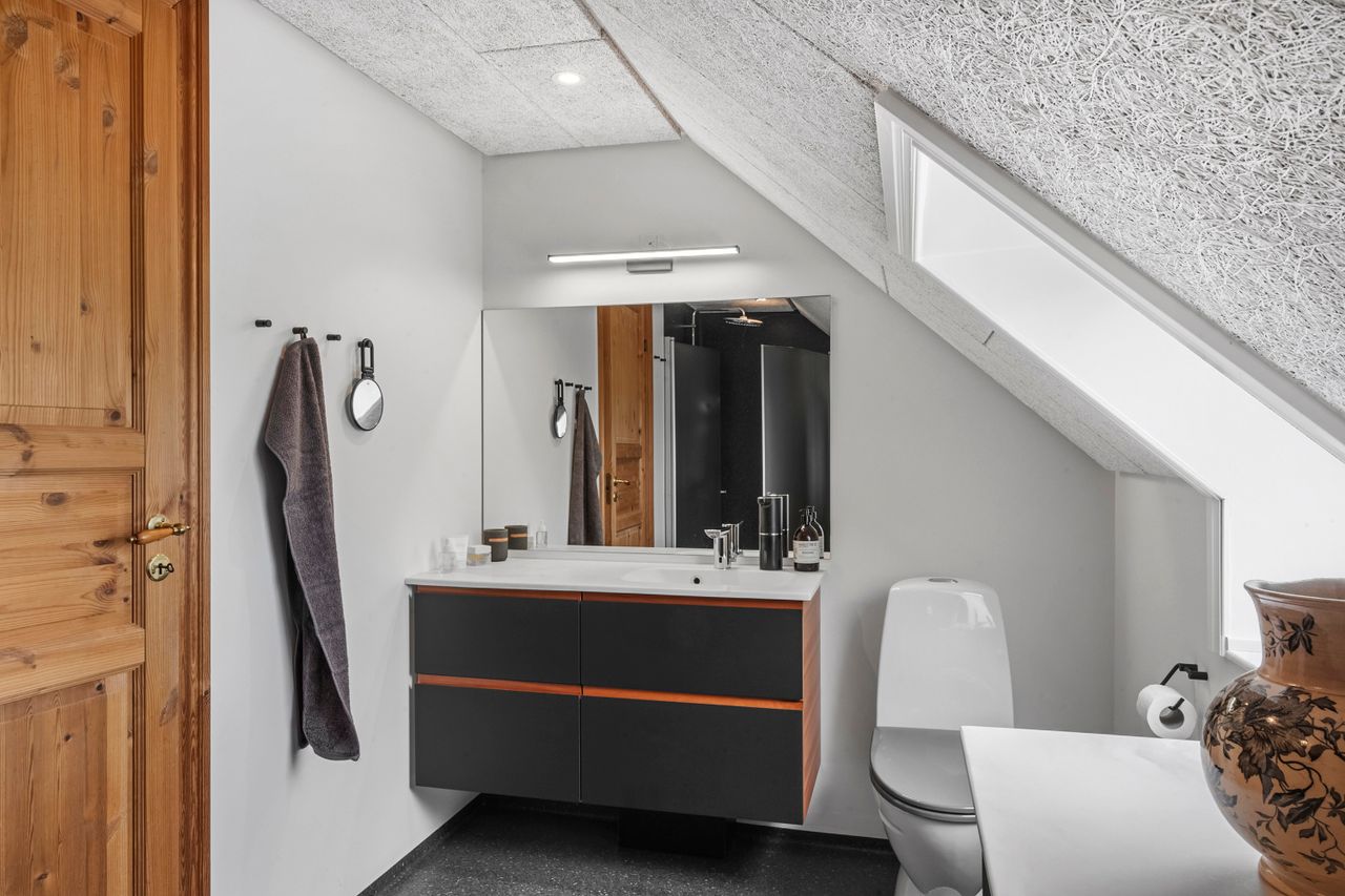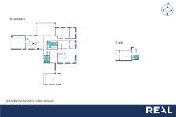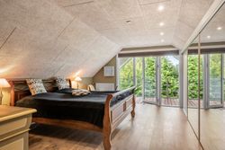 På 1. sal findes repos, husets soveværelse med adgang til overdækket altan og husets andet badeværelse med brus.