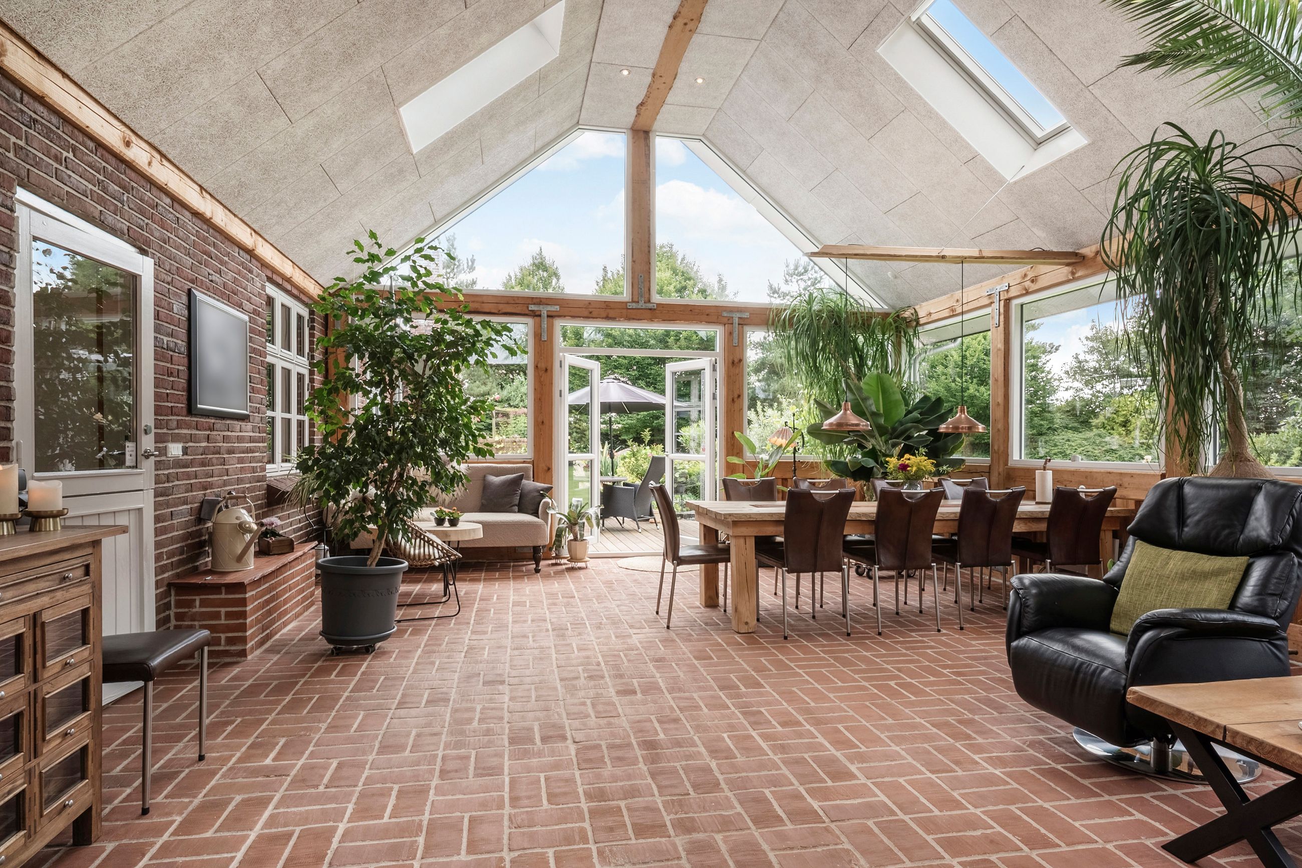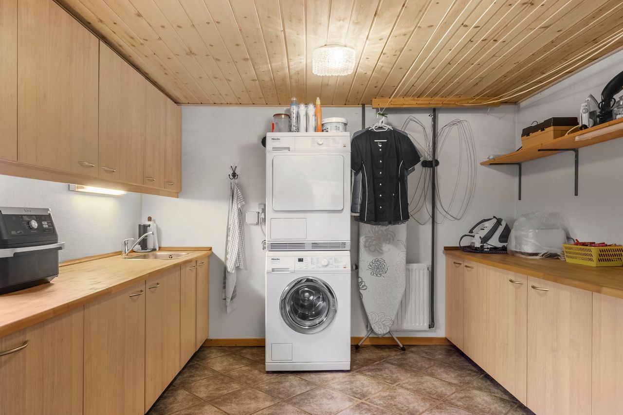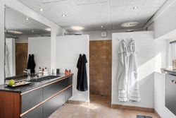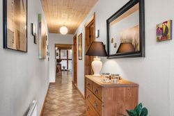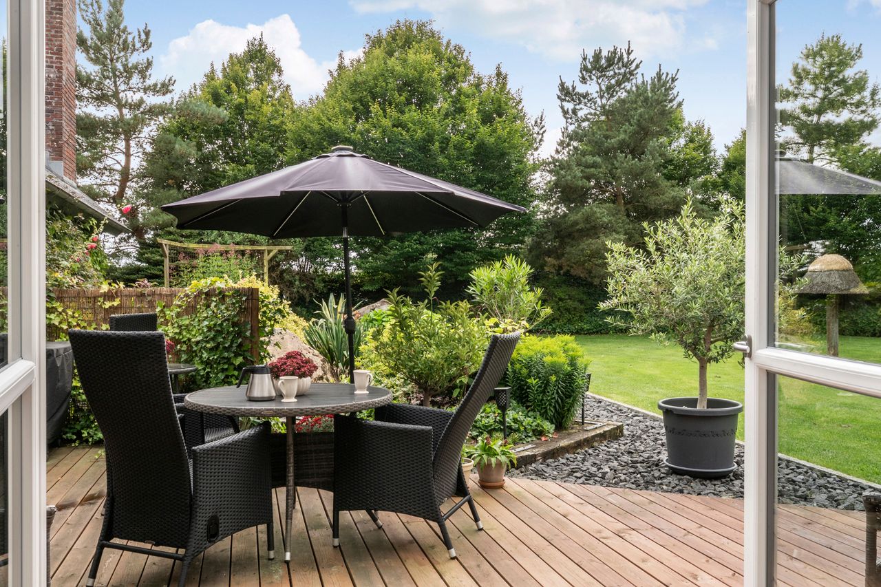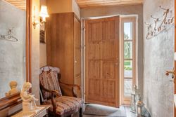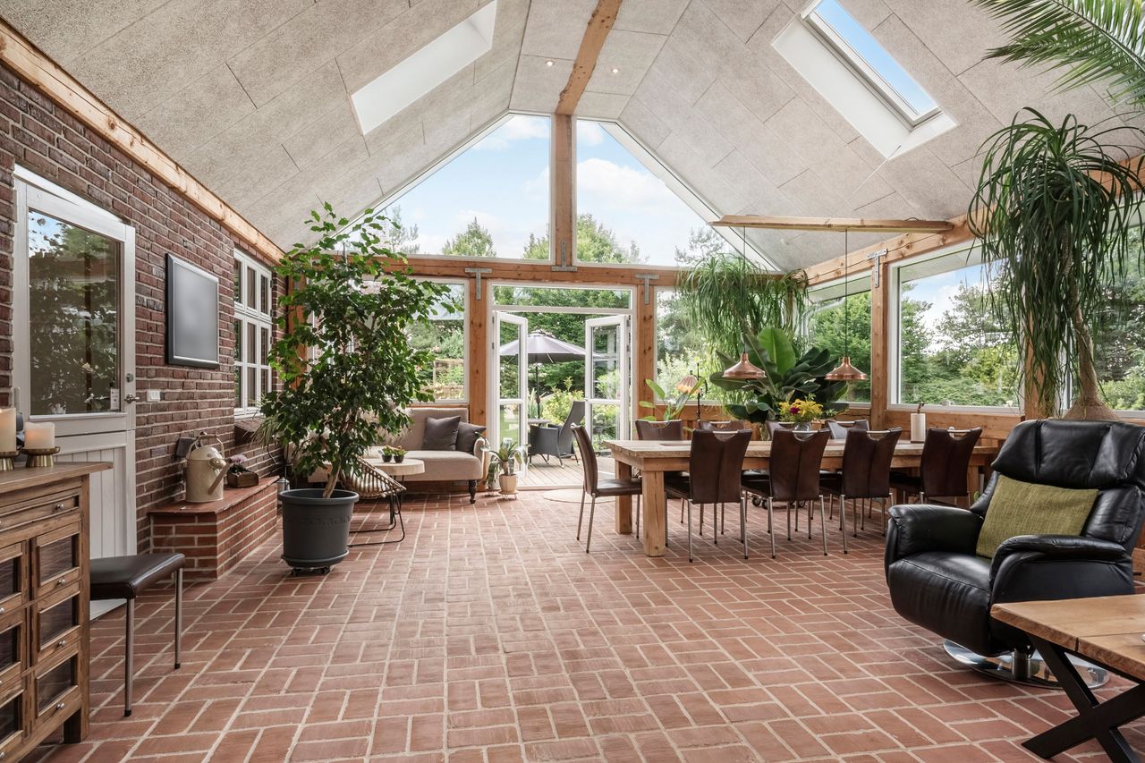 Entreén byder dig velkommen og åbner op til den ene af husets stuer der ligger i forbindelse med køkkene/alruummet og husets anden stue med indbygget pejs, perfekt sted til at samle familien. Fra køkkenet fører gangen videre til husets ene badeværelse der er indrettet mørkt møbelarrangement og med dobbelt bruseniche. Fra gangen har man adgang til en skøn udestue med store vinduer og ovenlys vinduer, hvilket skaber et fantastisk lys. I udestuen er der plads til både stort spisebord og sofaarrangement. Fra udestuen kan man åbne op til et af ejendommens terrasser hvor aftensolen kan nydes.