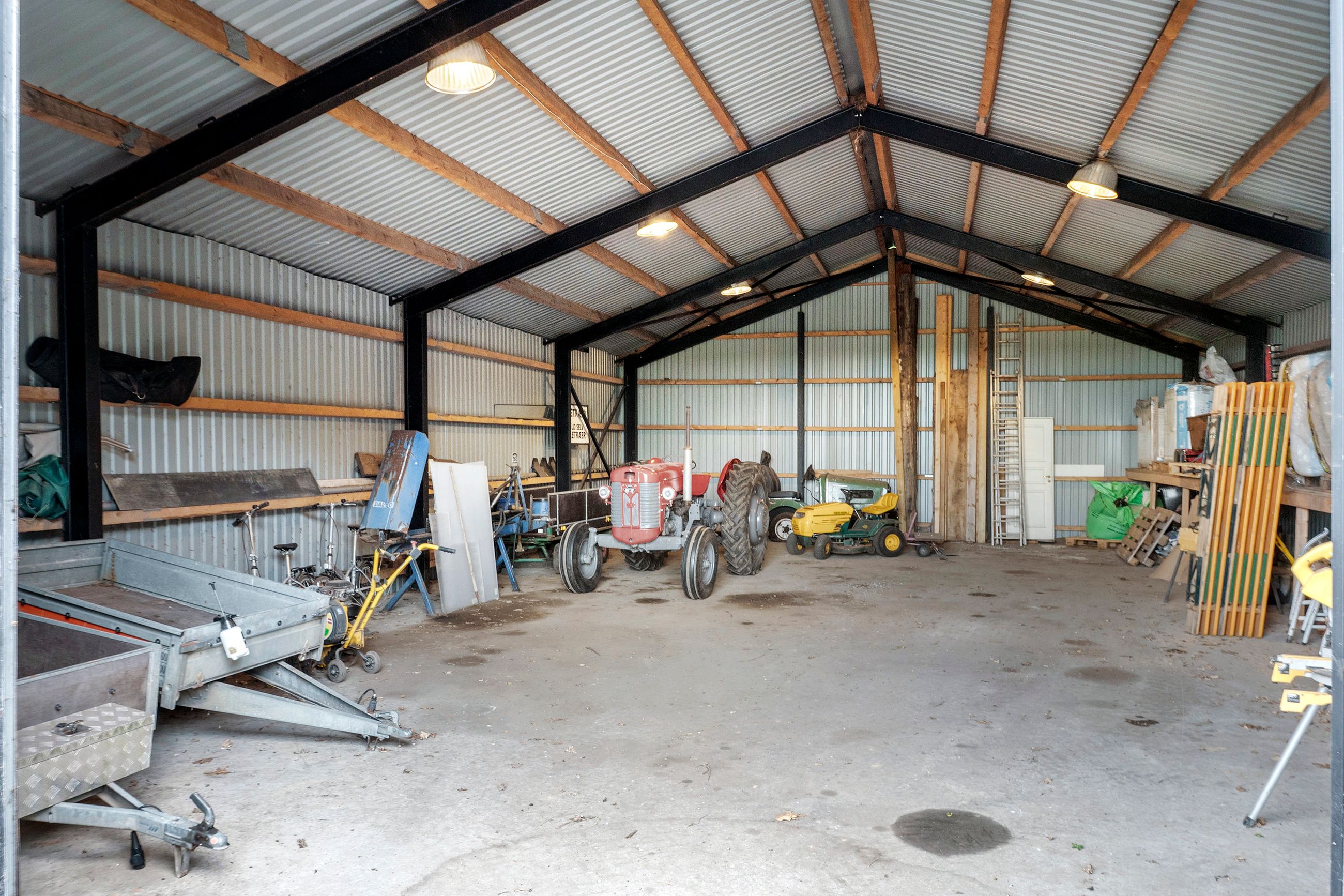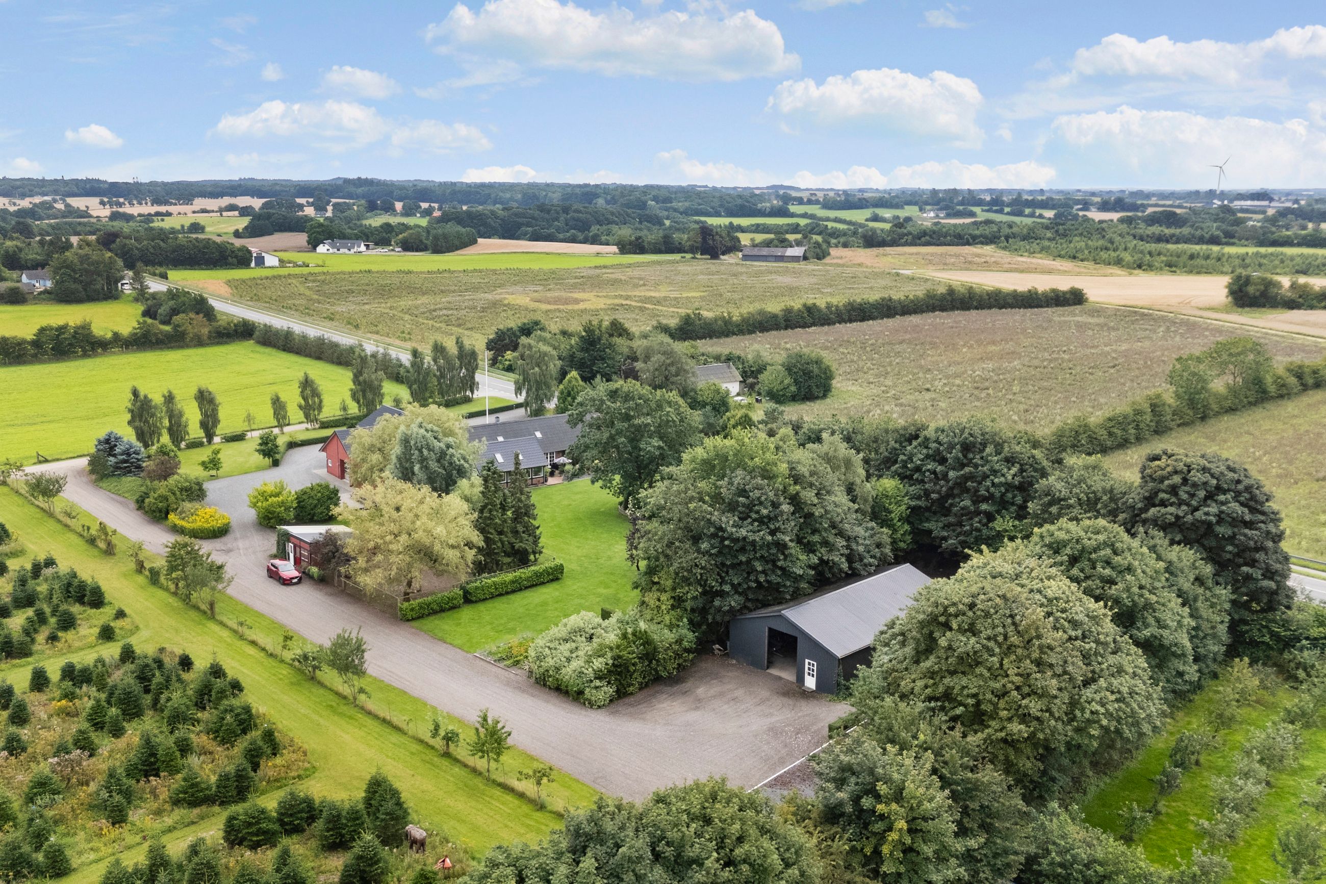 Grundarealet på 5 ha byder på parklignende have med shelter, skov og marker. Foruden de gode udhusbygninger med blandt andet lift og værksted, gør det muligt at udleve alt fra dyrehold og værkstedsdrømme til kreative eller praktiske projekter.