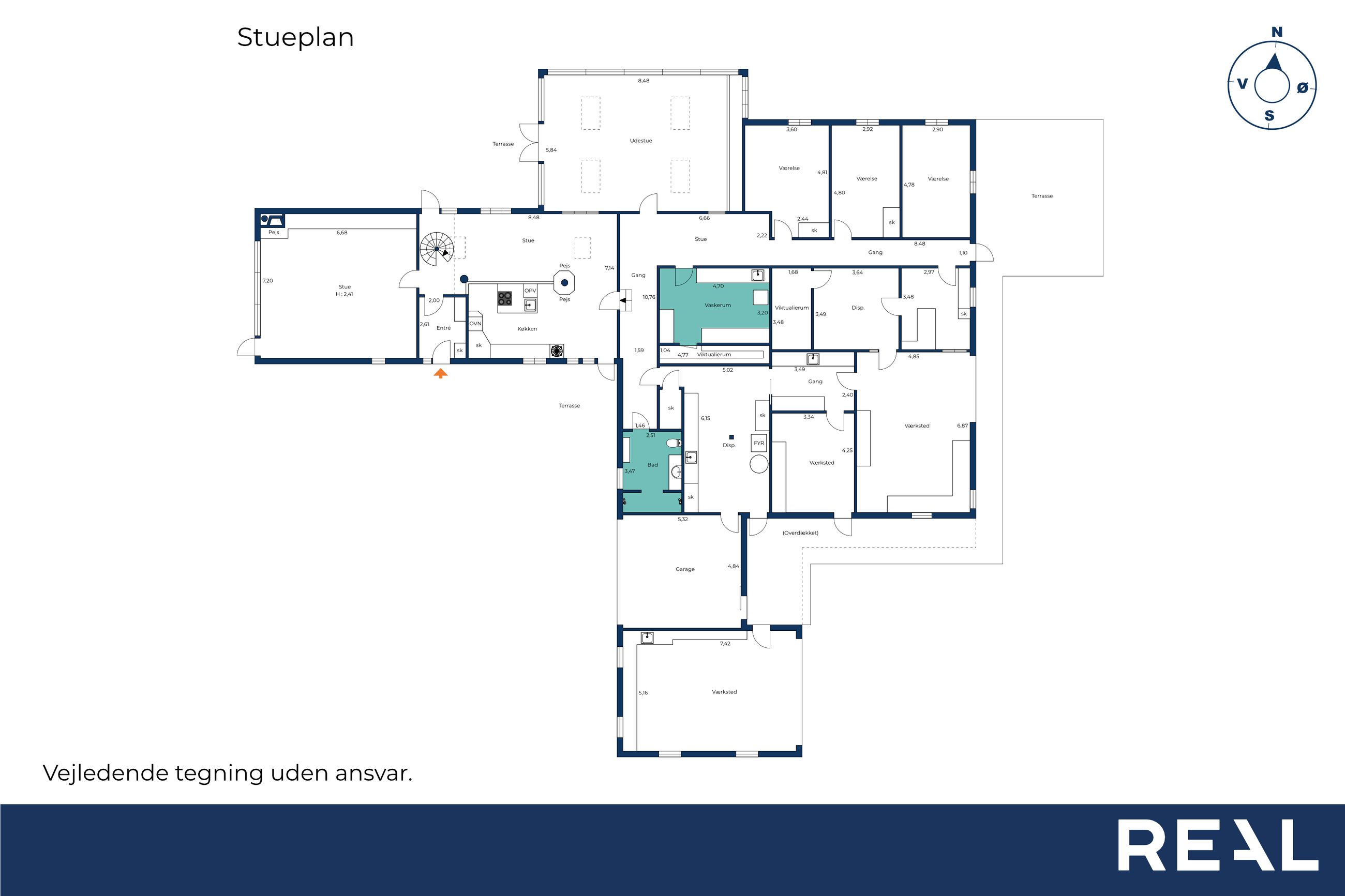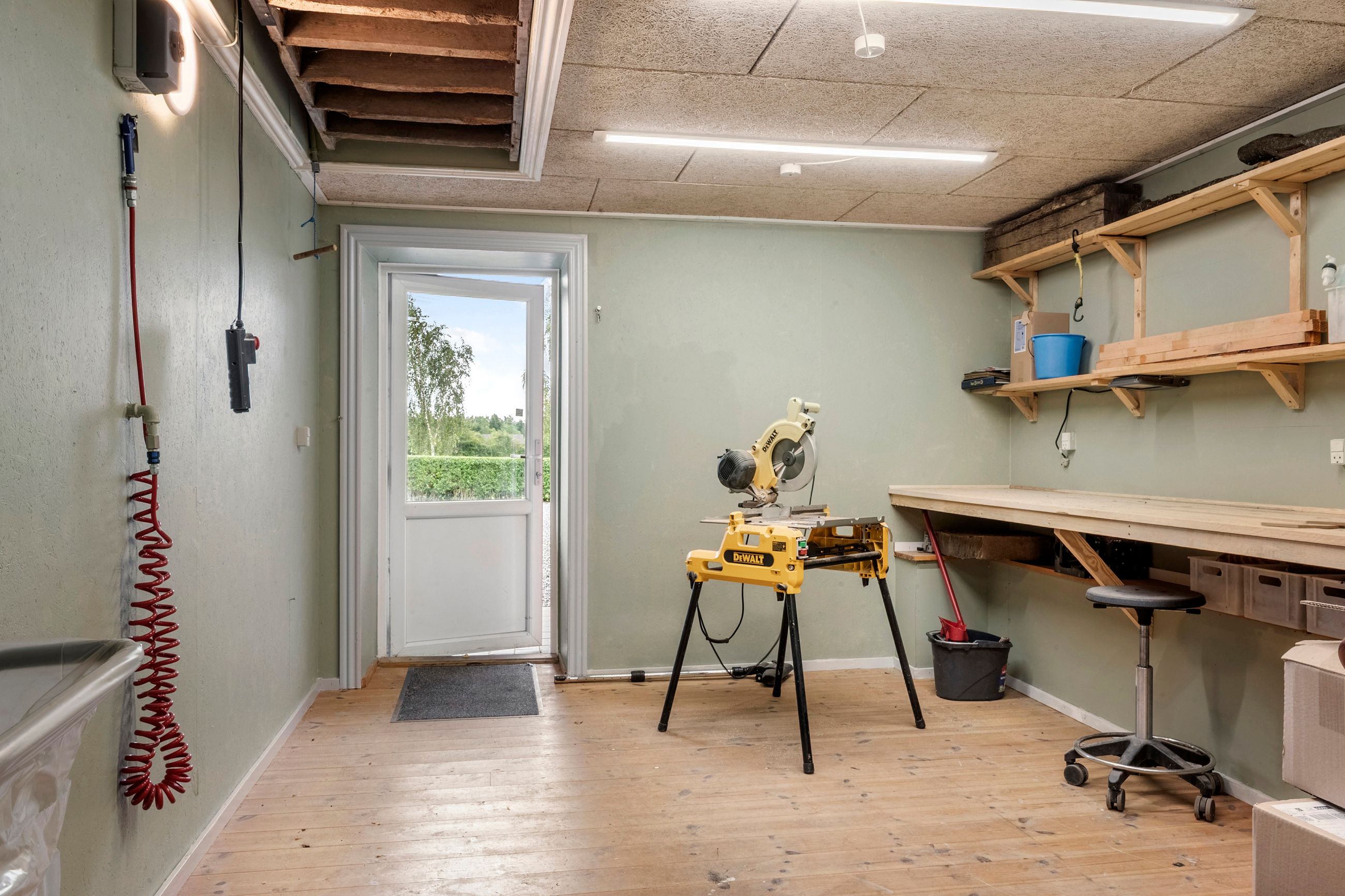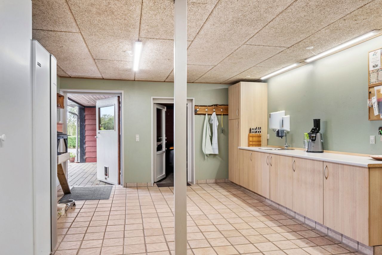Tilbage i husets stueplan findes den gamle staldbygning som i dag indeholder tre store disp rum., vaskerum med vask og masser af skabsplads og adgang til et af husets viktualierum. 3 disponible rum (som er ansøgt om at blive godkendt til bolig), viktualierum og hele tre værksteder.
