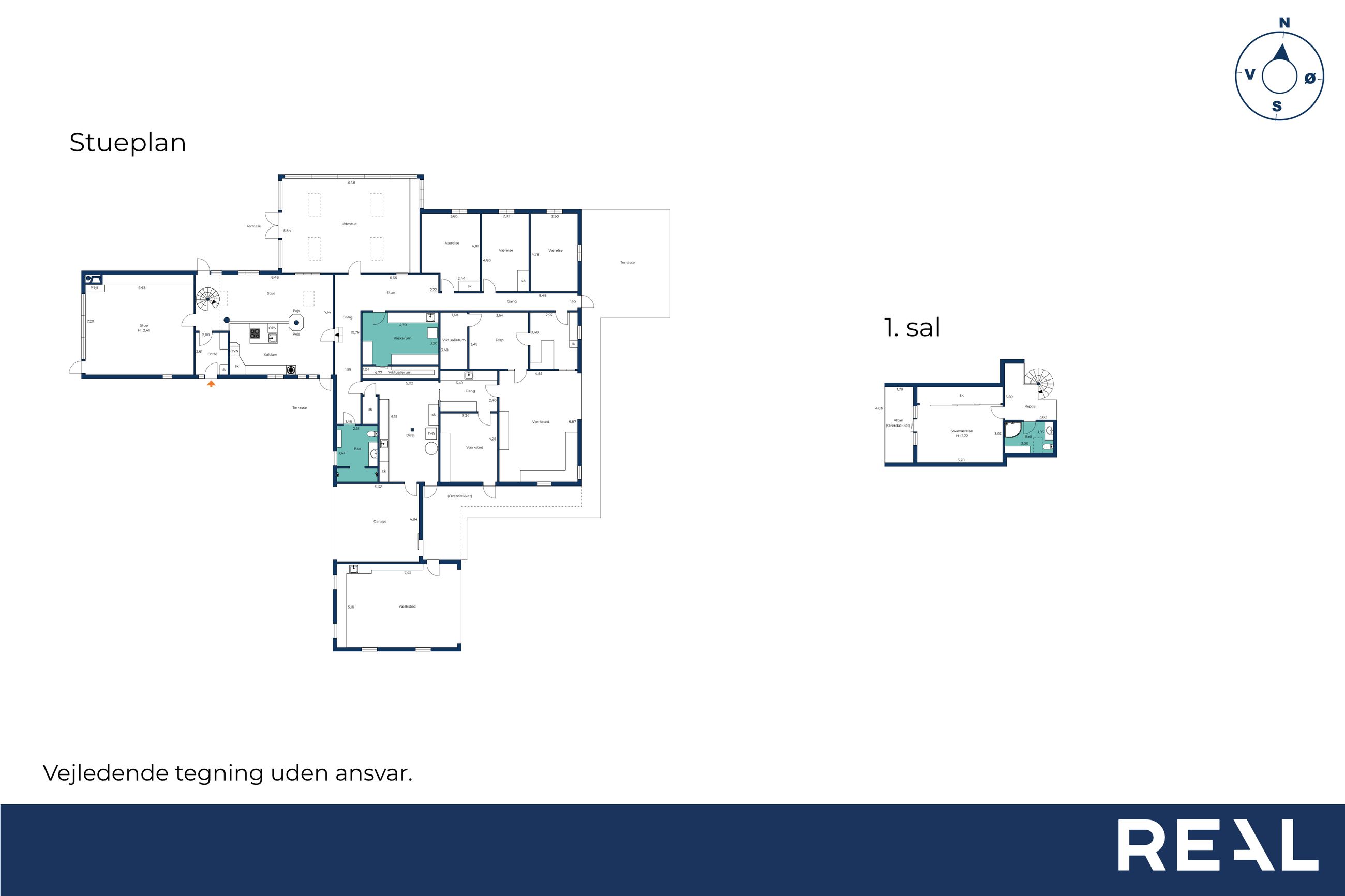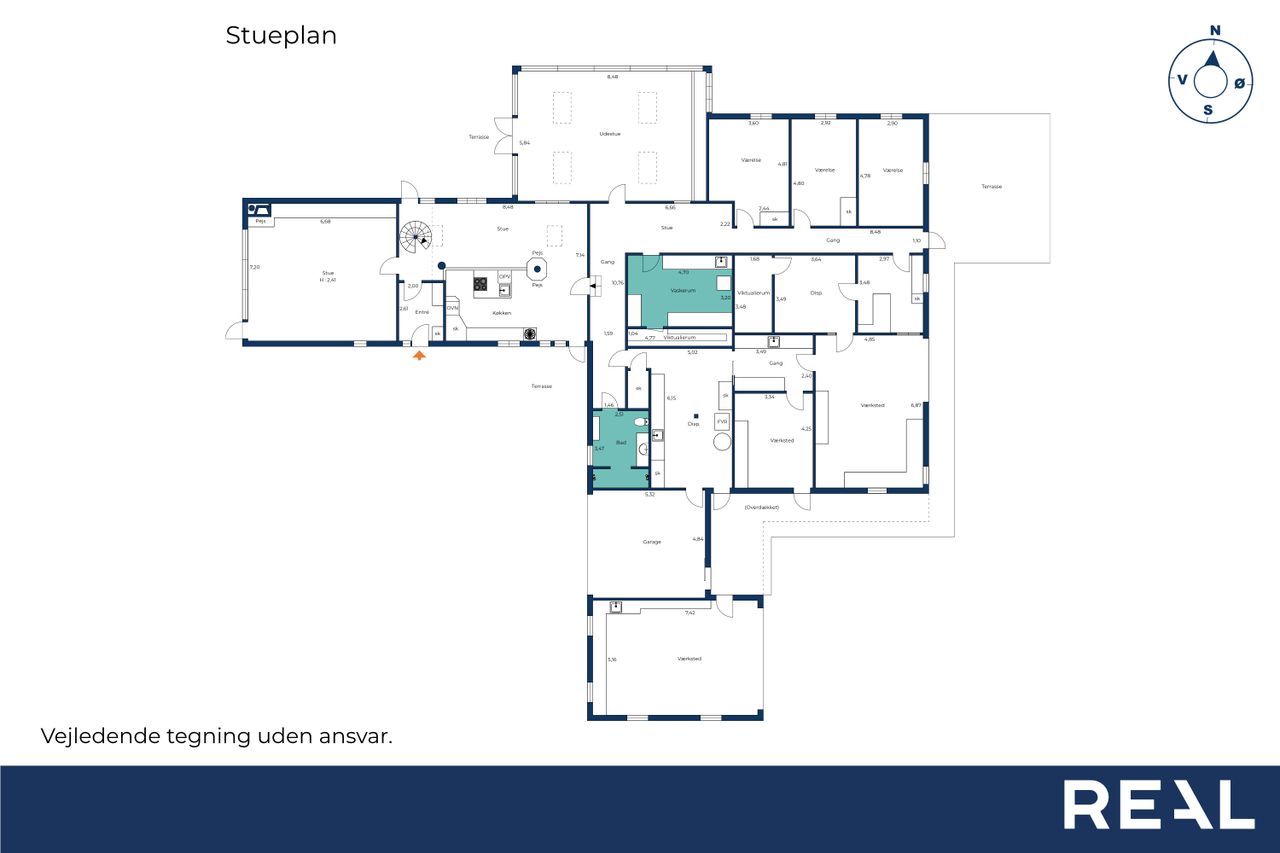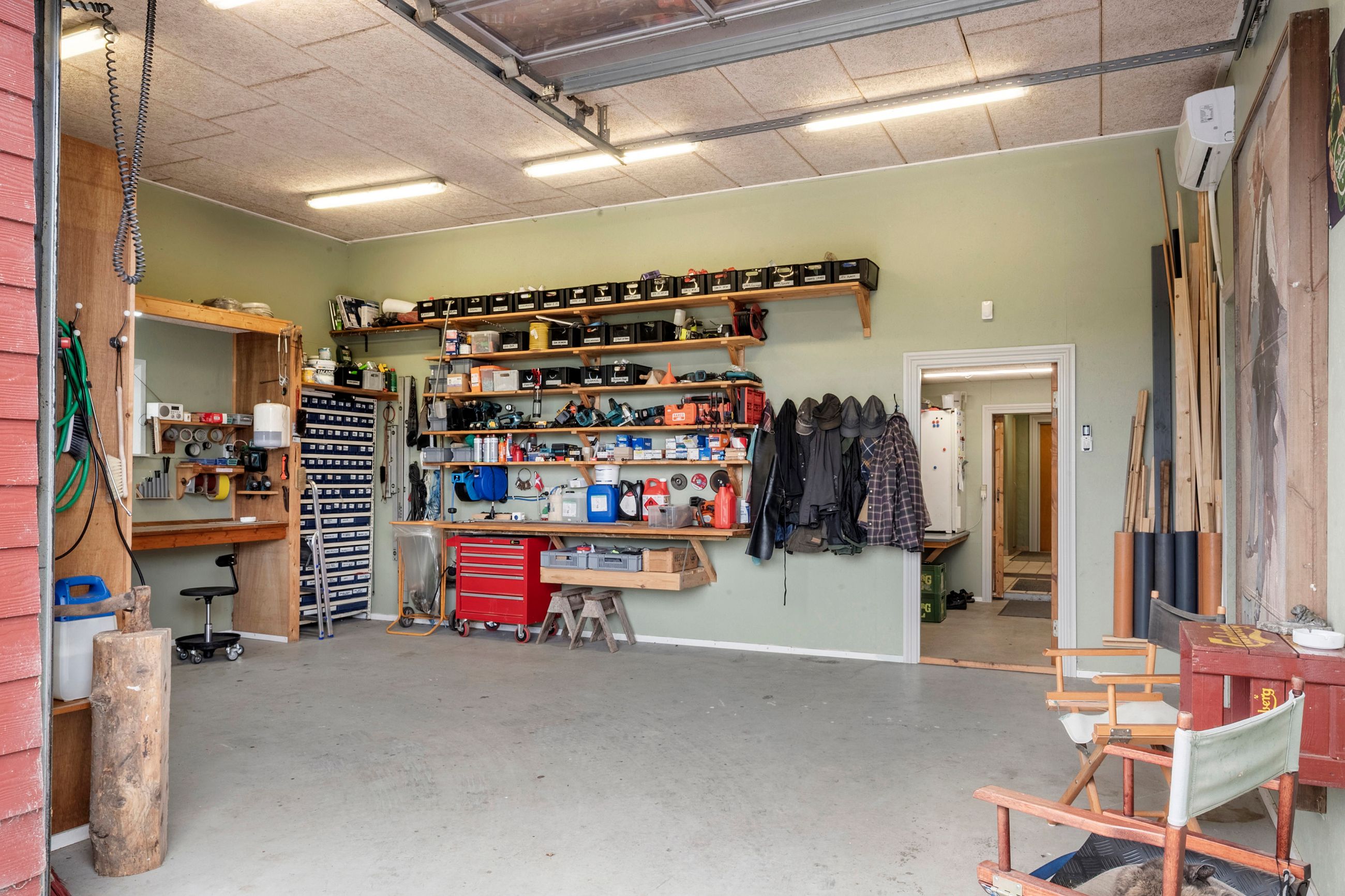 Tilbage i husets stueplan findes den gamle staldbygning som i dag indeholder tre store disp rum., vaskerum med vask og masser af skabsplads og adgang til et af husets viktualierum. 3 disponible rum (som er ansøgt om at blive godkendt til bolig), viktualierum og hele tre værksteder.